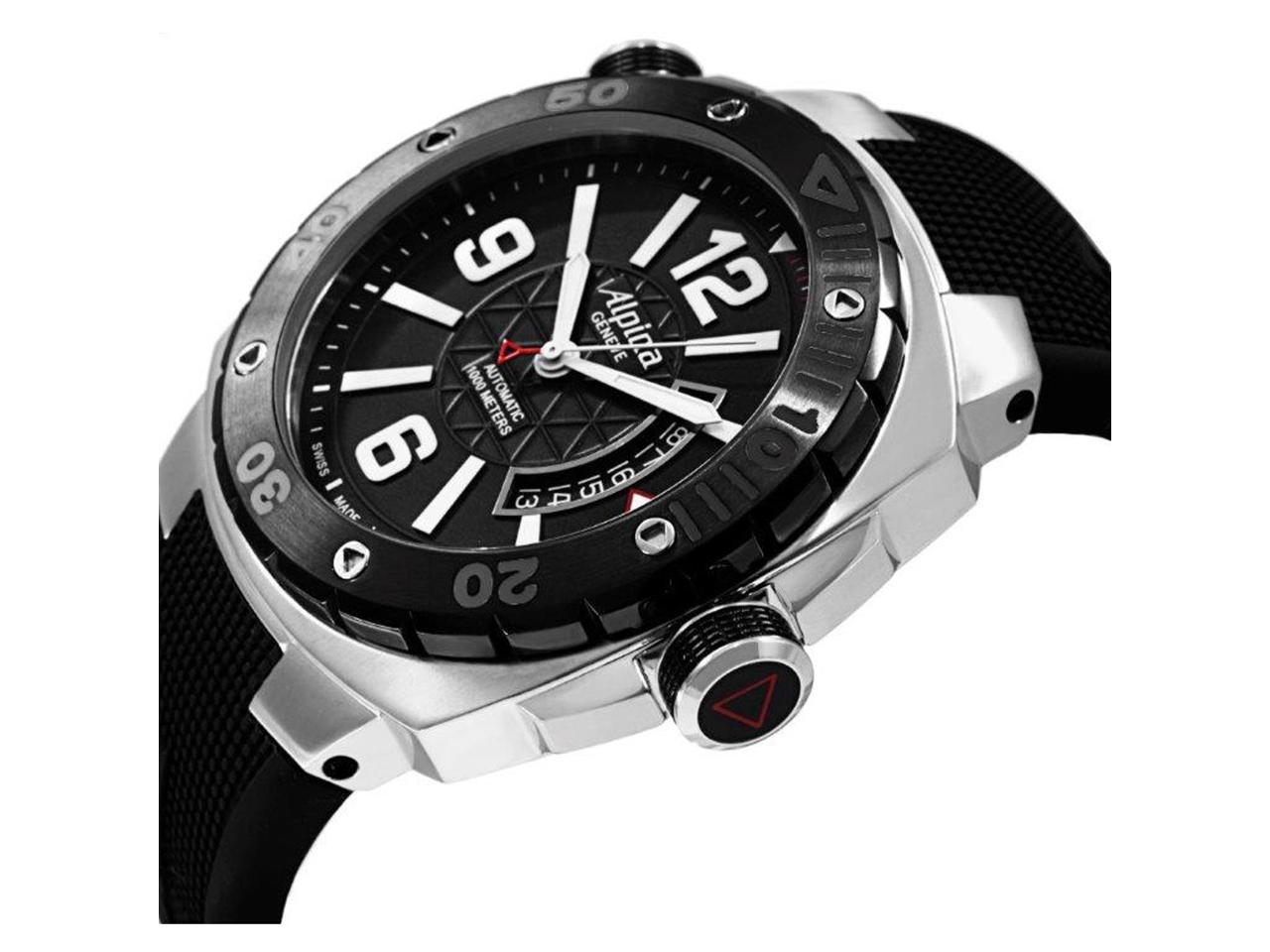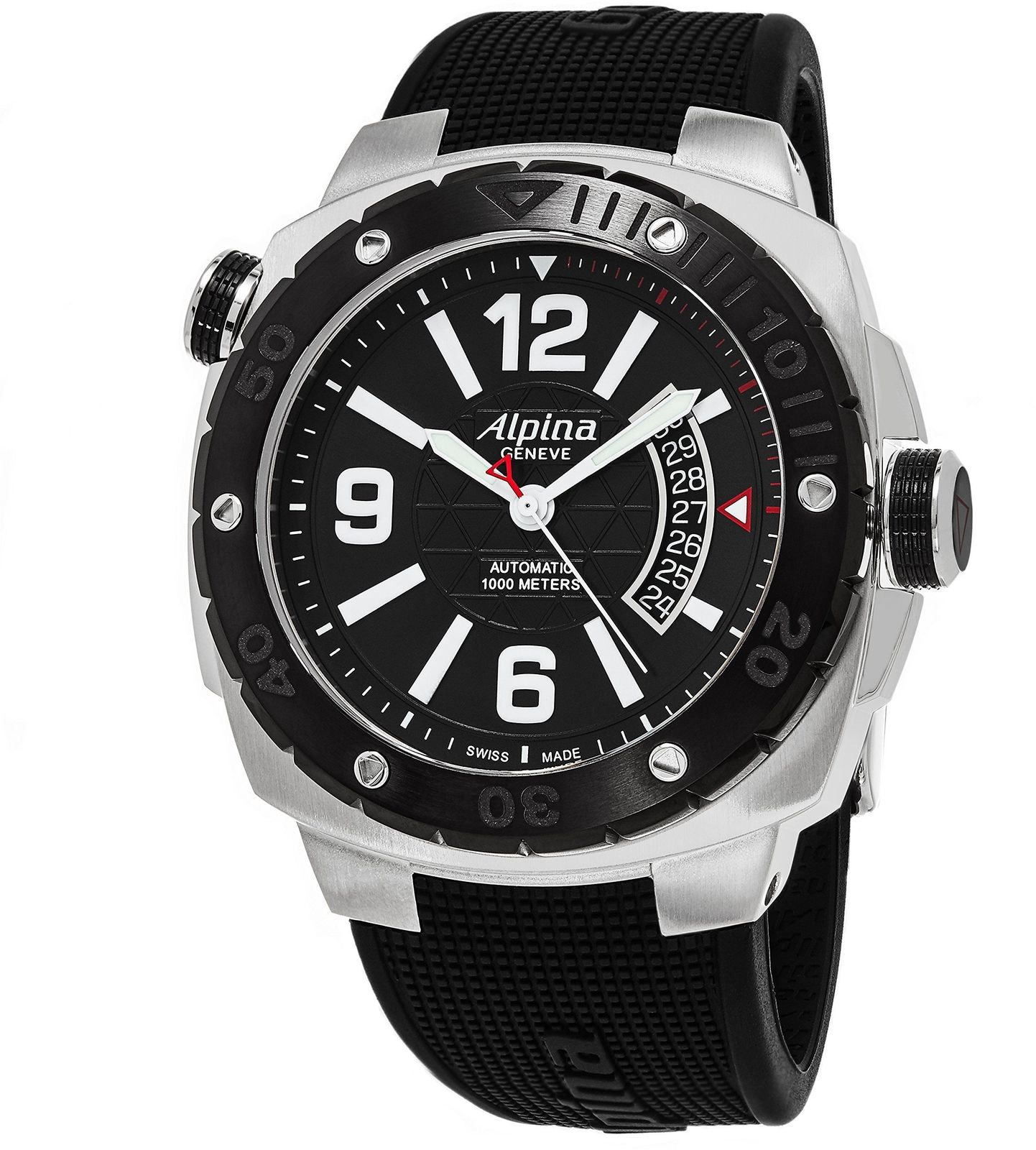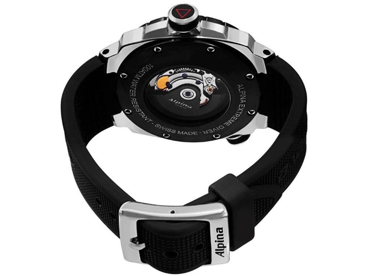 Since 1938 Alpina produces water-resistant watches. Almost one century ago an innovative patent on the crown already guaranteed water-resistance to Alpina watches. In 1969 the "Alpina 10" Seastrong diving watches reached 200m (600ft) water-resistance. Today, all the professional diving watches from the Alpina Extreme Diver Collection are water-resistant to a minimum of 300m (1000ft). All Alpina Extreme Diver watches including this Alpina Extreme Diver 1000 Meters are ISO 6425 certified. Great watch with excellent fit and finish. The back is screw down and has a sapphire crystal to allow the modified movement to be viewed. Watch Description Brushed and polished stainless steel case (45 mm in diameter, 15 mm thick), See-through screw-down case-back, Black PVD coated unidirectional rotating bezel, Black dial with designed center, White luminescent hands, indices and Arabic numerals, Wide date window at the 3 o'clock position, Screw-down crown, Scratch resistant sapphire crystal, Swiss automatic movement, Incabloc antishock system, Caliber AL-525, Power reserve of 42 hours, Water resistant to 100 ATM/1000 meters/3280 feet, Black rubber strap, Pin buckle, Model number: AL-525LBB5AEVZFB6.- Brushed and polished stainless steel case (45 mm in diameter, 15 mm thick), See-through screw-down case-back, Black PVD coated unidirectional rotating bezel