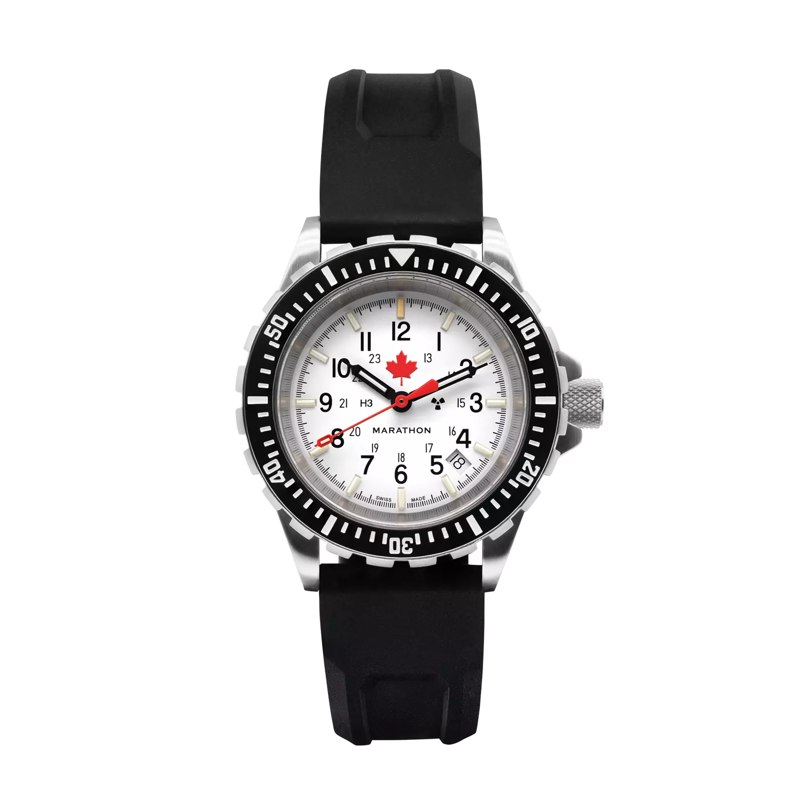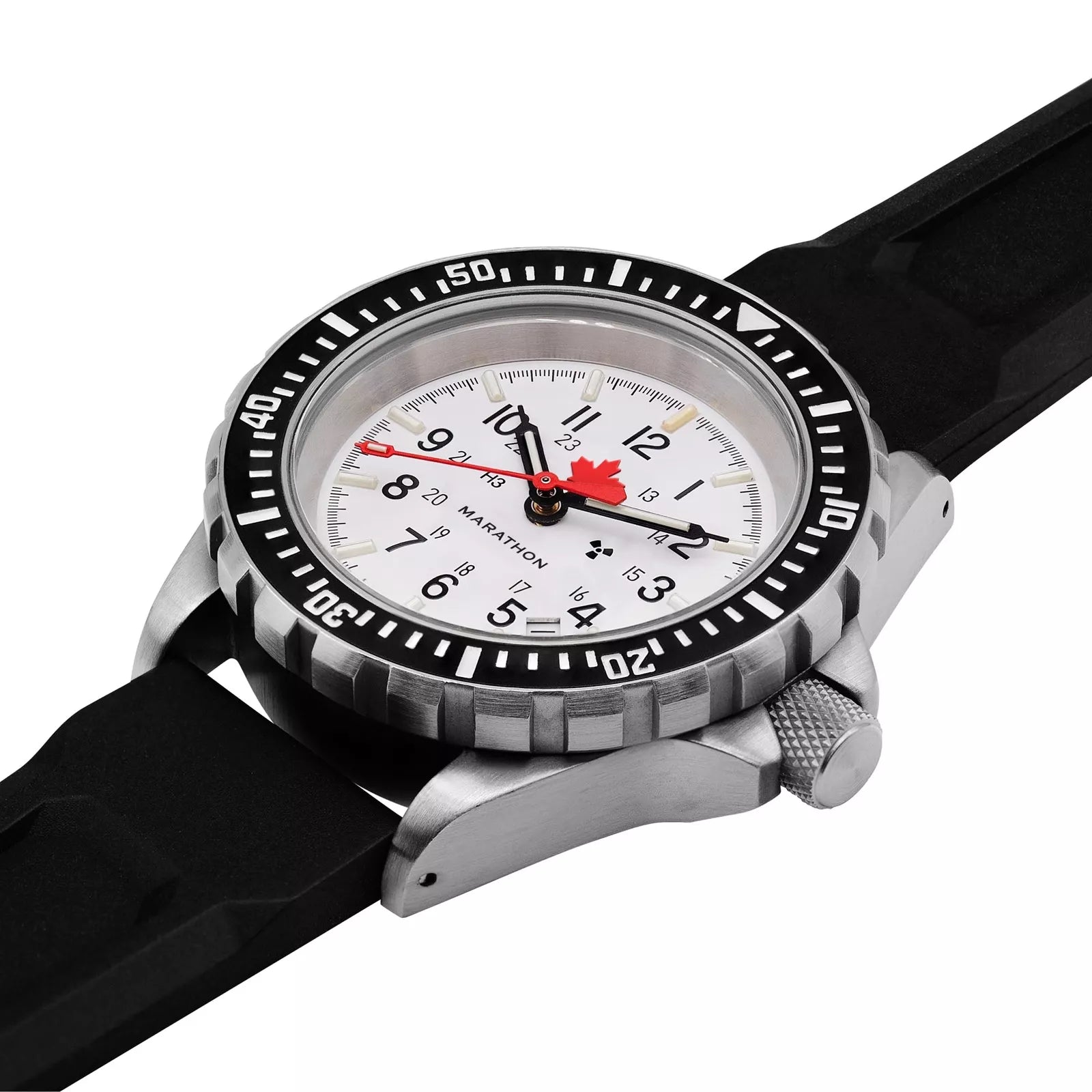 New, Limited production SOLD OUT - only 157 pieces made. The 41mm ADANAC Arctic Red Maple GSAR commemorates Canada’s 157th anniversary. With a stark white dial adorned with a striking Red Maple Leaf appliqué, this exclusive edition honors Canada's rich military heritage. Each watch bears a unique serial number and is engraved with Marathon's historic ADANAC branding— embodying Canadian pride and resilience. During Marathon's history supplying Allied Forces, select government contracts included rigid restrictions that prohibited branding on timepieces. In a nod to our own heritage and to ensure wearers knew that their trusted timepiece was born right here in the North, Marathon included the word "ADANAC" on the dial of these watches— Canada spelled backward. Models featuring the unique ADANAC marking are exceptionally rare and are known now as coveted collector's items.  SOLD OUT!
