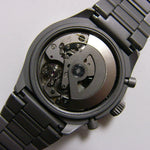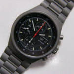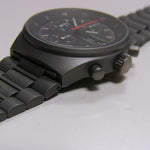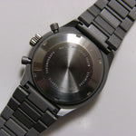 The Bernhard Lederer Chronograph is an early watch produced by the renowned Swiss master watchmaker Bernhard Lederer in collaboration with Heuer and Tourneau during the late 80s to celebrate the motorsports era of watches produced by Orfina, Porsche design and LeJour.  Very nice near mint condition preowned piece from a private collection that was recently serviced and finely regulated. Has been field-tested, is running strong and operating properly. Brand: Lederer Model: Motorsports Chronograph. Material: 316L stainless steel which has been Parkerized to a non-reflective grey color. Crystal: Flat sapphire crystal. Case back: Solid caseback. Crown: Coin edge crown. Function: Time and day, date chronograph with 12 hour internal bezel. Dial: Original index dial with sunken sub-dials applied with Luminova. Matte white framed handset with orange center sweep second hand. Movement: Swiss Made - Valjoux 7750 – 28,000 a/h – Automatic wind nickel-plated Incabloc shock-resistant movement. Quickset day and date function. Running seconds at 9 o'clock, 12 hour counter at 6 pm and 30 minute counter at 12 o'clock. Sweep chronograph center second hand and hack set feature. Sweep chronograph center second hand and hack set feature with black day and date disc. Bezel Size: 41mm. Case Size: 42mm. WR: 10 ATM. Bracelet: 22mm fitted link bracelet large enough for an 8-inch wrist with a micro-adjustable deployant buckle. The Bernhard Lederer Chronograph is a really nice example of chronograph from late 1970s early 1980s motor sport era!