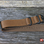 Brown LUM-TEC NATO style military strap with bead blasted hardware in black pvd finish. These are the softest suede quality leather straps on the market and are a direct OEM replacement for the LUM-TEC nylon military straps. Designed to fit any watch with same lug width.