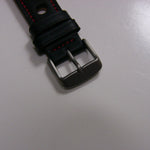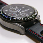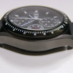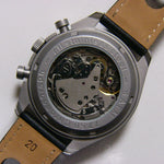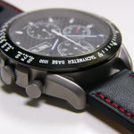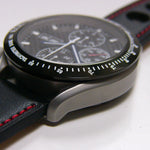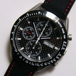 This W3 7760 Racing Chronograph watch was designed and executed by my friend Chris Pappas of Wilson Watch Works in Wilson, NC. The watch was conceived and created using a chronograph case made for a Valjoux 7750 chronograph and modifying it for a desirable Elaboré Grade Valjoux 7760 chronograph. Chris took the design-build further with a double bead blast and the installation of a special carbon fiber dial. The watch was originally purchased by a collector and pilot in North Carolina who traded it in on an Aviation CSAR Marathon chronograph watch. Even though the watch had not been worn, Chris inspected it and applied his Certified Pre-owned inspection regimen to it. He decided to further enhance it by adding a sapphire display back which really does make this a special custom timepiece. Case: Made In Germany - 42mm 316L Custom 2 stage beadblasted finish with ceramic tachymeter bezel, Swiss made sapphire crystal, coin edge crown, threaded exhibition caseback with sapphire crystal. Lug to lug 48.35mm. Height 16.75mm. 20mm lug width. Water Resistant rating 50 meters. Dial: Made In Germany - Carbon fiber dial applied with C1 Superluminova. Hand set: Blued hands applied with C1 Superluminova. Movement: Swiss Made – ETA 7760 Elaboré Grade – 28,000 a/h – Manual wind 17 jewel nickel plated Incabloc shock resistant movement. Quickset day and date function. Running seconds at 9 o'clock, 12 hour counter at 6 pm and 30 minute counter at 12 o'clock. Sweep chronograph center second hand and hack set feature. Strap: 20mm/18mm premium calf leather rally strap with red stitching and beadblasted stainless steel buckle. You can obtain this watch for a fraction of the original cost and below the actual build cost to make an identical watch. Remember though that this is a custom piece and there is not another of these out there. It is that special!Custom made W3 7760 Racing Chronograph