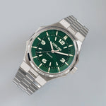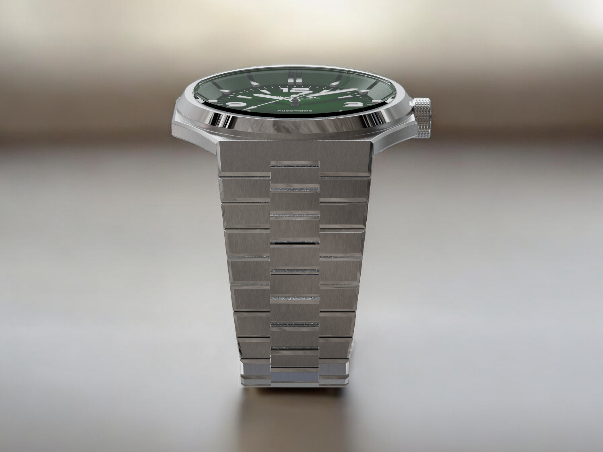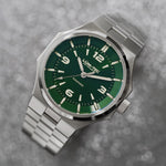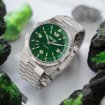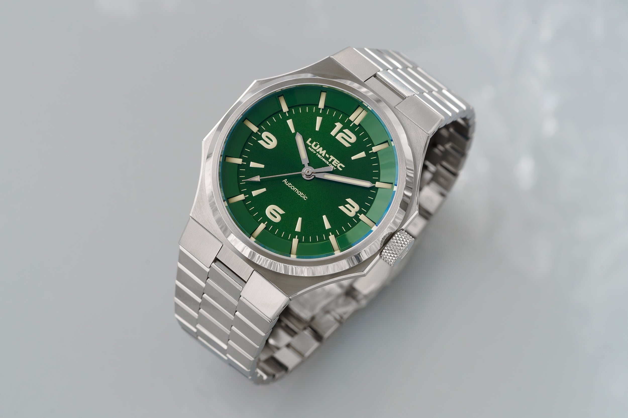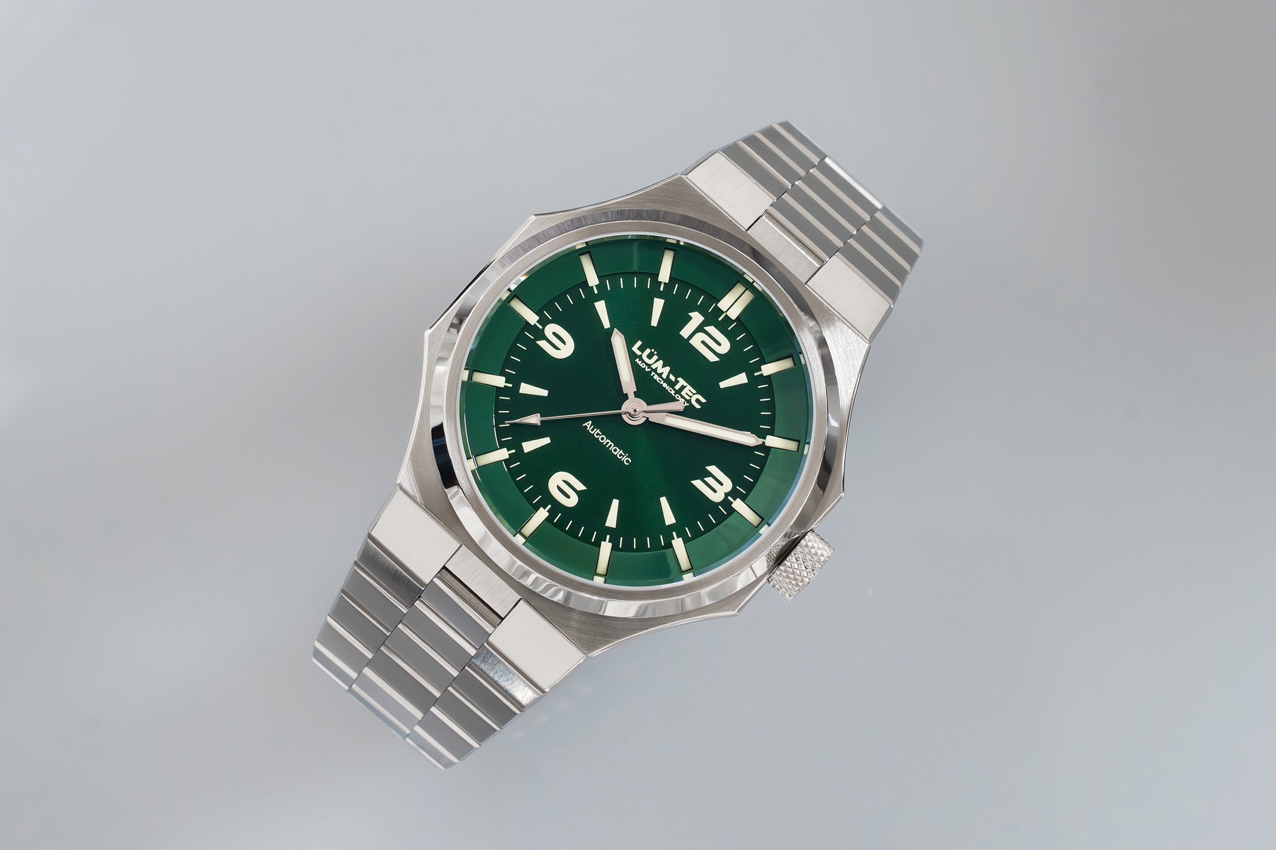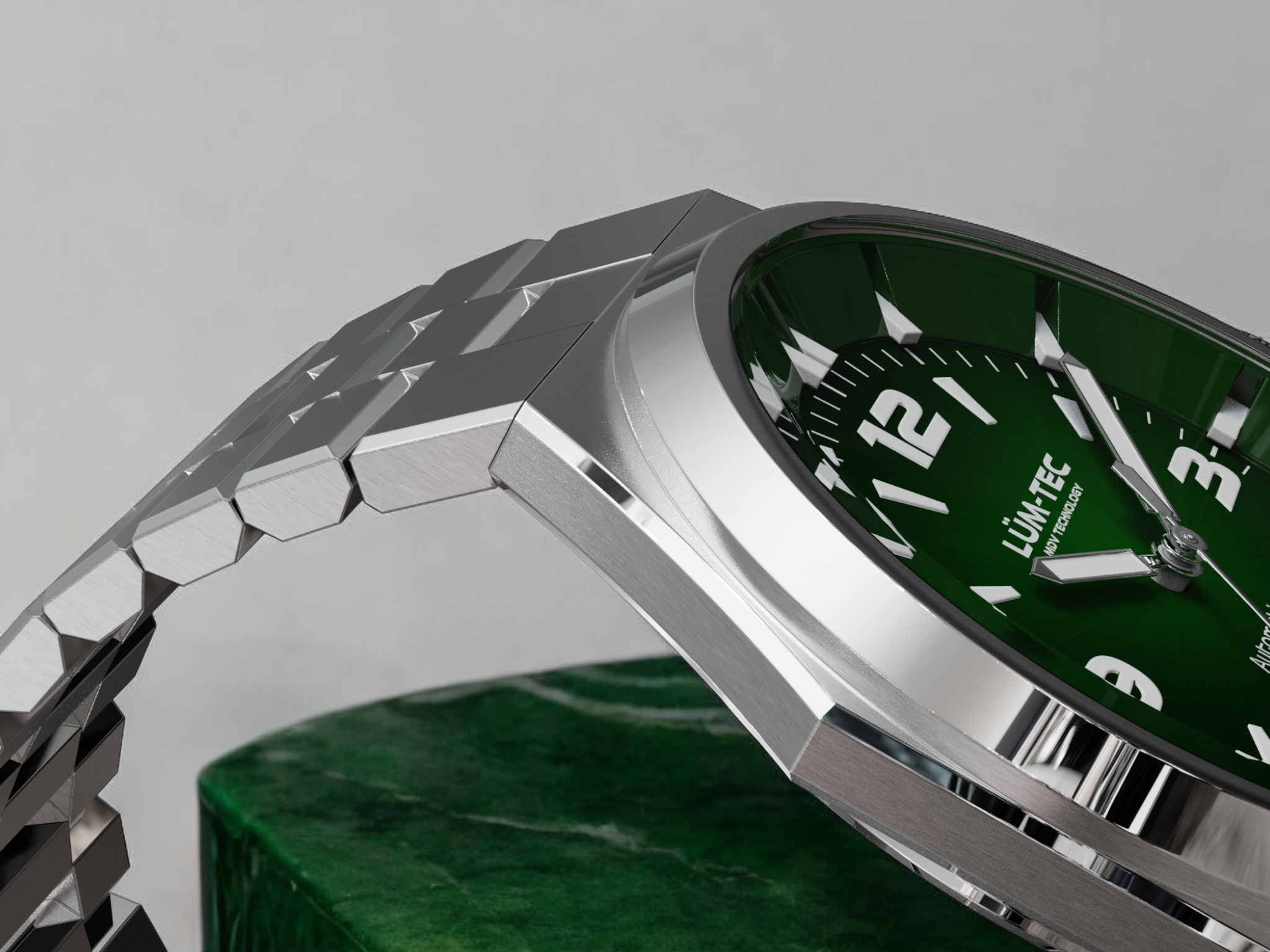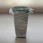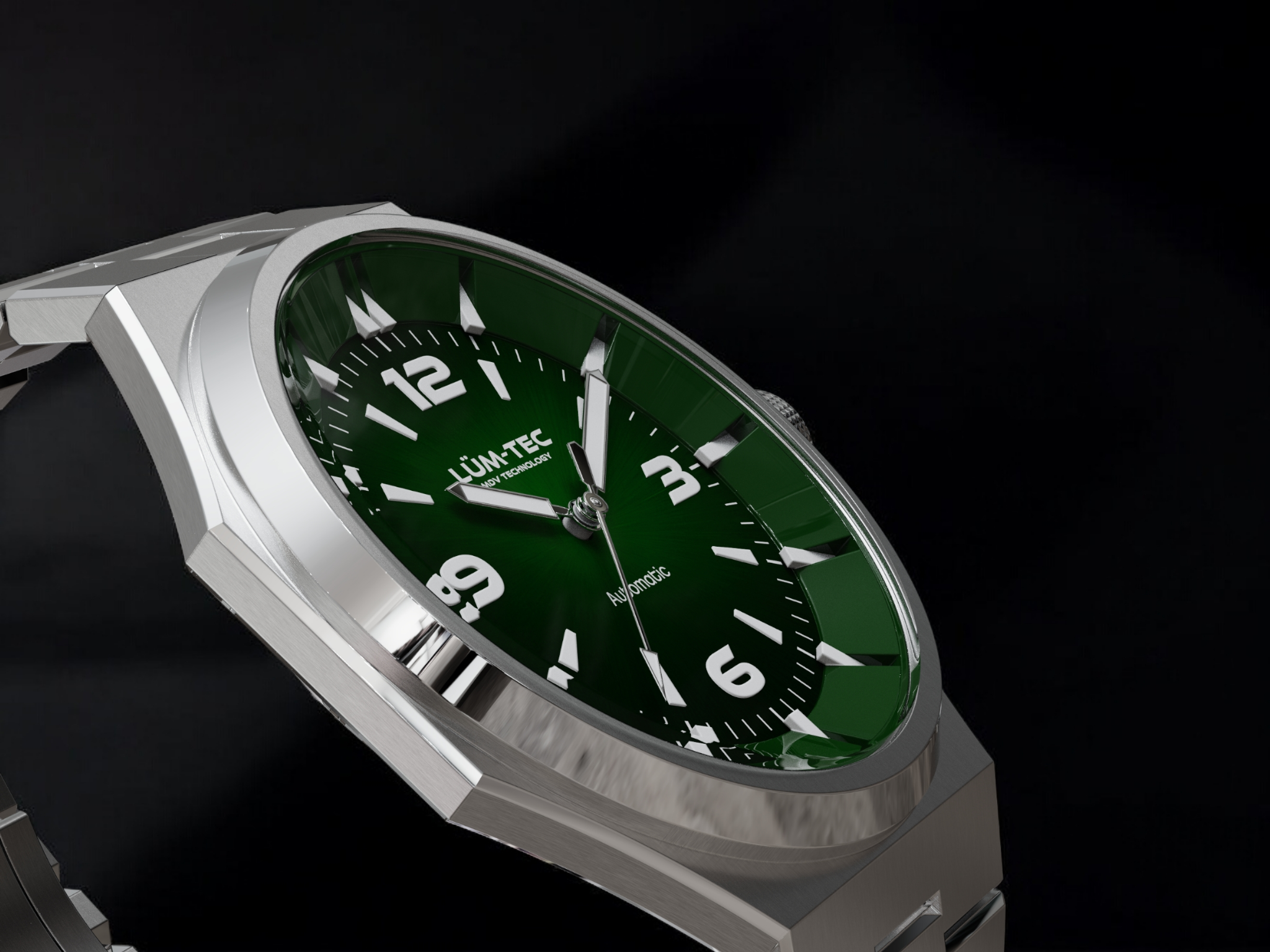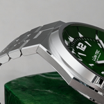 - Bi-layer green sunburst 3D dial with extruded luminous index