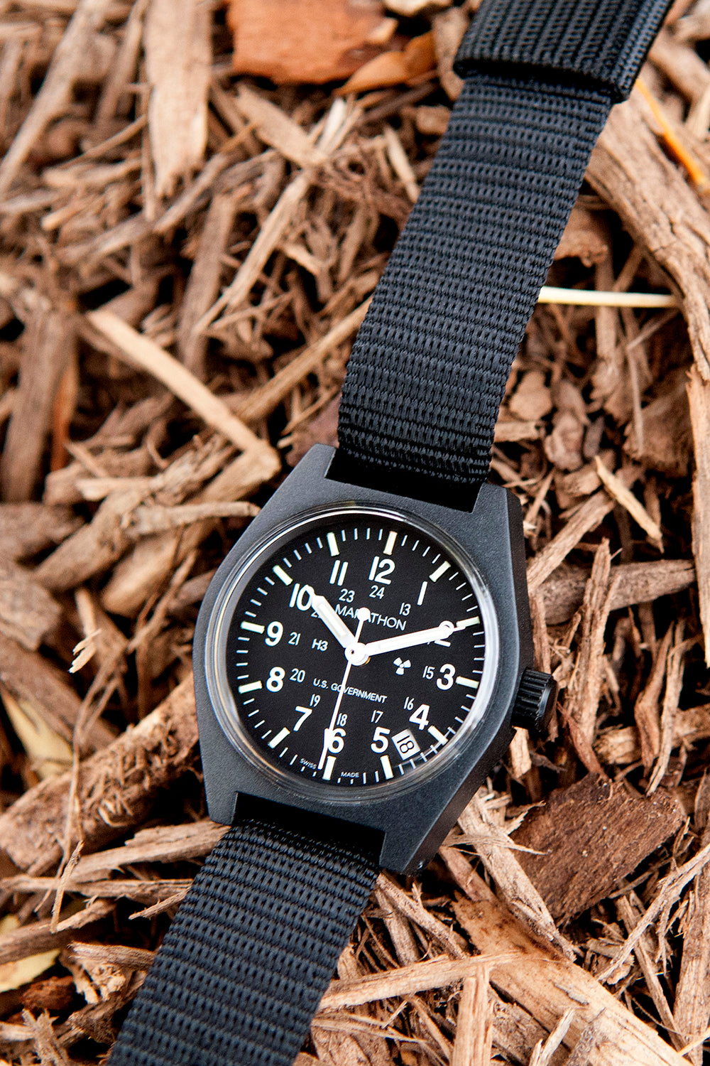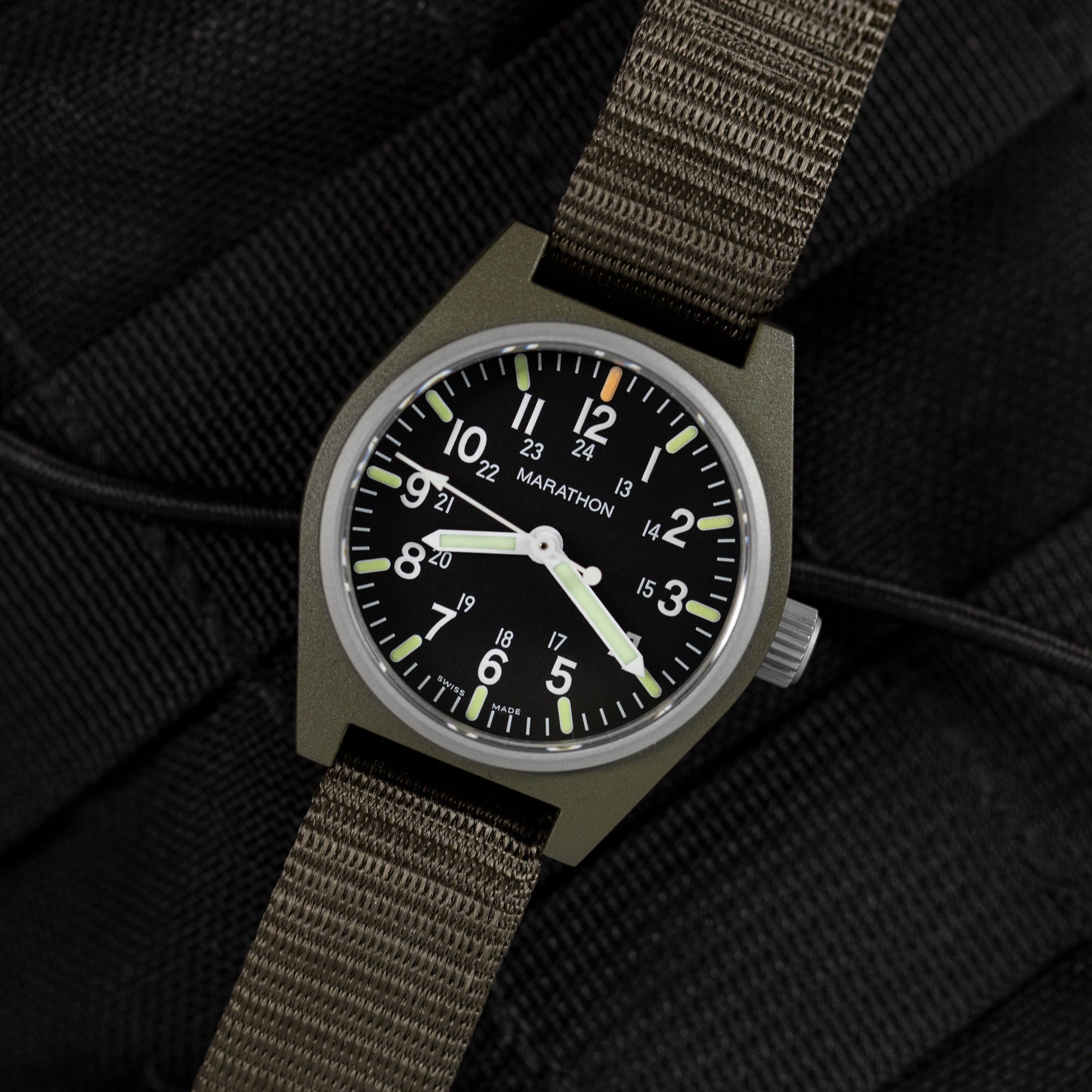 Developed by Marathon Watch Company as a field watch to be issued to military personnel, the General Purpose Quartz is a watch that meets all the requirements of a true military field watch. Made from a highly durable, impact resistant fibershell case that is water resistant to 3 atmospheres (30 meters – 100 feet), sweat resistant and will not yield to the elements.
