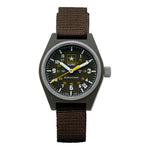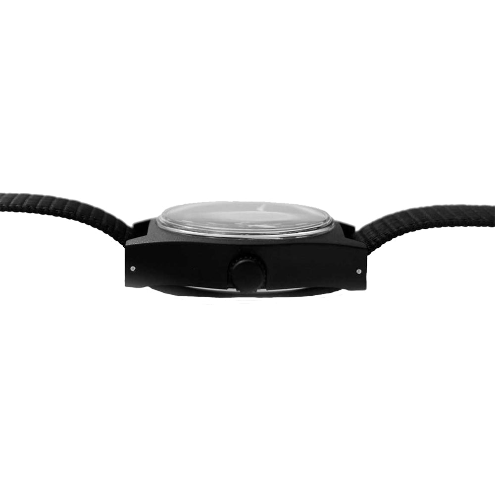 The General Purpose Quartz with Data and Tritium is made in La Chaux de Fonds Switzerland to guarantee the highest level of quality and accuracy in manufacturing. Powered by a Swiss made, high torque, 3 jewel ETA F06 Quartz movement, the General Purpose Quartz guarantees you a high degree of accuracy in timekeeping. The ETA F06 is accurate to -0.3/+0.5 seconds per day and also includes an End of Life (EOL) indicator that will advance the seconds hand once every 4 seconds to inform you that a battery change is needed. The General Purpose Quartz uses self contained Tritium gas tubes to ensure constant visibility in low light situations, a gas tube is placed on each hour marker and hand. Tritium tubes are self illuminating gas tubes which contain an isotope of hydrogen, meaning they will not dull down in brightness like normal photoluminescent paint which requires an external light source to create a glow.