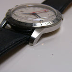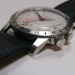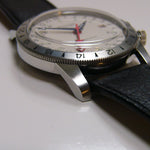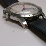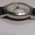 Description: Like new Glycine Airman GL0164 - Limited Edition reissue. We purchased this watch new for review and careful testing. All seals and gaskets have been checked, set and lubed with Silicone DC7 waterproof grease. The watch has been finely regulated, field tested and is operating properly. Brand: Glycine Model Number: GL0164 Model: Airman No. 1 GMT Limited Edition. Material: Polished stainless steel with brushed horizontal surfaces. Crystal: Domed acrylic crystal. Case back: Threaded solid caseback. Function: Time, 2nd time zone, date, center sweep seconds. Dial: Original ivory dial. Hand Set: Blued steel hand set with red arrow GMT hand and sweeping airplane wing red second hand. Original hand set is also included. Movement: Swiss Glycine Calibre GL293. Finely regulated for accuracy. Case Size: 40mm. Condition: Near mint. Straps: 22mm Glycine OEM soft calf strap with OEM brushed buckle. WR: 1 ATM Box and Papers: Original issue wooden box set with sliding top, hang tag and papers.