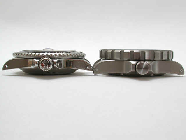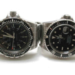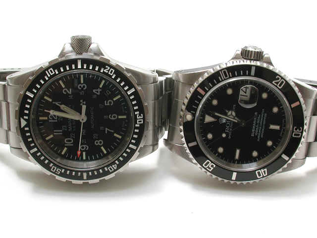 This newest version of the GSAR was improved over previous versions: it features the aforementioned natural rubber strap, an ETA 2824-A2 engraved with Marathon Watch Co. and an improved 120 click uni-directional rotating bezel. Check out the photos of this watch next to a Rolex rolsar1large.jpg (28306 bytes)Submariner for size comparison (Rolex Sub. not included). There are an extremely limited number of this version available.