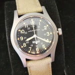 The watch is the exact same size, has the same dial, and beadblasted or parkerized case as the original military issue watches from the Viet Nam era through the early 1990s. The case measures 34x42mm as it did in those bygone days. Hamilton kept all the best parts of its 46374s, like the 12 and 24-hour dial and bead-blasted non-reflective case markers, and added new ones to the Hamilton Khaki Field Watch, such as the upgraded Swiss 17 jewel mechanical movement, hacking capability, and non-fixed spring bars. Since the watch was first worn, it has been an information tool, giving its wearer some piece of intelligence otherwise not known. Perhaps nowhere is that truer or better realized than in the military watch. Almost as long as watches have existed, governments and the military have been buying and issuing timepieces to be used in nearly every military scenario imaginable. The Hamilton 46374 was designed to U.S. Department of Defense specifications, with no fancy buttons or bezels. Just a very simple and reliable watch that does what it is specified to do – tell time on the battlefield - ie: to work well in environments not often encountered by civilian watches. This Hamilton Khaki Field Watch was originally sold in the early 2000s and comes with the original canvas strap, inner and outer boxes, original hang tag, instruction book, and warranty papers. The watch appears to be unworn or like new. Unlike modern versions, this Hamilton Khaki Field Watch has the original size and look of the ones issued during the Viet Nam war era and the 1970s through the early 1990s.