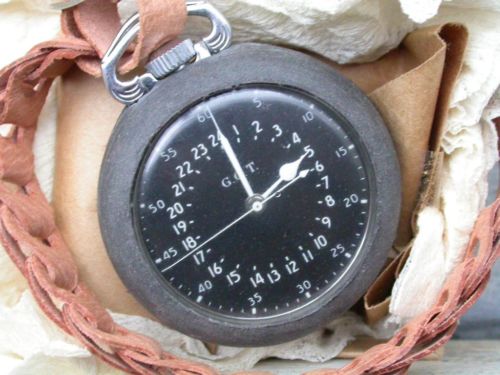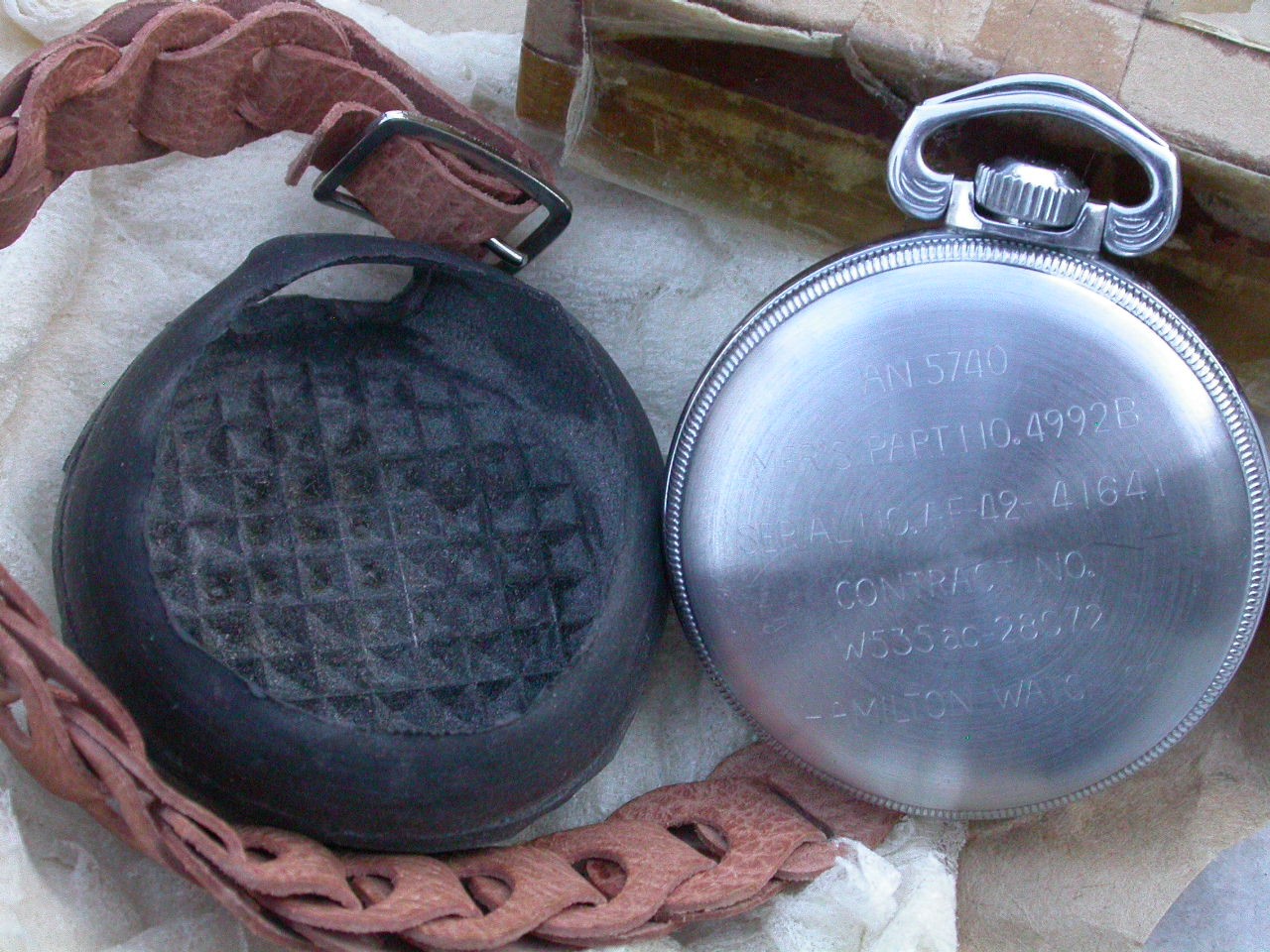 The case is absolutely new old stock.  It was designed to protect high grade pocket watches from damage during military operations.  Shocks reduce accuracy to a precision timepiece by disturbing the balance motion.  These cases and leather chain/lanyard were issued to US Army Air Corps Navigators, Army Engineers and train personnel responsible for moving supplies and material within the United States, Europe and Pacific during WWII.  These are designed specifically for the Hamilton 992B RRG, Ordinance, and 4992B Navigational Master watch, but the case will fit all 16 size pocket watches.  The rubber case absorbs shock if the watch were to come in contact with a hard object and the specially designed leather chain also absorbs energy if the watch were dropped.