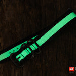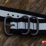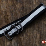 22mm black and white LÜM-TEC nylon strap with gunmetal hardware. These are the best quality nylon straps on the market and are perfect for anyone that likes maximum lume. The white stripe glows green in the dark. Check out the pics!