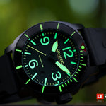 The rugged look and classic stylings of the M90 Automatic Watch aren’t just for show—this is one tough watch that can handle all the rigors of your day to day. Every single one of the 300, limited-edition M90s was carefully assembled by hand in Ohio from a bronze case powered by Swiss 26 Jewel Sellita movement, and finished with swappable military-style straps. Like all Lum-Tec watches, the M90 is built to withstand the challenges of a life lived in the field, no matter what that means to you—whether it’s thru-hiking the North Country Trail, rafting the Arkansas River, or just working away at your 9-5. No work is too tough for this Lum-tec M90 diving watch.Every LÜM-TEC watch features exclusive MDV Technology, a special 8-layer application of ultra bright glowing Super-Luminova photoluminescent material. MDV hands and dials are extremely visible in all light conditions, making this watch perfect for red-eye travelers, evening joggers, and casual divers alike.