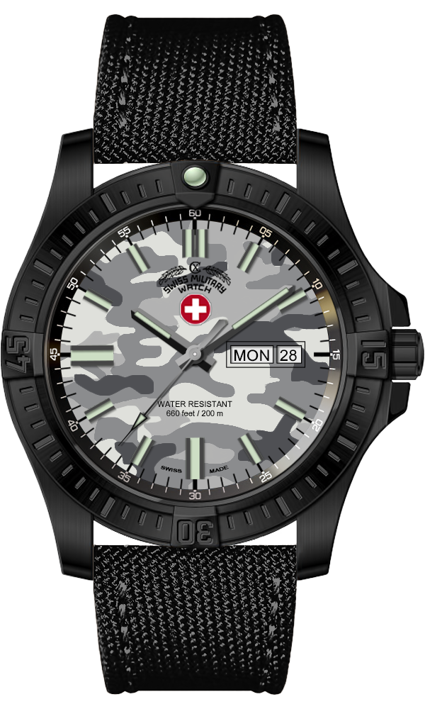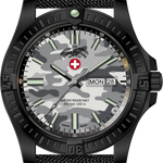 Swiss Military day/date DESERT STORM CAMO, Ronda cal. 517 Swiss Made movement, khaki camo dial, black IP plated stainless steel case, uni-directional turning bezel, screw-down crown, sapphire crystal, professional-grade khaki nylon strap (length 190mm, width 22mm; pin buckle, leather lining). Case: diameter 42mm, thickness 10mm, 20atm water-resistant. Weight: 72gr. HS-Code: 9102.1100.116