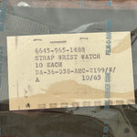 (SPEC: STRAP, WRIST: INSTRUMENT) This NATO stock number was created on 1 January 1960. MIL-W-46374 specification was issued in October 1964 to procure a low cost, disposable alternative to the MIL-W-3818B. Specifically, the watch strap was to be olive drab. 3.3.5 Strap. – The strap shall conform to the requirements of MIL-S-60127. This Specification was later revised, and required fixed bars, and an olive drab pass through strap, manufactured according to military specification MIL-S-46383B Type II. The MIL-S-46383 strap came in three types Type I – Strap, Special Purpose; Non-Magnetic Buckle [3/4 inch wide] Type II – Strap, General Purpose [5/8 inch wide] <-- This is the version offered here Type III – Strap, General Purpose [3/4 inch wide] 3.2.4.6 Strap. – The strap shall be in accordance with MIL-S-46383, Type II. The color of the strap shall be olive drab matching color number X34087 of FED-STD-595. A NOS strap is shown below... The stock number was allocated 6645-965-1488 shown here in the October 1965 NOS batch pictured above. Other stock labels exist today for US military wristwatch straps as made by Marathon Watch Co. The buckle was stainless steel with a matt, non-reflective finish. Later buckles were blackened.