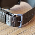 New old stock genuine military issue vintage watch strap/band, NSN: 6645-965-1488, was constructed in 1965 during the Vietnam War. US military wristwatch strap features a Non-magnetic non-reflective matt buckle and a 100% nylon body with a distinctive weave. It's a 16 mm strap made for general purpose watches and wrist compasses such as those by Hamilton and Benrus from that era.