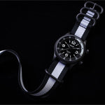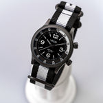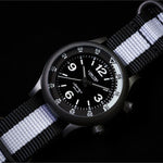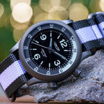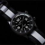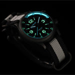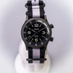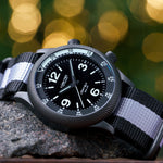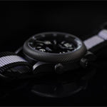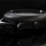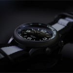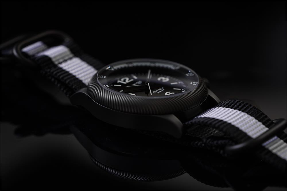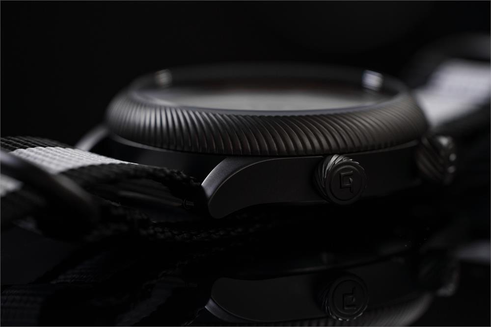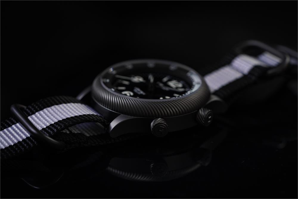 The watch also has a curved double-dome sapphire crystal with military grade polarized (double-side) anti-reflective coating. A military style strap is adorned with gunmetal PVD keepers and buckle. The screw down crown features double Viton® seals to bolster water resistance.