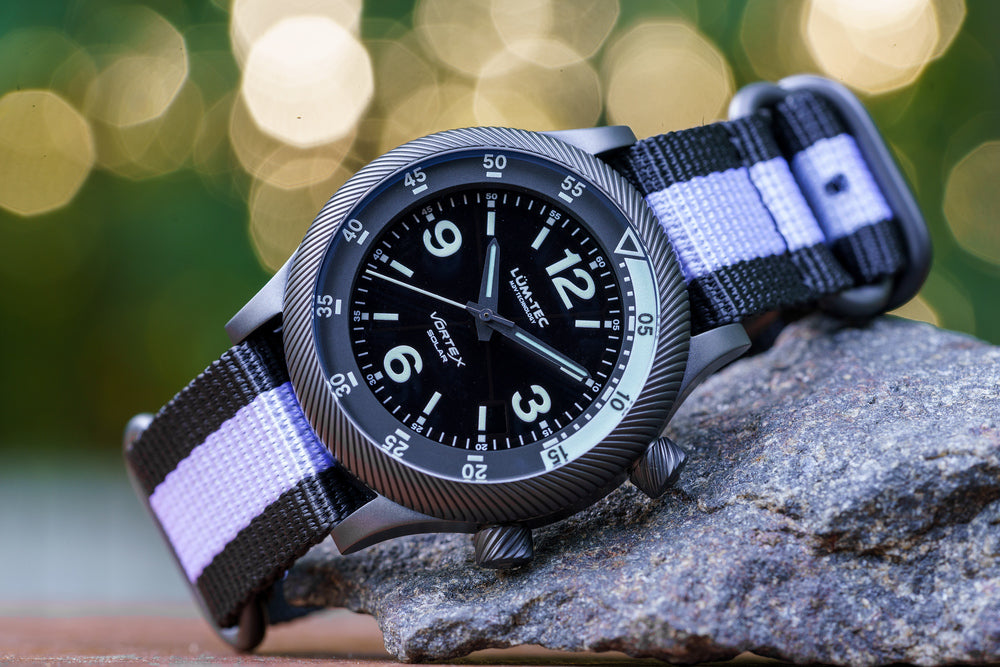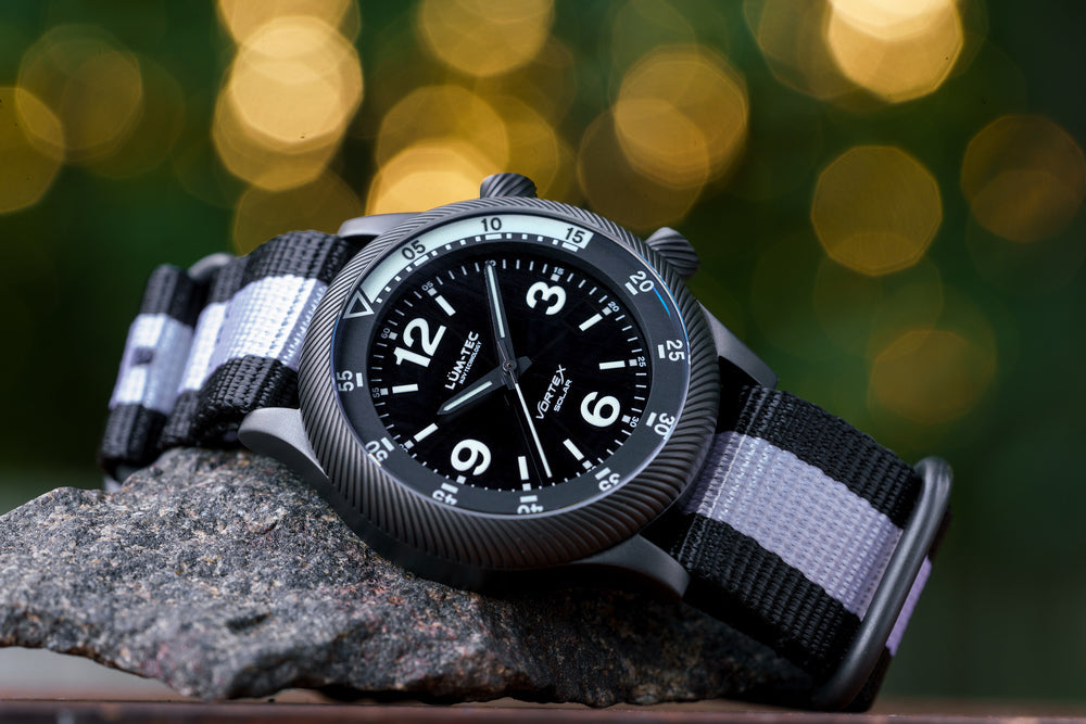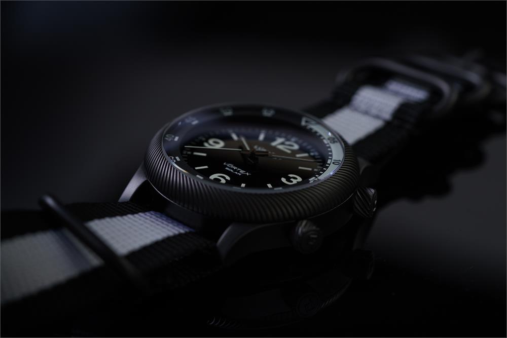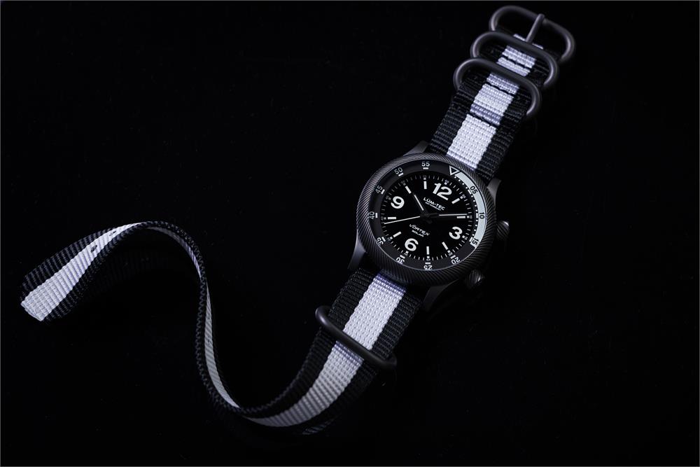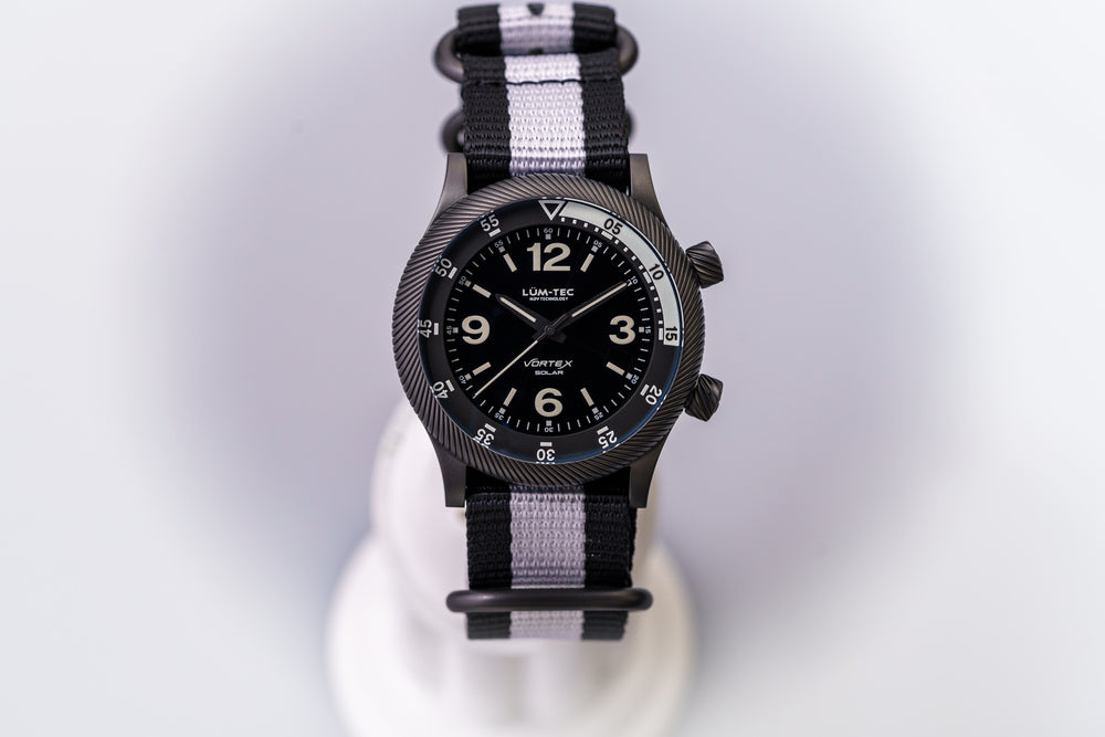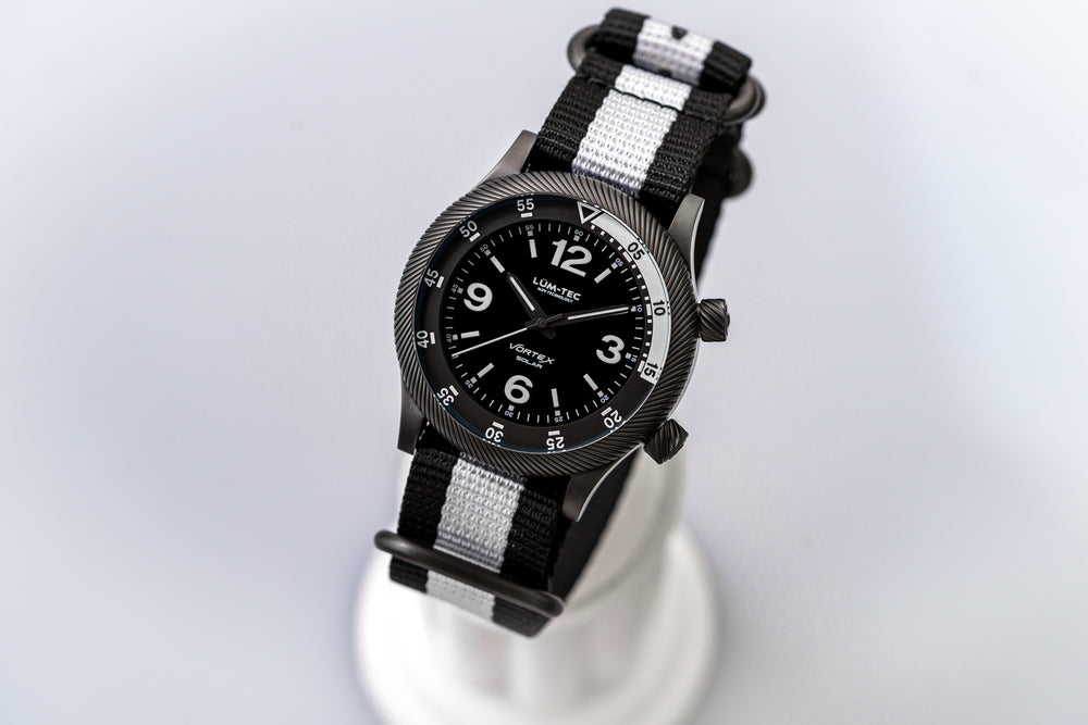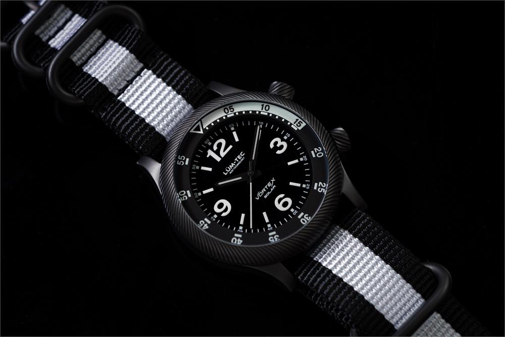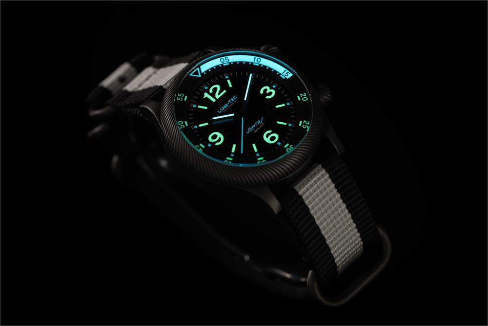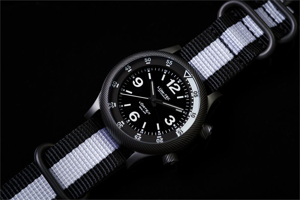 Lum-Tec’s new Vortex D1 watch is solar-powered so you don’t have to fuss with battery changes. And when fully charged, it has six months of power reserve. In fact just a minute charge with bright sunlight will be enough for a full day. Five hours or more of bright sunlight can charge the watch to its full six months power reserve. The Vortex D4 features a 42mm diameter stainless steel case with a military-grade titanium carbide Carbide PVD hard coating, a 120 click luminous internal diver bezel (set with a separate crown), 200 meters of water resistance, and the Lum Tec’s two-tone glow X1 grade SuperLuminova with MDV technology.