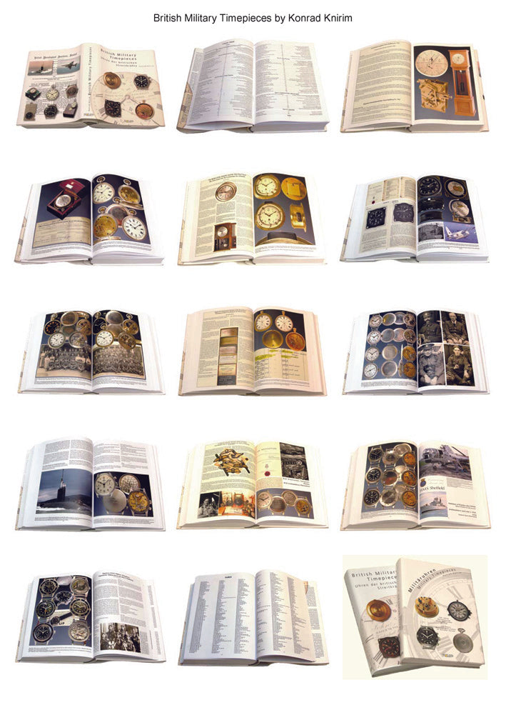 German Military Timepieces contains 636 pages and describes over 1000 timepieces with excellent supporting photographs throughout. British Military Timepieces contains 800 pages and describes over 1200 timepieces with excellent supporting photographs throughout. Both are bi-lingual with each page having two texts; English to the left and German to the right. The books cover: Ships-Chronometers, Torpedoboat-Chronometers, Ships-Clocks, Navigation Watches, Combat Swimmers Watches, Torpedo Timers, Aircraft-Clocks, Message CenterClocks, Chronographs, Bomber-Stopwatches, Pilot's Watches, Artillery Chronographs, Instrument Clocks, Decoration Watches, Observatory Clocks, Chronometers, Chronometer Watches, Deck Watches, Pocket Watches, Ship‘s Clocks, Zig-Zag Clocks, Aircraft Clocks, Instrument Clocks, Mantle Clocks, WT Watches, Asdic Timers, Artillery Stop Watches, Trench Watches, Waterproof Wrist Watches, Wrist Chronographs, Pilot‘s Watches, Diver‘s Watches, and General Service Watches. These books are must for the collector of military timepieces and marine chronometers but will provide a most pleasant browsing experience for almost any horological collector or researcher.German & British Military Timepieces (Vol I & II) by Konrad Knirim