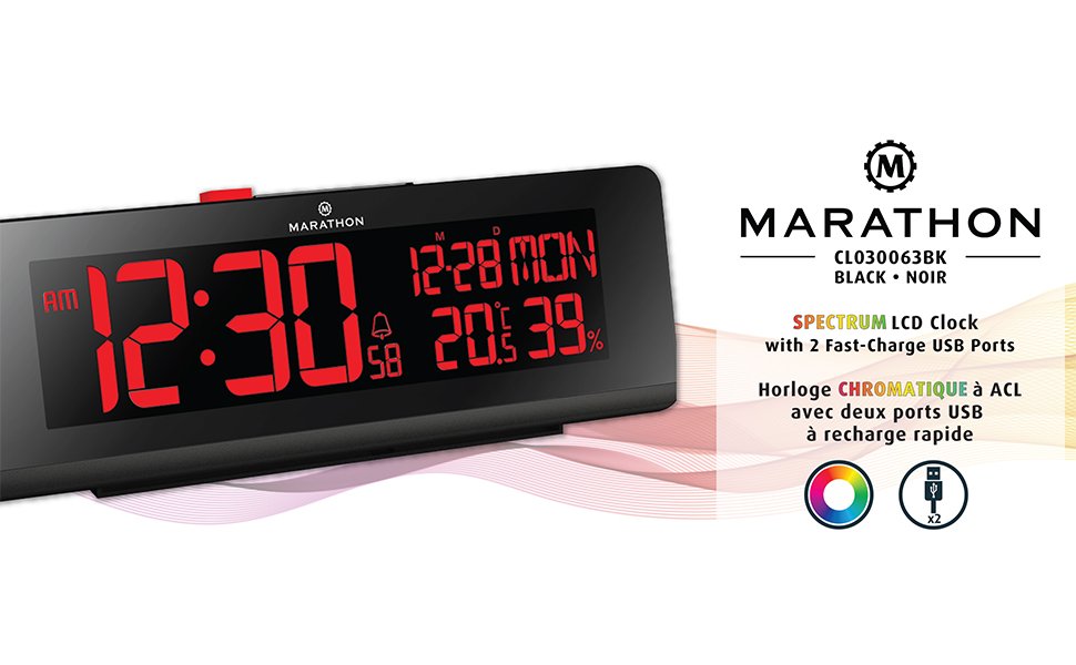 Marathon Watch Company's new COLOR ALARM CLOCK & USB CHARGING has many features that make it an excellent addition to your nightstand or bedside table. The first thing that separates this clock from the rest, is the customizable 256 color full spectrum LED display. You can choose your favorite color or enable the auto-scroll feature, which will continuously transition through all available colors. Conveniently located on the side of the clock are two USB ports for charging your devices. This unique alarm clock also features easily accessible alarm and snooze buttons, ideal for finding in the dark. The large display allows you to easily see the time, date, the day of the week, temperature and humidity all at a glance. The time can be displayed in 12 or 24-hour format, the temperature in Celsius or Fahrenheit and the day of the week in 5 languages (English, French, German, Spanish and Italian). With backup battery power (batteries included) your alarm will sound even in a power outage. COLOR CHANGING DISPLAY: Customizable display has 256 colors to choose from with an auto-scroll feature. USB CHARGING: Dual fast charging, easily accessible USB ports. ALARM WITH SNOOZE: Easy to set alarm with snooze function (5-minute intervals). MULTIPLE DISPLAY MODES - 12 or 24-Hour display formats with indoor temperature in Celsius or Fahrenheit and day of the week in 5 languages. AC ADAPTER: 100V-240V Universal AC Adapter and battery backup for clock (3 x AAA included). Looking to grab and keep your child’s attention? Our LCD Spectrum clock does just that by making telling time fun! By pressing the “manual” button we give you option of a time and date display in 8 different vibrant colors: white, red, orange, yellow, green, cyan, blue and purple. Can’t choose just one? We have a setting called “Demo Mode” that slowly cycles through a total of 256 colors. With lighting control, you can choose the maximum or minimum amount of light you wish your clock to display! With 2 USB fast charging ports located on the side of the clock you can easily charge your or his/her phone or tablet while you work! Great for a multi-tasker. Another cool addition is the universal AC adapter. Measuring at 10x3x4 and weighing 1.35 pounds so you can take this clock ANYWHERE! The COLOR ALARM CLOCK & USB CHARGING is probably one of the most useful and unique clocks you will see.