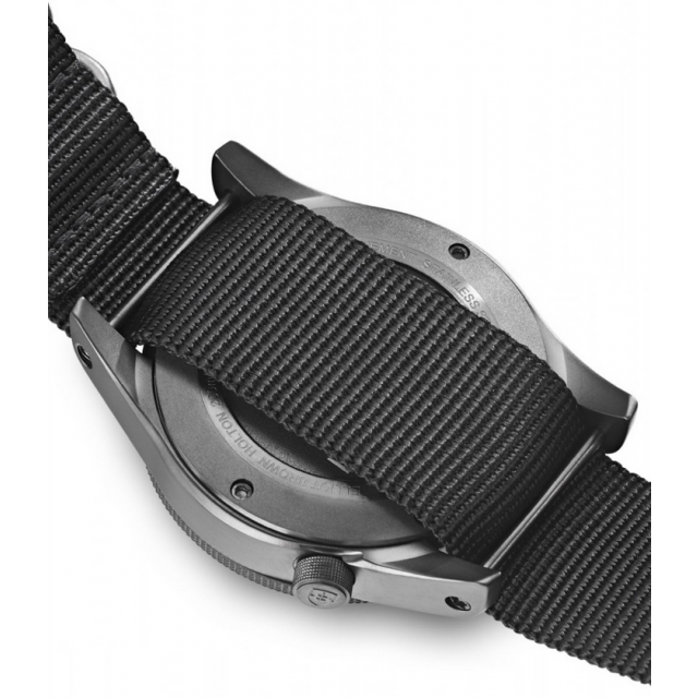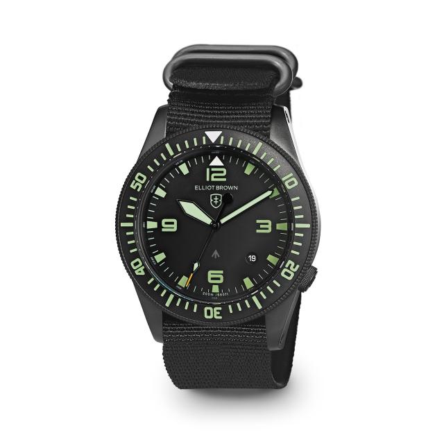 The Holton Professional watch series is the first military issue watch to be created by a British watch company in more than ten years. It is fit for purpose and designed for use every day no matter how harsh the conditions. Read on about the special features incorporated into the design of this watch.... Having purchased Elliot Brown watches privately it became clear that British military personnel preferred them to the watches they had previously been issued and approached Elliot Brown to develop a new model specifically for military issue. To develop a new watch from the ground up, Elliot Brown asked military personnel to bring their current resistance and discuss what worked and what didn't, only then were they able to fully understand the requirement and create the internal brief that made sure the new Holton Professional watch would perform faultlessly. The result is the Holton Professional watch with a bead blasted .8 micron PVD coated stainless steel case, patented shock protection system, spring bars that will not break easily, a bezel that can be operated easily even wearing gloves. Its water and dust resistance is up to harsh conditions and it has fit for purpose straps that are easy to change. Finally, it is a watch that is instantly readable day or night thanks to a well-designed dial and bezel utilizing vivid numerals, markers, contrasting markers/handsets and the use of C3 SuperLuminova. The Holton Professional watch is a terrific field and diving watch whose design language echoes that of vintage British military watches yet with all the trademark Elliot Brown house design cues, creating a sense of continuity and familiarity. The specification of the bezel gives perfect insight into the level of detail required for the Holton Professional Watch project to be successful. A precise 120 click high grip bezel houses a stainless steel insert precisely embossed with hours and minutes indentations then flooded with high-grade C3 SuperLuminova. The hobnail outer knurling is slightly higher than the insert to form a high grip surface for trustworthy operation even when using the palm of a wet gloved hand. Both components are matt bead blasted, hardened to 1200HV (Vickers hardness scale) then a 0.8 micron PVD coating is applied whose hardness matches that of the stainless steel components. Straps are easily changed and secured via solid steel screw in bars operated with an included five lobe tool and matching socket in the strap bar ends. The recessed crown sits neatly out of harm's way at 4 hour position while retaining the immense water protection afforded by Elliot Brown's proprietary triple seals. An additional screw down mechanism locks the crown into the case. The Holton Professional Watch has been assigned the NATO stock number 6645-99-303-0677: Time-measuring instruments; United Kingdom, and features the 'Crow's foot/Pusser's Arrow/Broad Arrow' on the dial in subdued grey. The Broad Arrow has historically been applied to UK issued military equipment including British Military watches. The Holton Professional Watch takes its name from Holton Heath in Dorset, the location of a wartime cordite factory from World War I and World War II.