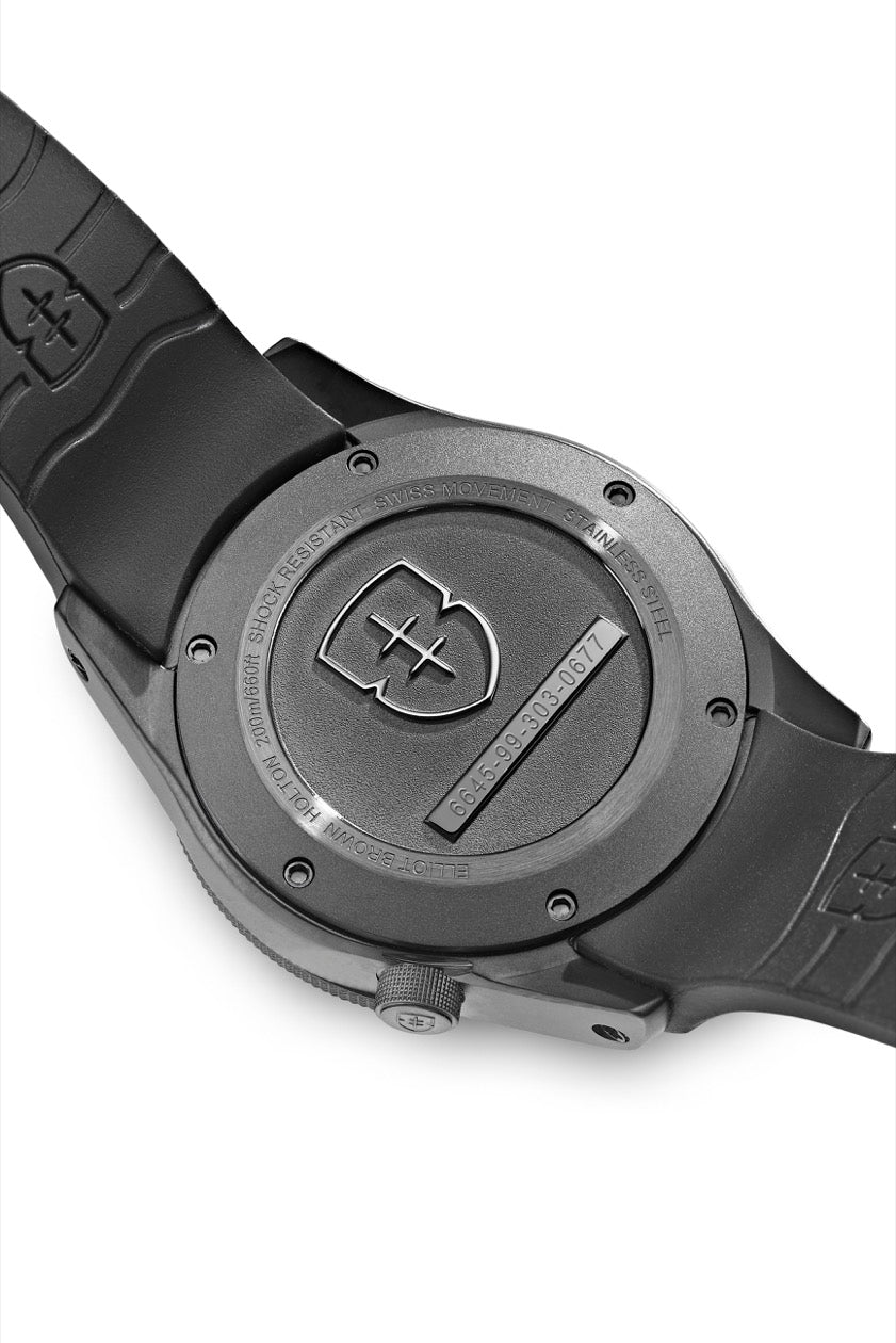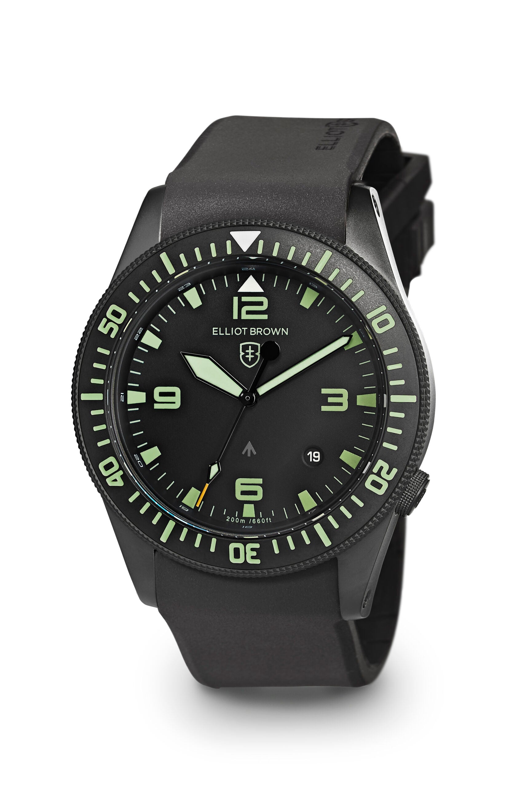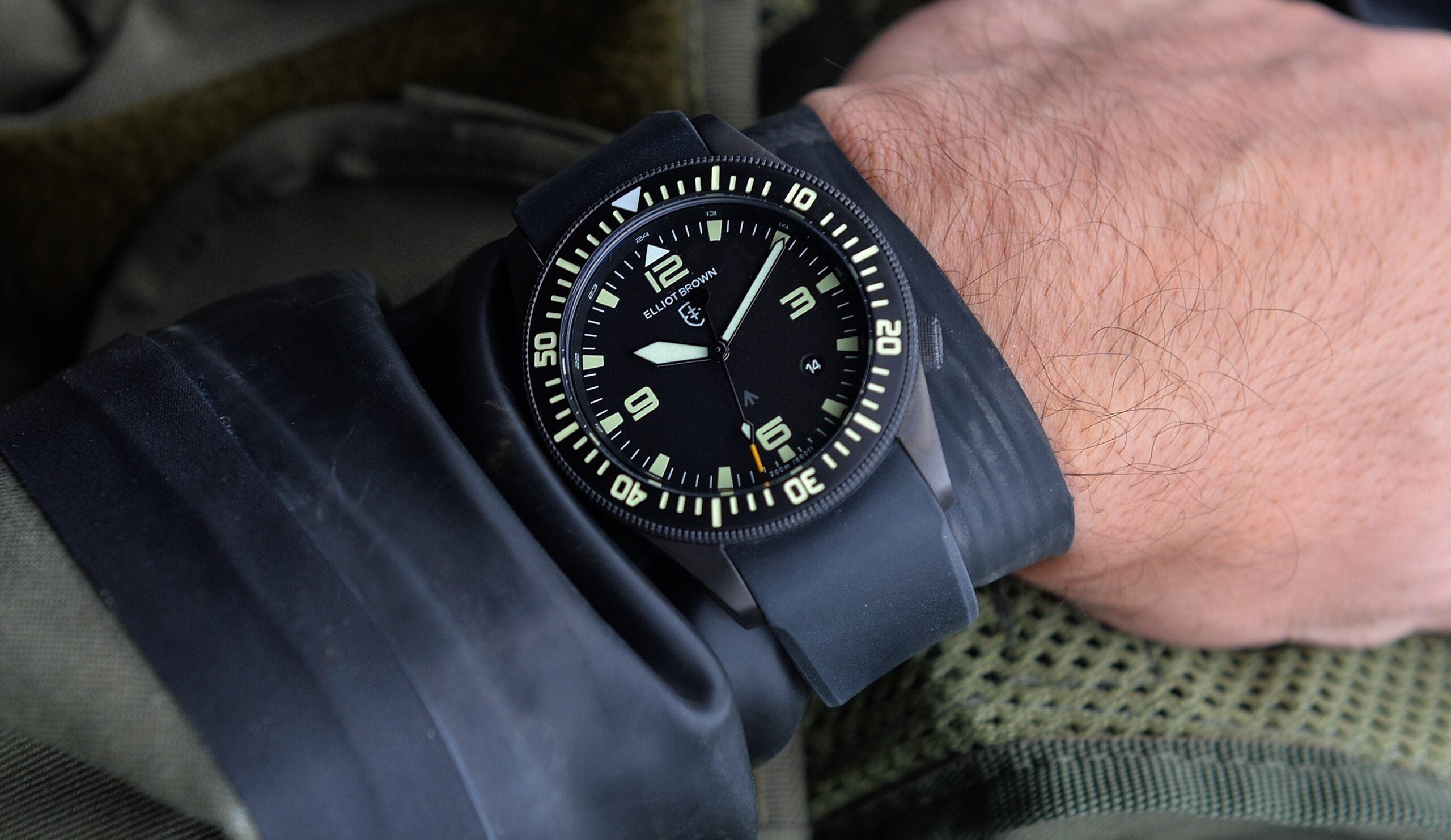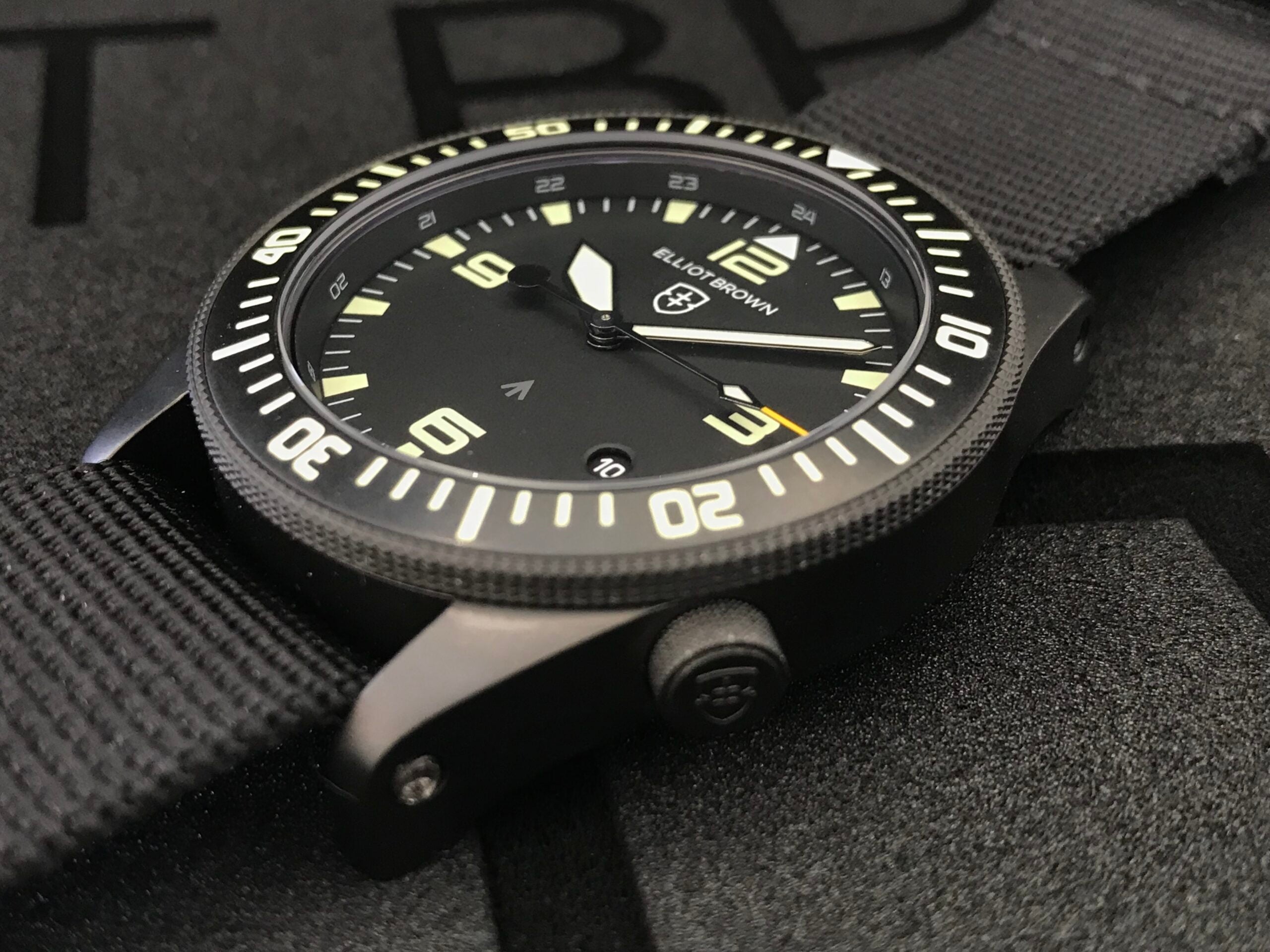 It is fit for purpose and designed for use every day no matter how harsh the conditions. Read on about the special features incorporated into the design of this watch.... Having purchased Elliot Brown watches privately it became clear that British military personnel preferred them to the watches they had previously been issued and approached Elliot Brown to develop a new model specifically for military issue. To develop a new watch from the ground up, Elliot Brown asked military personnel to bring their current resistance and discuss what worked and what didn't, only then were they able to fully understand the requirement and create the internal brief that made sure the new Holton Professional watch would perform faultlessly. The result is the Holton Professional watch with a bead blasted .8 micron PVD coated stainless steel case, patented shock protection system, spring bars that will not break easily, a bezel that can be operated easily even wearing gloves. Its water and dust resistance is up to harsh conditions and it has fit for purpose straps that are easy to change. Finally, it is a watch that is instantly readable day or night thanks to a well-designed dial and bezel utilizing vivid numerals, markers, contrasting markers/handsets and the use of C3 SuperLuminova. The Holton Professional watch is a terrific field and diving watch whose design language echoes that of vintage British military watches yet with all the trademark Elliot Brown house design cues, creating a sense of continuity and familiarity. The specification of the bezel gives perfect insight into the level of detail required for the Holton Professional Watch project to be successful. A precise 120 click high grip bezel houses a stainless steel insert precisely embossed with hours and minutes indentations then flooded with high-grade C3 SuperLuminova. The hobnail outer knurling is slightly higher than the insert to form a high grip surface for trustworthy operation even when using the palm of a wet gloved hand. Both components are matt bead blasted, hardened to 1200HV (Vickers hardness scale) then a 0.8 micron PVD coating is applied whose hardness matches that of the stainless steel components. Straps are easily changed and secured via solid steel screw-in bars operated with an included five-lobe tool and matching socket in the strap bar ends. The recessed crown sits neatly out of harm's way at 4 hour position while retaining the immense water protection afforded by Elliot Brown's proprietary triple seals. An additional screw-down mechanism locks the crown into the case. The Holton Professional Watch has been assigned the NATO stock number 6645-99-303-0677: Time-measuring instruments; United Kingdom, and features the 'Crow's foot/Pusser's Arrow/Broad Arrow' on the dial in subdued grey. The Broad Arrow has historically been applied to UK issued military equipment including British Military watches. The Holton Professional Watch takes its name from Holton Heath in Dorset, the location of a wartime cordite factory from World War I and World War II.