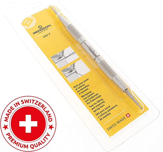 As used by watchmakers in the Swiss watch industry, the Bergeon 6767-F Watch Spring Bar Tool is an all stainless steel construction tool manufactured in Switzerland to exacting Swiss Quality. The Bergeon 6767-F Watch Spring Bar Tool features a round stainless steel handle with knurled grip areas machined into the handle for easy grip and is 148 mm (approximately 5.5 inches) long with the tool ends inserted. Bergeon & Cie, a renowned Swiss company, established in 1791, has distinguished itself as a global leader in the innovation and manufacture of precision tools for the watch making and jewelry industry. Bergeon is continually improving its products through active engagement with their customers that range from small adjustments to standard products to the development of completely new tools. Bergeon tools are the benchmark in the watch industry for tools to manufacture, adjust and repair watches of all makes. The "F" is for fine fork tip which is generally used for working with metal watch bracelets but can be easily used on leather or other pliable bands. The small forked tip on the Bergeon 6767-F springbar tool is only 1mm in diameter and was designed to be the perfect size for compressing spring bars on watch straps without damaging the watch strap or watch. The pin end is perfect for compressing push pins and recessed buttons. Both ends are made of hardened tempered stainless steel for strength and durability. It is simply an indispensable tool for anyone working with watches. The mandrel size of 0.8mm is a perfect match for most standard spring bars. It allows for smooth insertion and removal without damaging the watch case or strap. This is great for changing straps on the new Marathon Stainless Steel Navigator or any precision Swiss made watch. Grab one of these at a very good price!