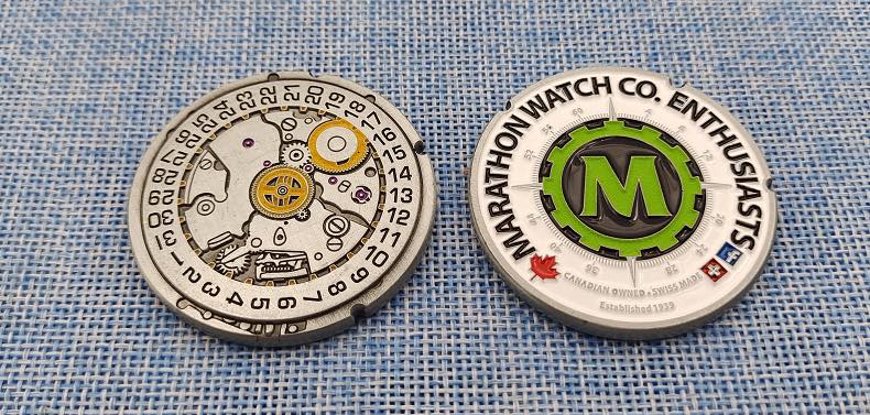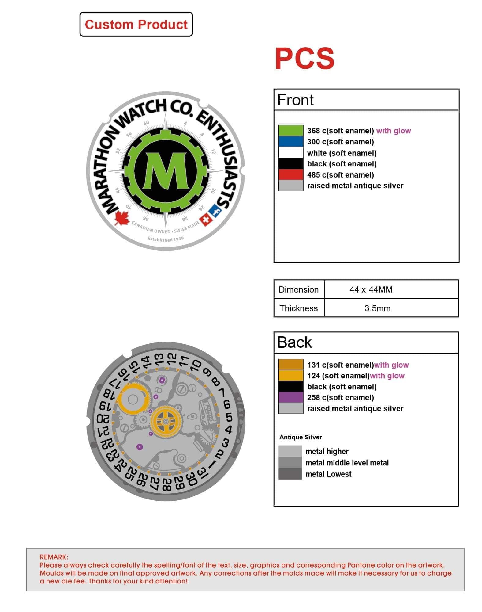 This is a fabulous limited production challenge coin as produced for members of the MARATHON WATCH ENTHUSIAST Facebook Group <-- click here. If you are not a member of this informative and interactive group, by all means, please consider this to be an official invitation from us here at Windy City Watch Collector to join! The Marathon watch challenge coin was produced by the founding member of the group, Shawn Bush, in Ontario, Canada! The coin features the Marathon Watch Enthusiasts logo which incorporates the Marathon Watch Company logo in the center. The Marathon logo is luminous and glows in the dark. The reverse features an image of the top plate of Marathon's famous GSAR (Search and Rescue) dive watch with a date wheel. If you do not know, a challenge coin is a small coin or medallion, bearing an organization's insignia or emblem and carried by the organization's members. Traditionally, they might be given to prove membership when challenged and to enhance morale. They are also collected by service members and law enforcement personnel. Historically, challenge coins were presented by unit commanders in recognition of special achievement by a member of the unit. They could also be exchanged in recognition of visits to an organization.[1] The challenge coin specifics: