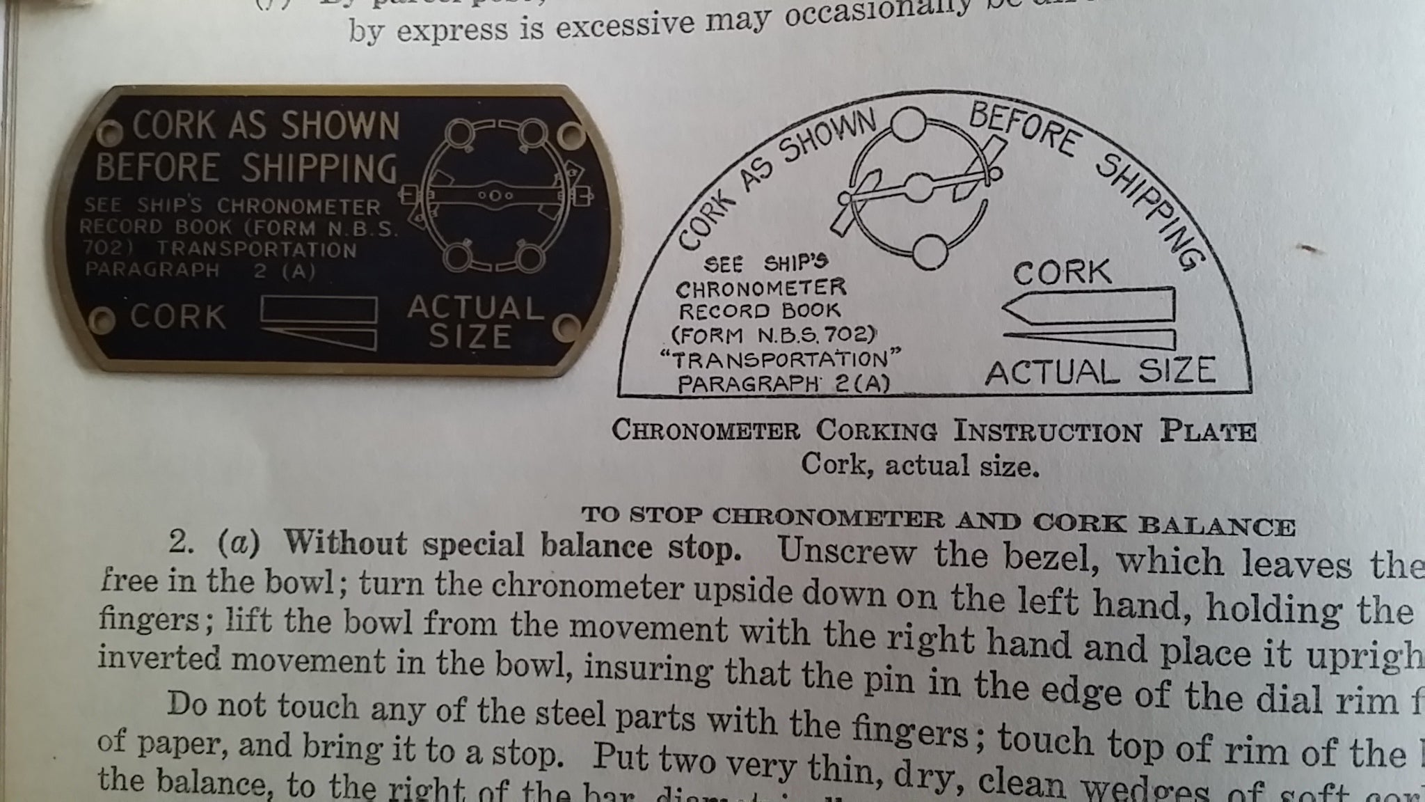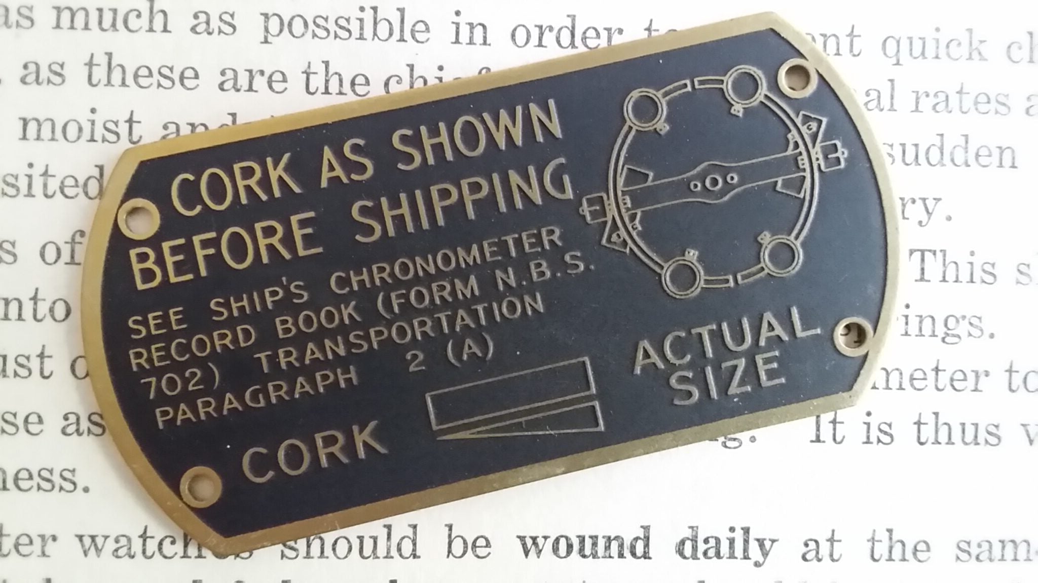 "CORK AS SHOWN BEFORE SHIPPING" plate for a marine chronometer is an original New Old Stock brass plate that dates from during WWII and was made as specified by the US Navy Ship's Chronometer Record Book (Form N.B.S. 702) Transportation Paragraph 2(A) as referenced on the plate. It was probably made for the Elgin National Watch Company that designed a marine chronometer for the Navy but was unable to get it into production and have it accepted. It is suitable to be used in any marine chronometer and still makes a great reminder! It is made of brass in the 1940s and was never used. It measures 2 1/2 x 1 1/4 inches and was designed to be attached inside a Marine Chronometer box to remind one how to properly immobilize the balance wheel before transport. It is shown next to a U.S. quarter for size comparison. The pictures show it next to the US Navy book with an excerpt showing a simlar plate. Book or chronometer not included.