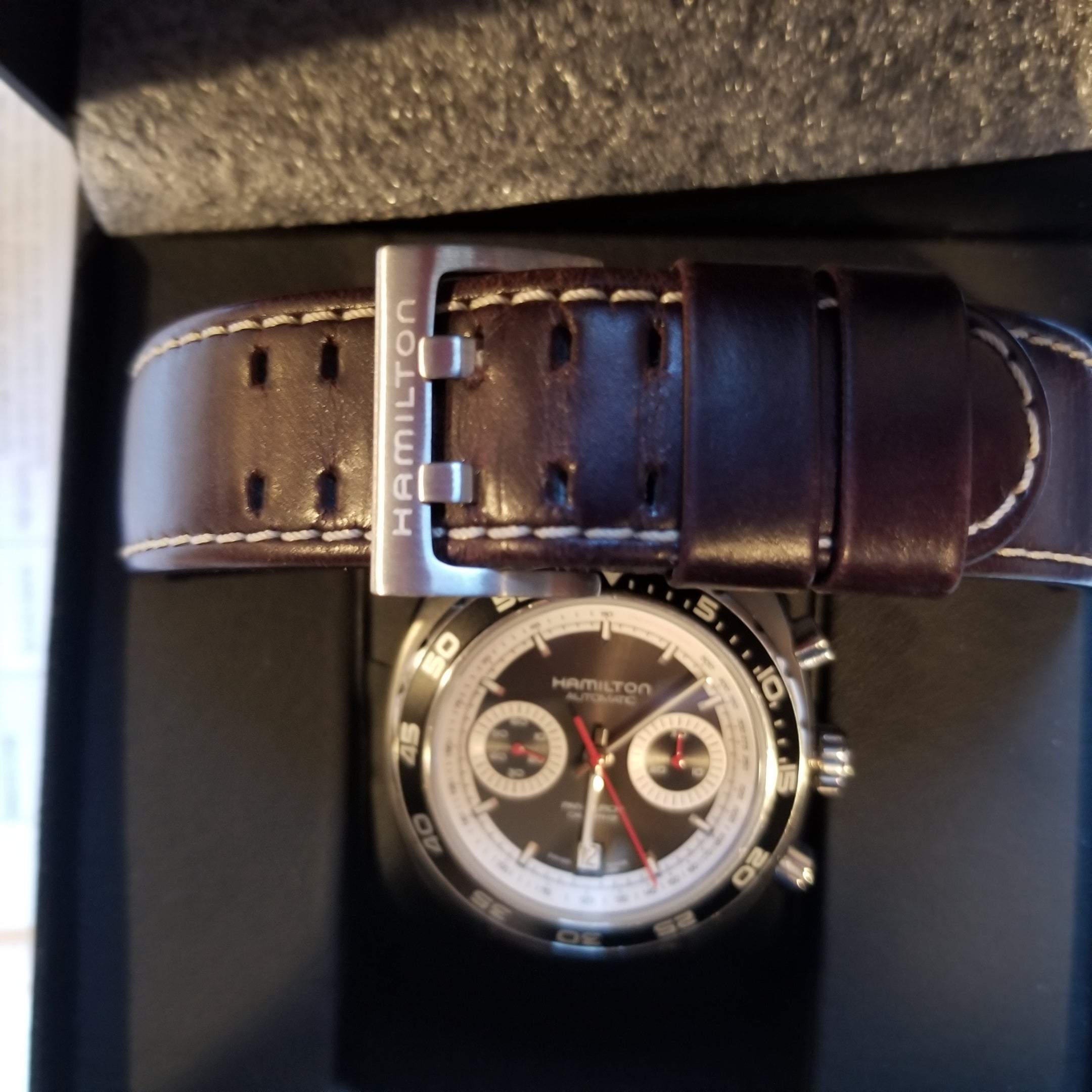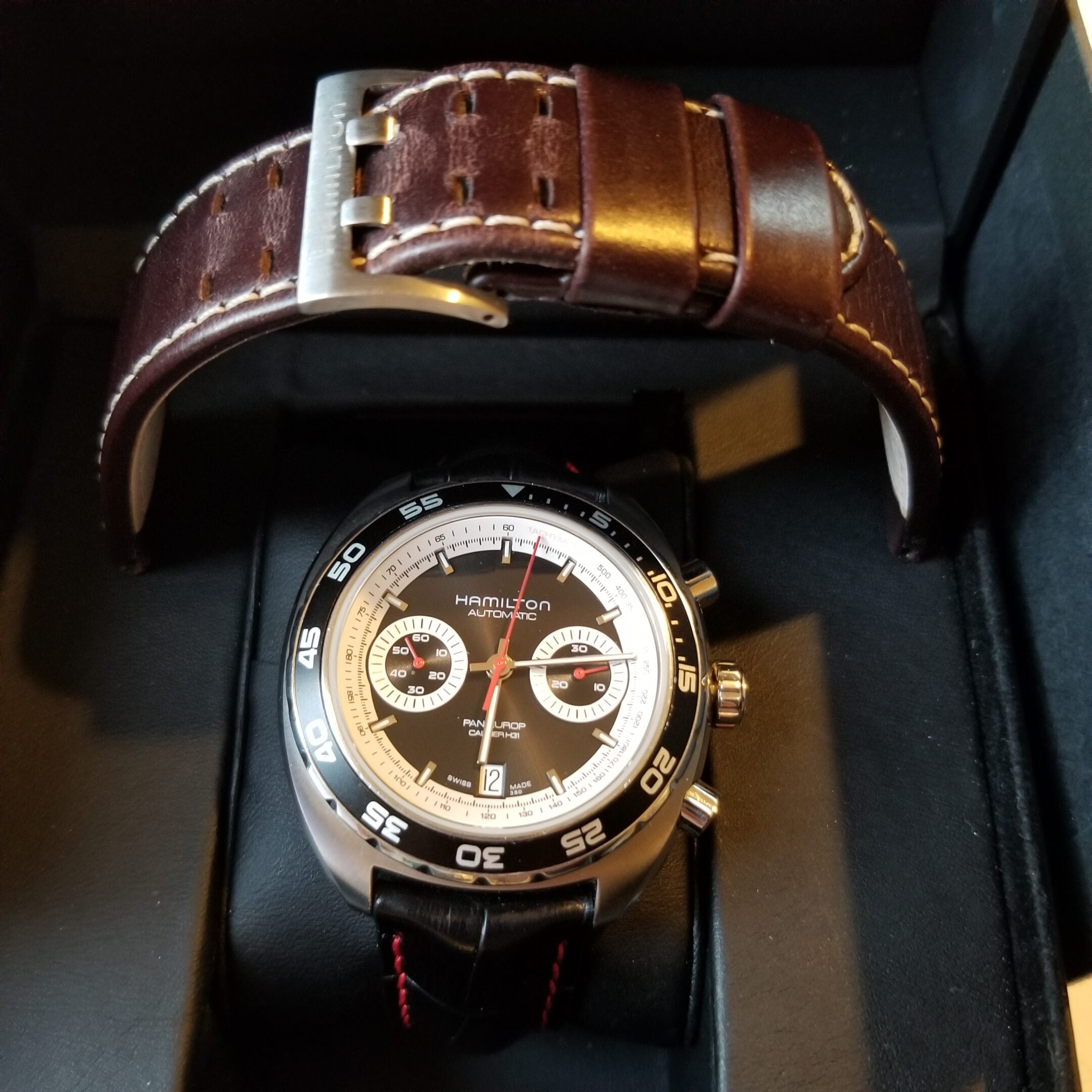 The H-31 is a powerful automatic chronograph movement based on the Valjoux 7750 featuring an extended 60-hour power reserve, making it perfect for the demands of the sportiest of models. With an H pattern design on the oscillating bridge, there’s no mistaking who made this movement. The extended power reserve was done by lowering the frequency of the balance wheel to 3 versus 4Hz, and increasing the size of the mainspring barrel (as Hamilton did on the famous model 22 chronometer deck watch during WWII). Pictures are of the actual watch. The watch includes the boxes, original warranty card from an authorized retailer in Quebec (from 2016, expired), instruction book, a black padded leather strap with red stitching and adjustable deployment clasp (pictured on watch, retail over $95) as well as a second original Hamilton strap in chocolate brown leather with white stitching is included. Enjoy the classic look of the Hamilton Pan Europ for many years!