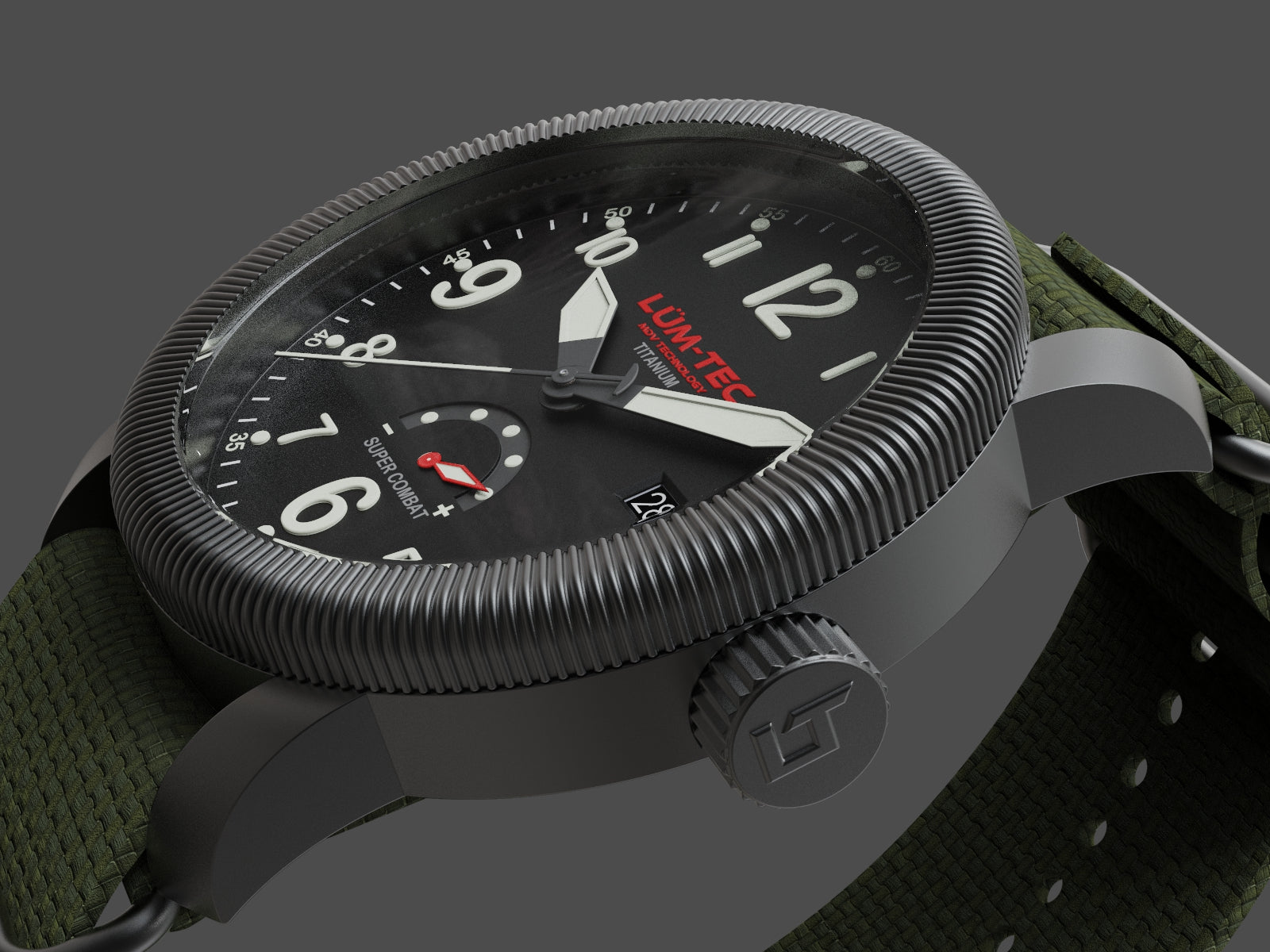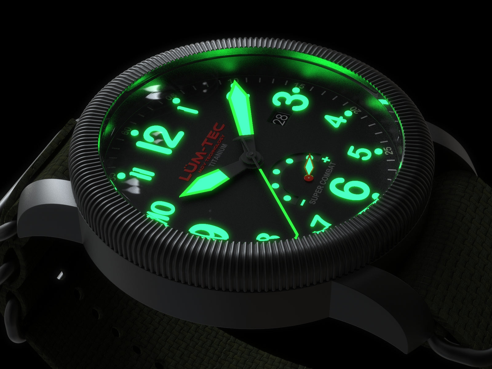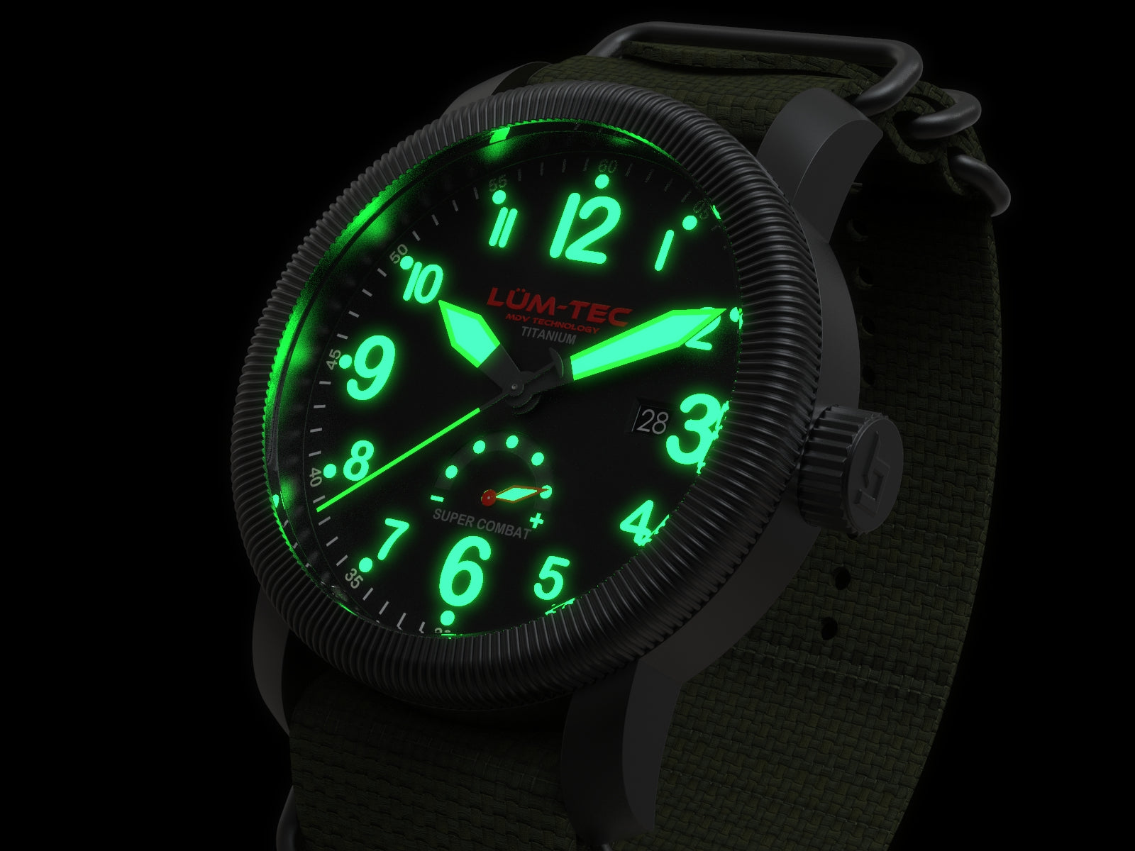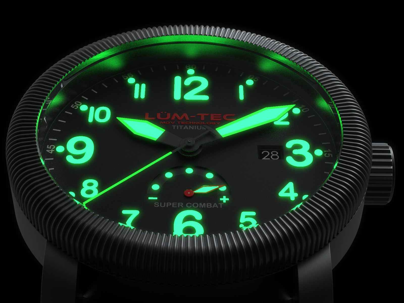 Every LÜM-TEC watch features exclusive MDV Technology, a special 8-layer application of ultra bright glowing Super-Luminova photoluminescent material. MDV hands and dials are extremely visible in all light conditions, making this watch perfect for red-eye travelers, evening joggers, and casual divers alike.