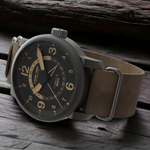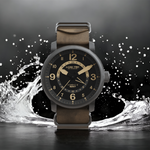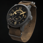 Two military style straps included: One charcoal gray nylon and one tan leather with gunmetal PVD hardware