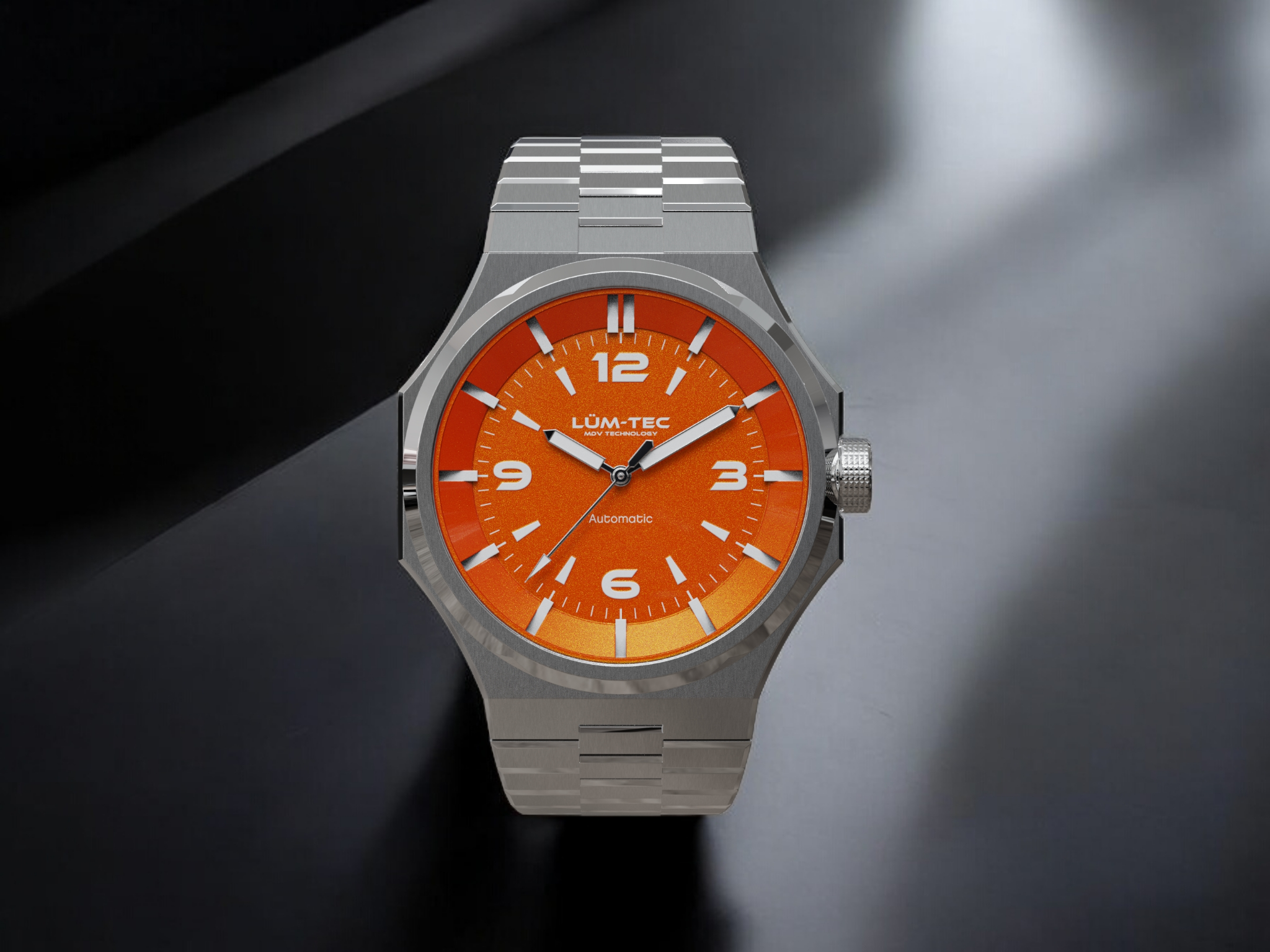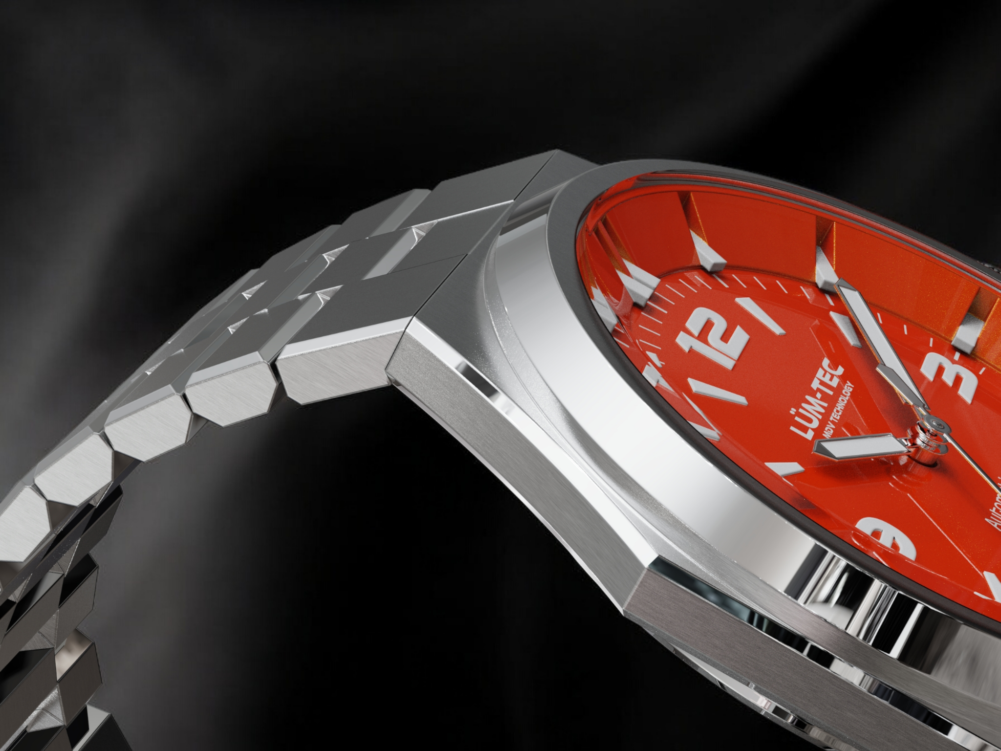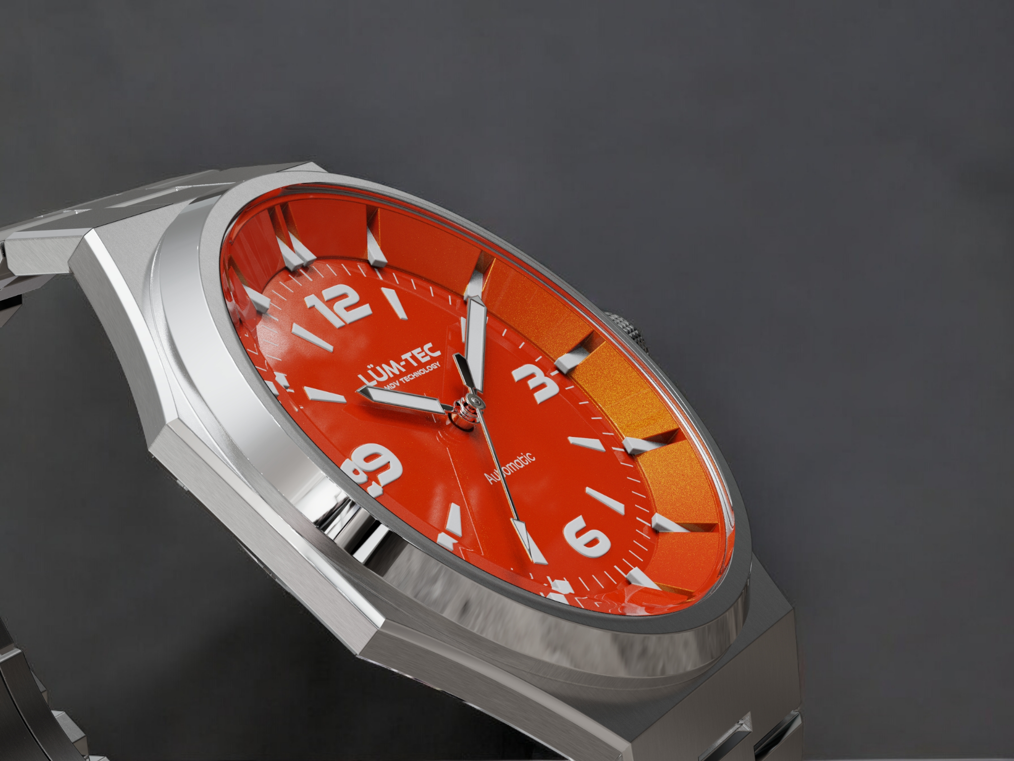 - Bi-layer pearl orange lacquer 3D dial with extruded luminous index