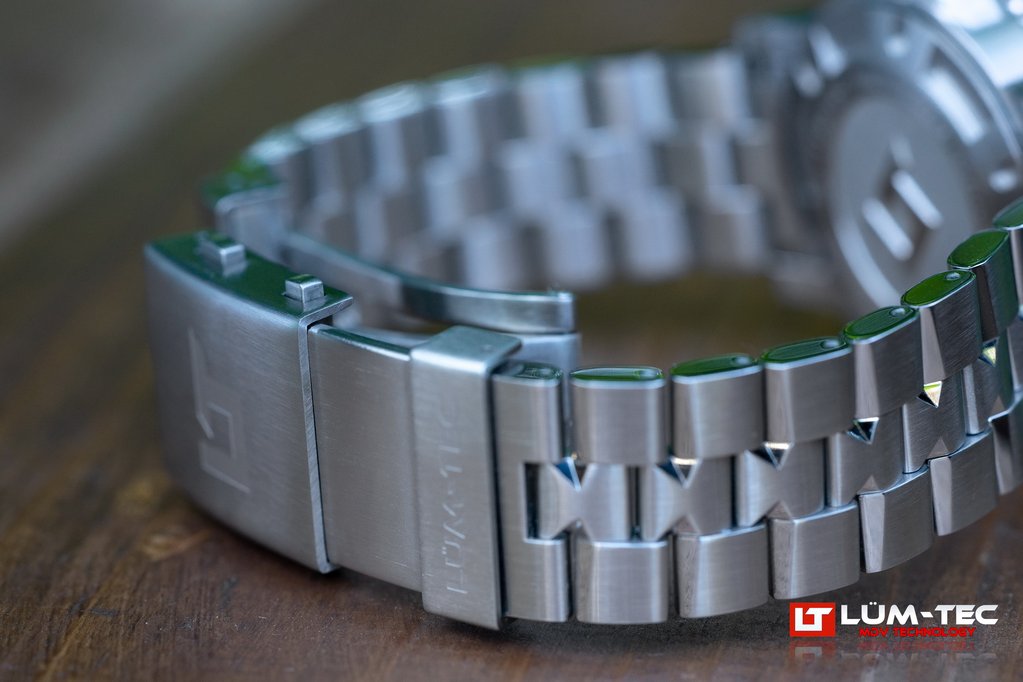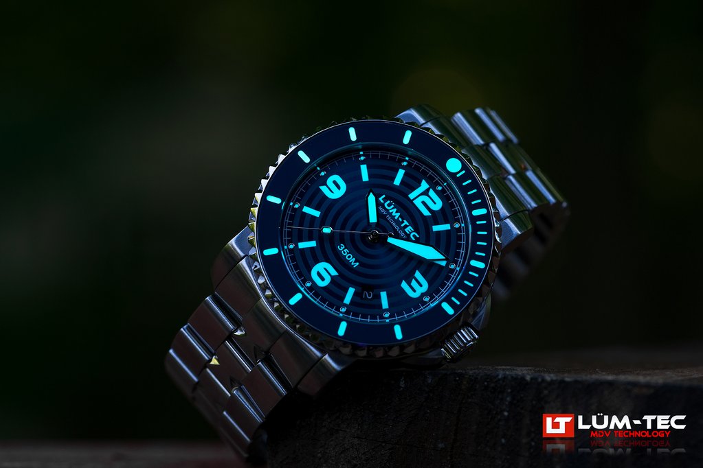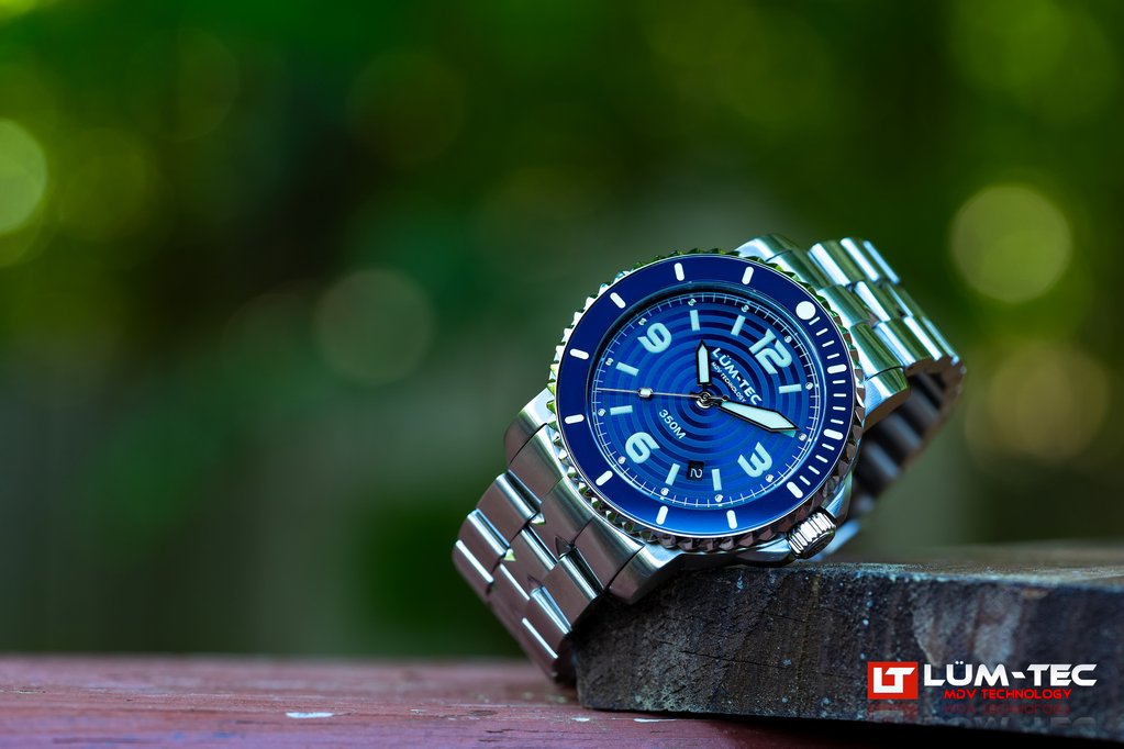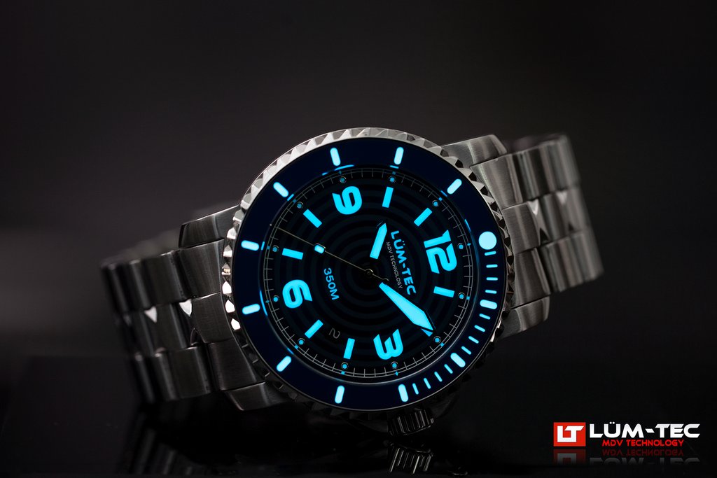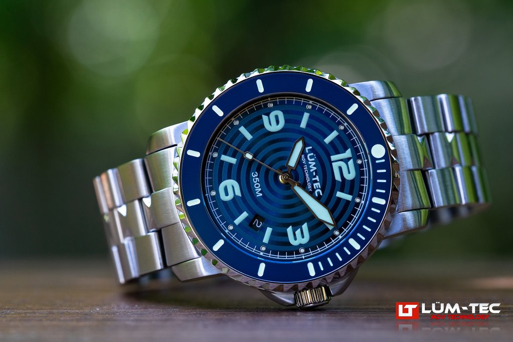 The Lum-Tec 350M-2 is a 350 meter dive watch that has a 43mm diameter 316L stainless steel case with a blue dial with sunburst finish and special texturing. The 120-click uni-directional bezel has a ceramic insert with MDV Technology illumination for the markings. It compliments the highly luminous C3 BL SuperLuminova used on the dial markers and hands. A top grade sapphire crystal is used with a military grade double anti-reflective coating so you can read the time clearly. The Swiss Made Sellita SW200-1 automatic (26-jewel) movement that powers the watch is precision tuned to +/- 0-3 seconds/day tolerance in six positions. An anti-shock movement mounting system is employed for increased durability. And, the movement is fully encased in iron shielding for magnetic resistance up to 20,000A/m. The Lum-tec 350M-2 is secured to your wrist with a comfort-engineered surgical grade forged 316L stainless steel bracelet. The bracelet has a button locking deployant clasp with a ratcheting diver extension. Case dimensions are 43mm x 12mm. Lug to lug measurement is 49.7mm. The lug width is 22mm. Assembled by hand in Ohio, USA. All new Anti-Magnetic 350 meter diver series for LUM-TEC.... the Lum-tec 350M-2 Assembled by hand in Ohio Width: 43mm excluding crown Thickness (with glass) 12.0mm Lug to lug length: 49.7mm Lug width: 22mm Water resistance: 350 meters Swiss made Sellita SW200-1 automatic movement Precision tuned to +/- 0-3 seconds/day tolerance in six positions Self-winding mechanism with ball bearing 28,800 vibrations per hour, 4 Hz. 26 jewels Power reserve 38 hours Anti-shock movement mounting system for increased durability Movement of Lum-tec 350M-2 is fully encased in iron shielding for magnetic resistance up to 20,000A/m Surgical grade 316L Stainless Steel forged and heat treated case Alternating brushed and mirror polished with top level finishing Ceramic bezel insert with MDV Technology illumination 120 Click Uni-directional bezel Top grade genuine sapphire crystal Military grade double anti-reflective coating Blue dial with sunburst finish and special texturing MDV Technology 30 layer raised luminous application Highly reactive spec X1 grade C3 BL Super-Luminova Mirror polished, diamond cut stainless steel hands High tech Viton gaskets Screw down crown with double diamond sealing system Closed forged and CNC machined threaded caseback Comfort engineered surgical grade forged 316L stainless steel bracelet Button locking deploy clasp with ratcheting dive extension Lifetime free timing adjustments, seal cleaning and pressure testing for the Lum-Tec 350M-2 2 year limited warranty The Lum-Tec 350M-2 dive watch definitely has a presence as well as purpose.Lum-tec 350M-2 -- Last one!