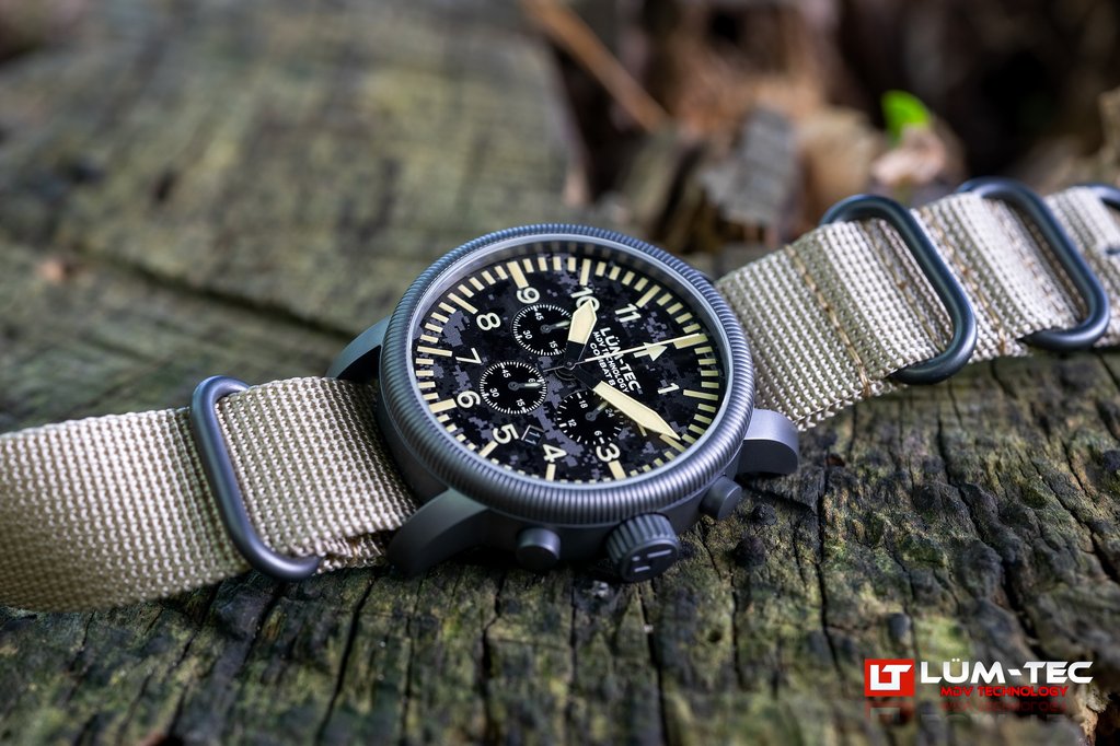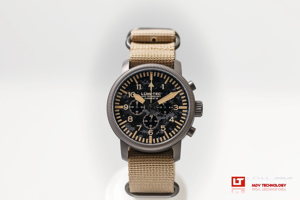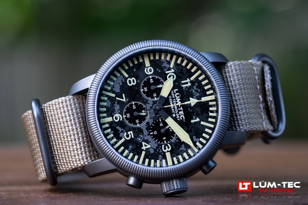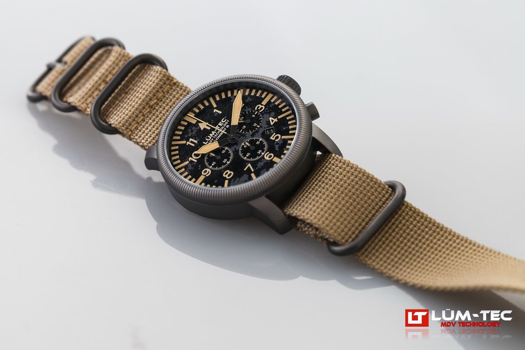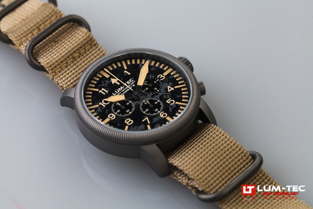 The Lum-Tec Combat B44 Camo features a 43mm diameter 316L stainless steel case that has a titanium carbide PVD coating giving it a gunmetal tone. The black dial has been bead blasted to impart a charcoal hue. The hands and hours have been treated with a vintage color SuperLuminova for viewing the time in darkness and low light conditions.