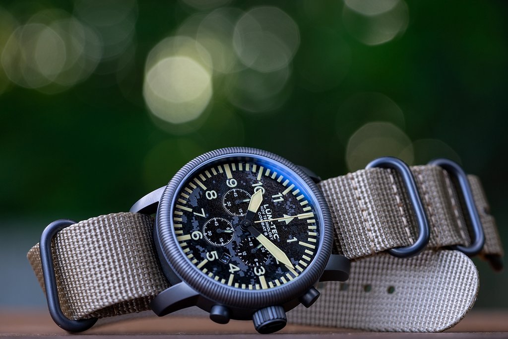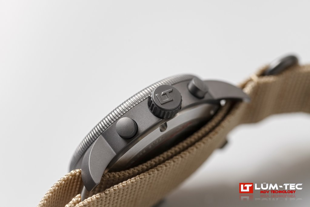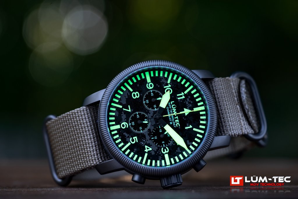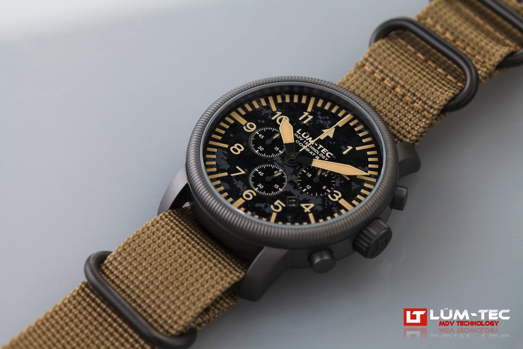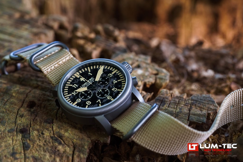 The Lum-Tec Combat B44 Camo features a 43mm diameter 316L stainless steel case that has a titanium carbide PVD coating giving it a gunmetal tone. The black dial has been bead blasted to impart a charcoal hue. The hands and hours have been treated with a vintage color SuperLuminova for viewing the time in darkness and low light conditions.