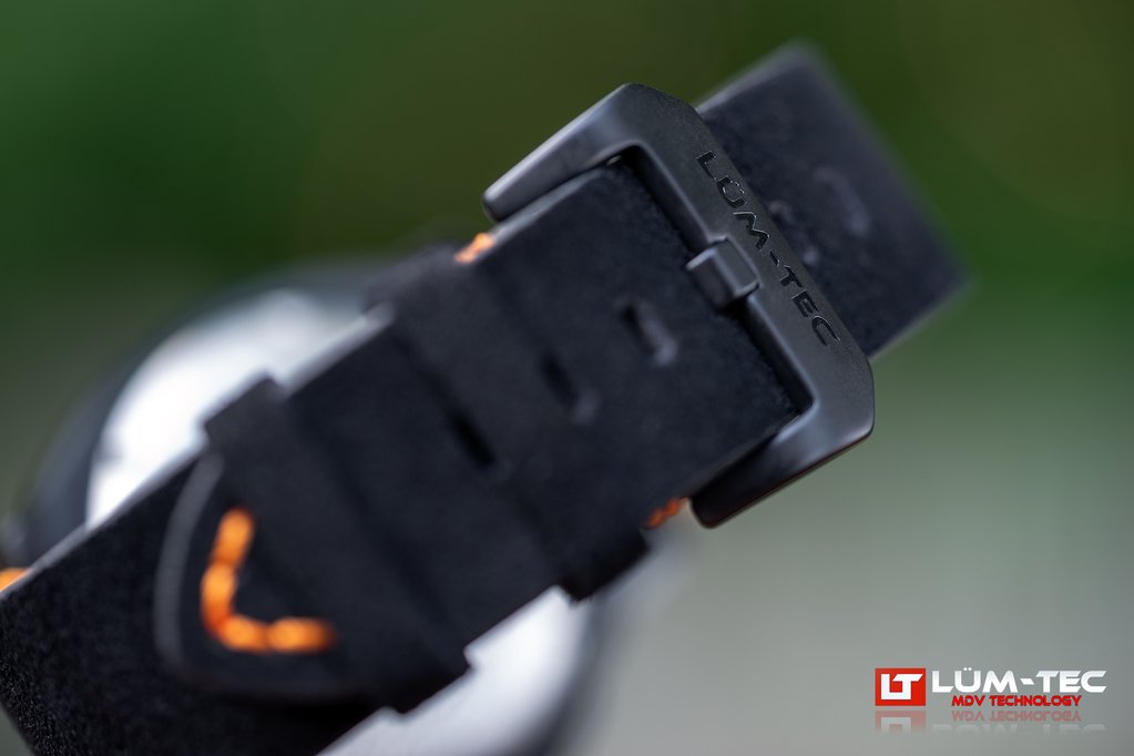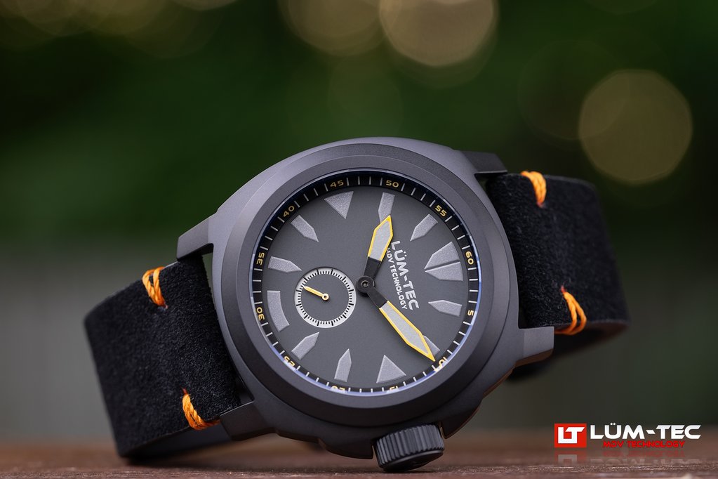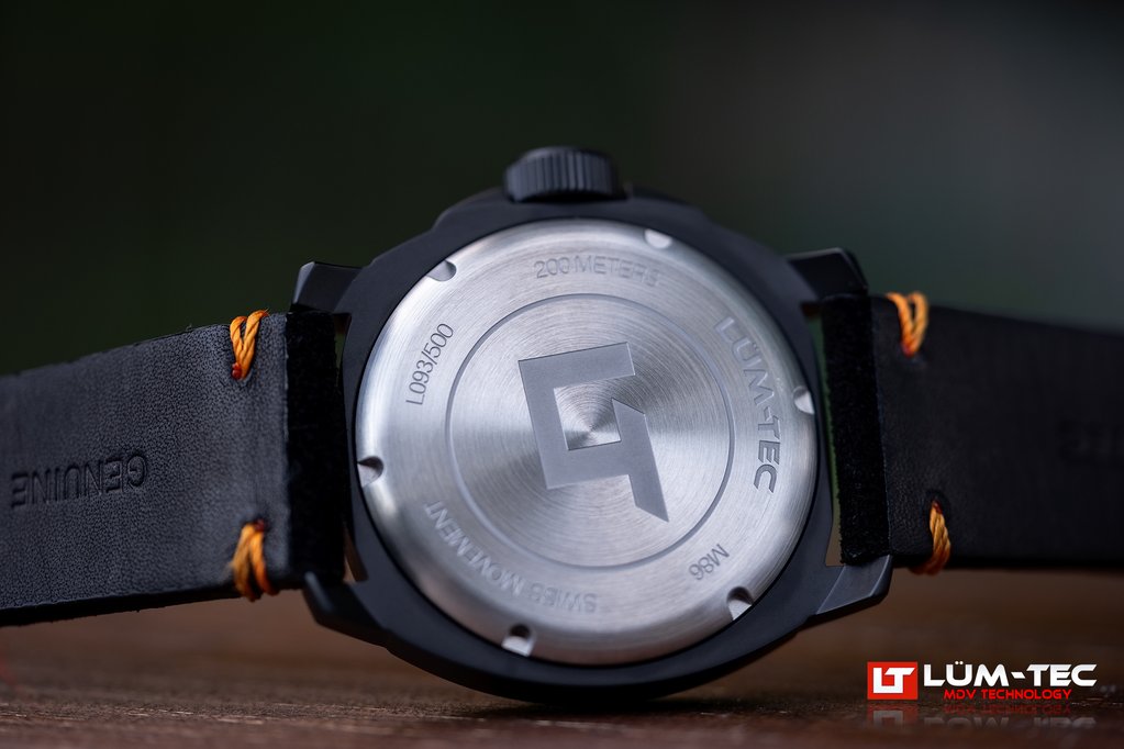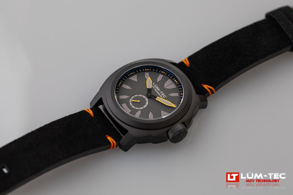 The Lum-Tec M86 Phantom watch features a beefy 44mm diameter titanium carbide PVD case mated with a thick leather strap with contrasting orange tie-offs at the lugs. The watch is powered by a Swiss Ronda 6004.D quartz movement with a small seconds sub-dial at 6:00 on the dial. The hands and hour markers are coated with MDV® Luminous Technology X1 grade multi-layer gray phantom lume (with orange highlights). The crystal is a curved sapphire with an anti-reflective (double-sided) coating that gives you a clear view of the time. The Lum-tec M86 Phantom is hand-assembled in Ohio and it is a limited edition of 500 worldwide. Also, in addition to the leather strap you will also receive a black rubber strap in the box. A small second dial placed at the 6:00 position offers a refreshing take on the men's 3-hand watch. The M86's MDV luminous technology is unrivaled for visibility in almost any lighting.- Assembled by hand in Ohio
