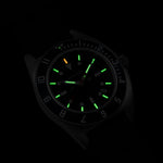 Self-contained tritium gas tubes on the hour markers, and minute/hour hands ensures constant visibility in low-light environments. Tritium tubes are self-illuminating, containing an isotope of hydrogen that won't dull down over time like photoluminescent paint, meaning the watch will remain fully legible at all hours.