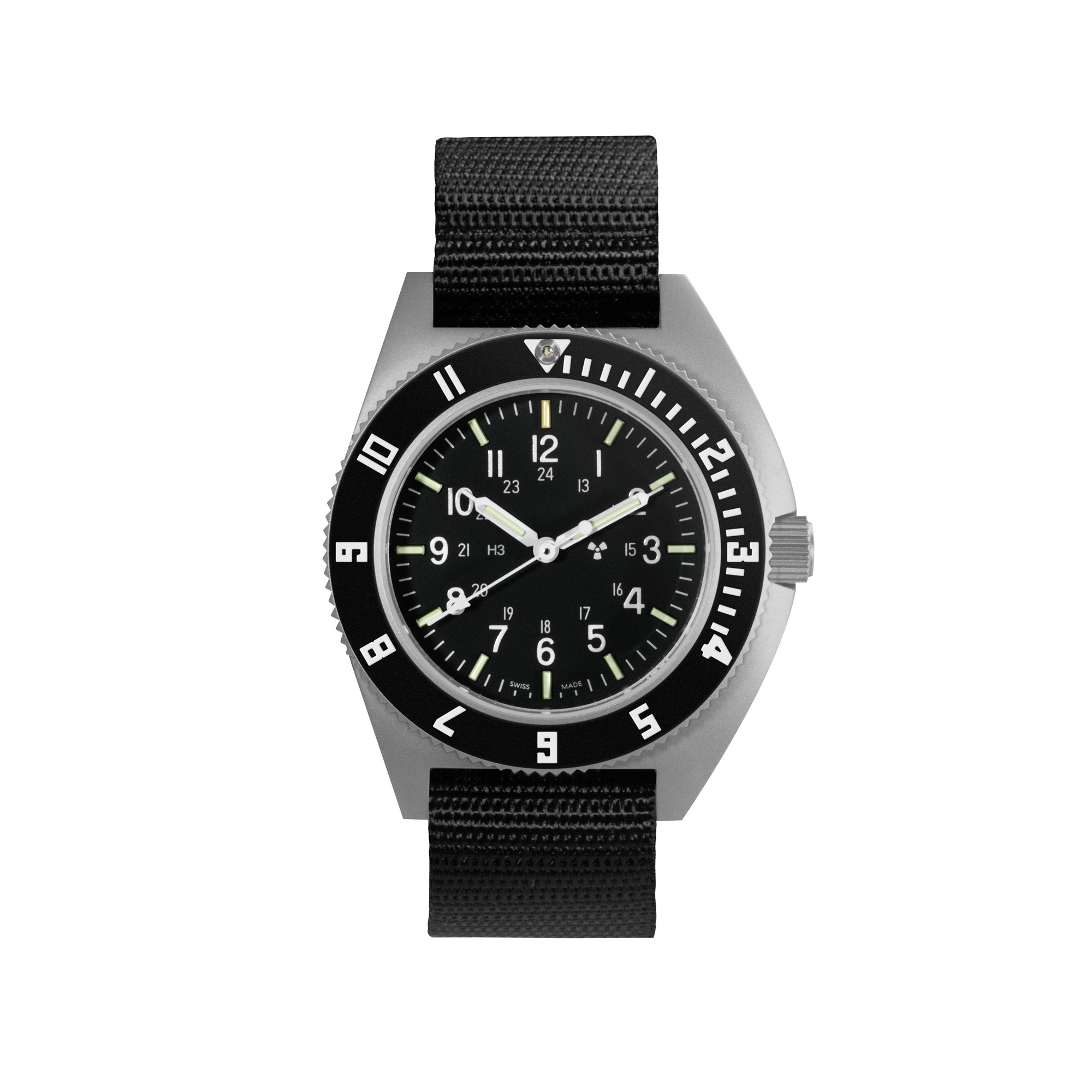 Self-contained tritium gas tubes on the hour markers, and full hand set ensuring constant visibility in low-light environments. Tritium tubes are self-illuminating, containing an isotope of hydrogen that won't dull down over time like photoluminescent paint, meaning the watch will remain fully legible at all hours.