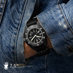 The unit features a high-quality Swiss made high precision Quartz Movement with Date feature. The watch is water resistant to 6 ATM (196 Ft) and is designed for maintaining accuracy at high altitude to 35,000 FT without compensating pressurization. The case is made of an extremely durable nylon/fiberglass composite material and has a 41mm case size which is 13mm thick. The rotating outer bezel provides marking for a second-time zone so that you can keep time in two time zones simultaneously. The stainless steel back has engraved full military markings including “Watch, Wrist: Navigators” and Nato Stock Number 6645-01-544-9475. The Marathon Navigator Date Watch is brand new and comes complete with matching nylon flight strap (watch can be worn on the wrist or over one’s flight jacket), original box and instructions. The Marathon Navigator Date watch comes with Marathon Watch Company's comprehensive 2-year warranty against manufacturing defects.
