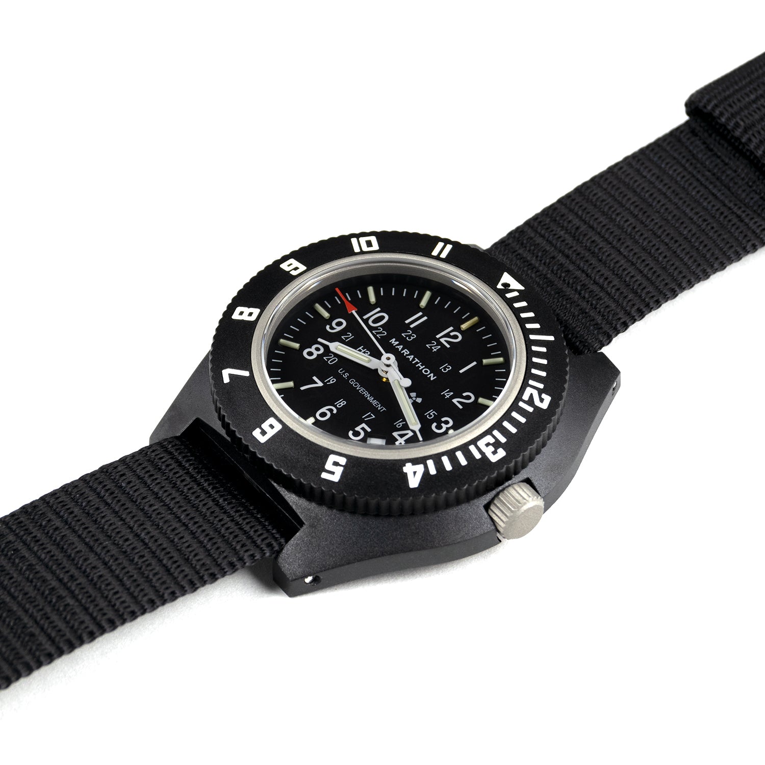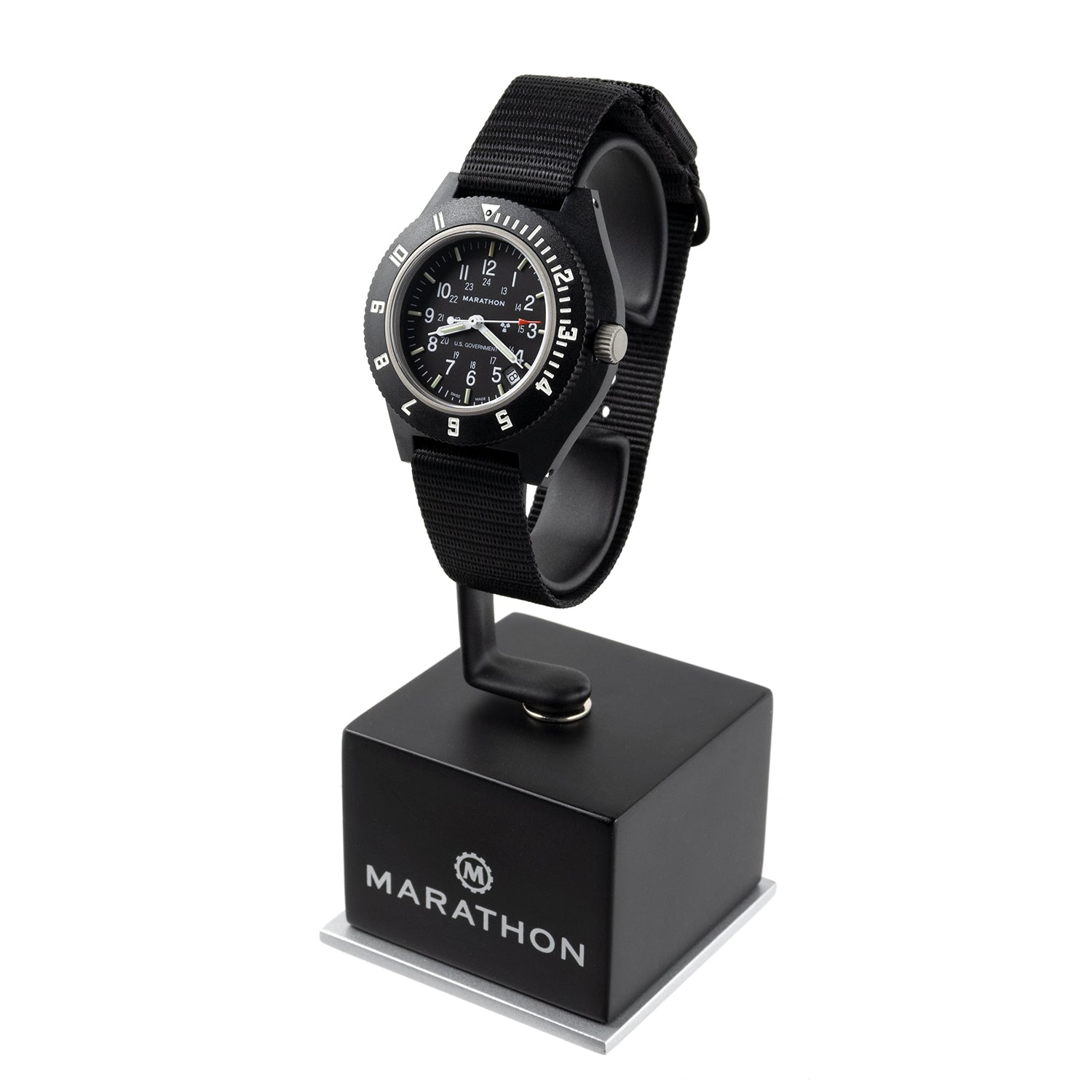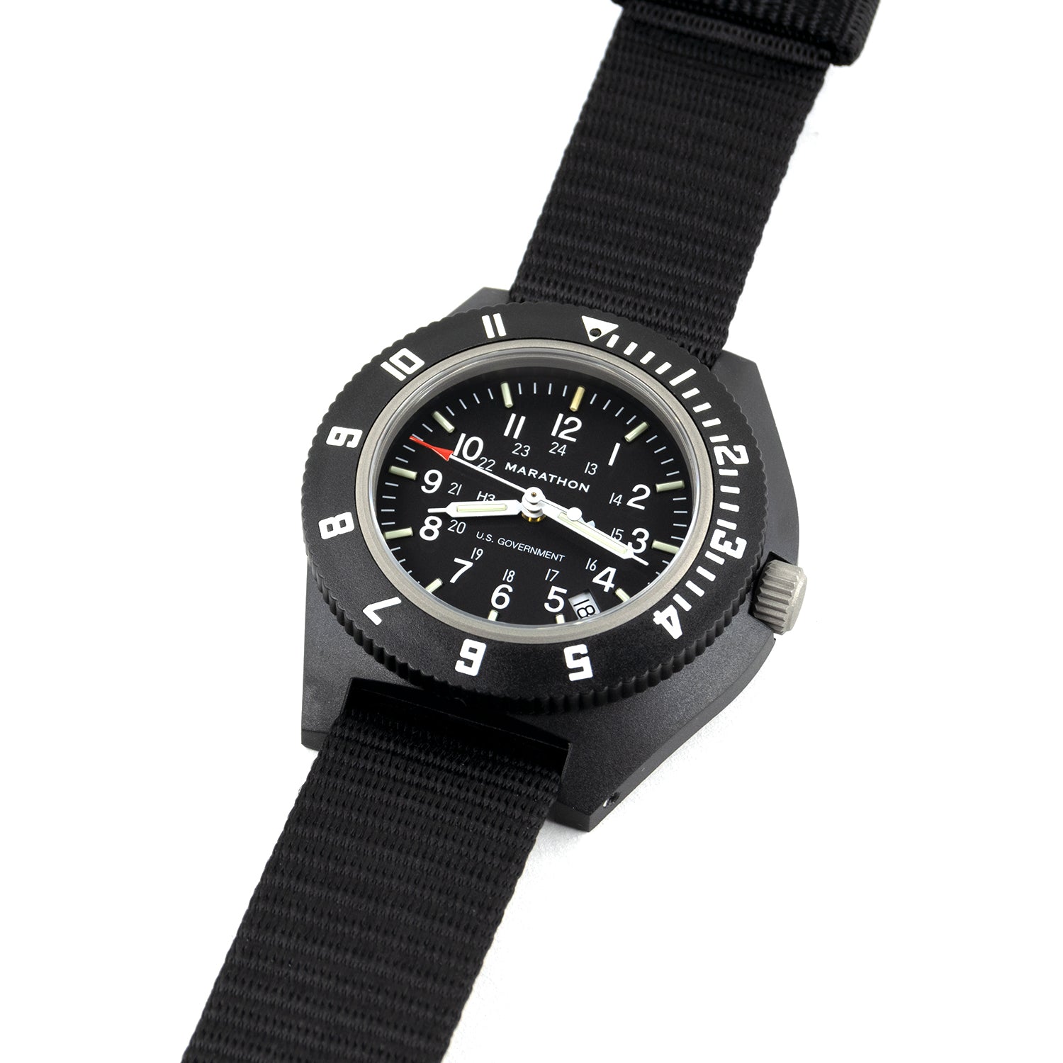 Tritium tubes are self-illuminating gas tubes which contain an isotope of hydrogen that glows 20 times brighter than an ordinary luminous watch. They will not dull over time like normal photoluminescent (glow in the dark) paint which requires an external light source to create a glow. The stainless steel back has engraved full military markings including “Watch, Wrist: Navigators” and Nato Stock Number 6645-01-544-9475. The Marathon Navigator Date Watch is brand new and comes complete with matching nylon flight strap (watch can be worn on the wrist or over one’s flight jacket), original box and instructions. The Marathon Navigator Date watch comes with Marathon Watch Company's comprehensive 2-year warranty against manufacturing defects.