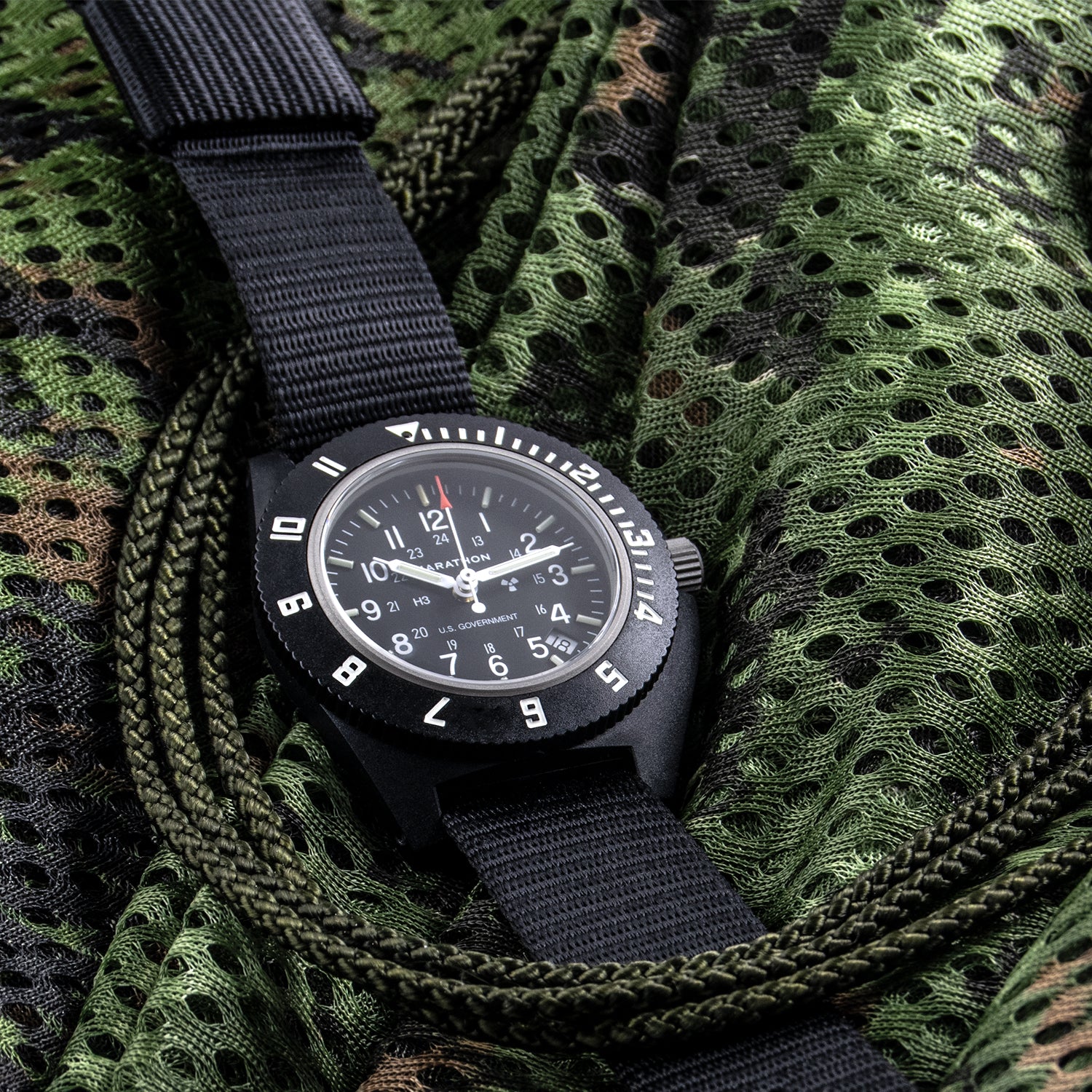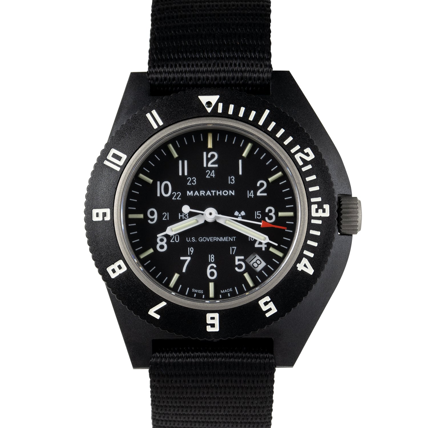 The unit features a high-quality Swiss made high precision Quartz Movement with Date feature. The watch is water resistant to 6 ATM (196 Ft) and is designed for maintaining accuracy at high altitude to 35,000 FT without compensating pressurization. The case is made of an extremely durable nylon/fiberglass composite material and has a 41mm case size which is 13mm thick. The rotating outer bezel provides marking for a second-time zone so that you can keep time in two time zones simultaneously. The dial is signed "Marathon" and features the radioactive symbol (Tritium isotope), with your choice of 3 additional government markings.