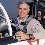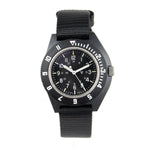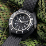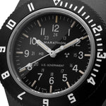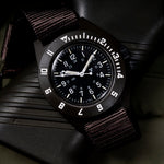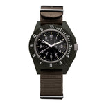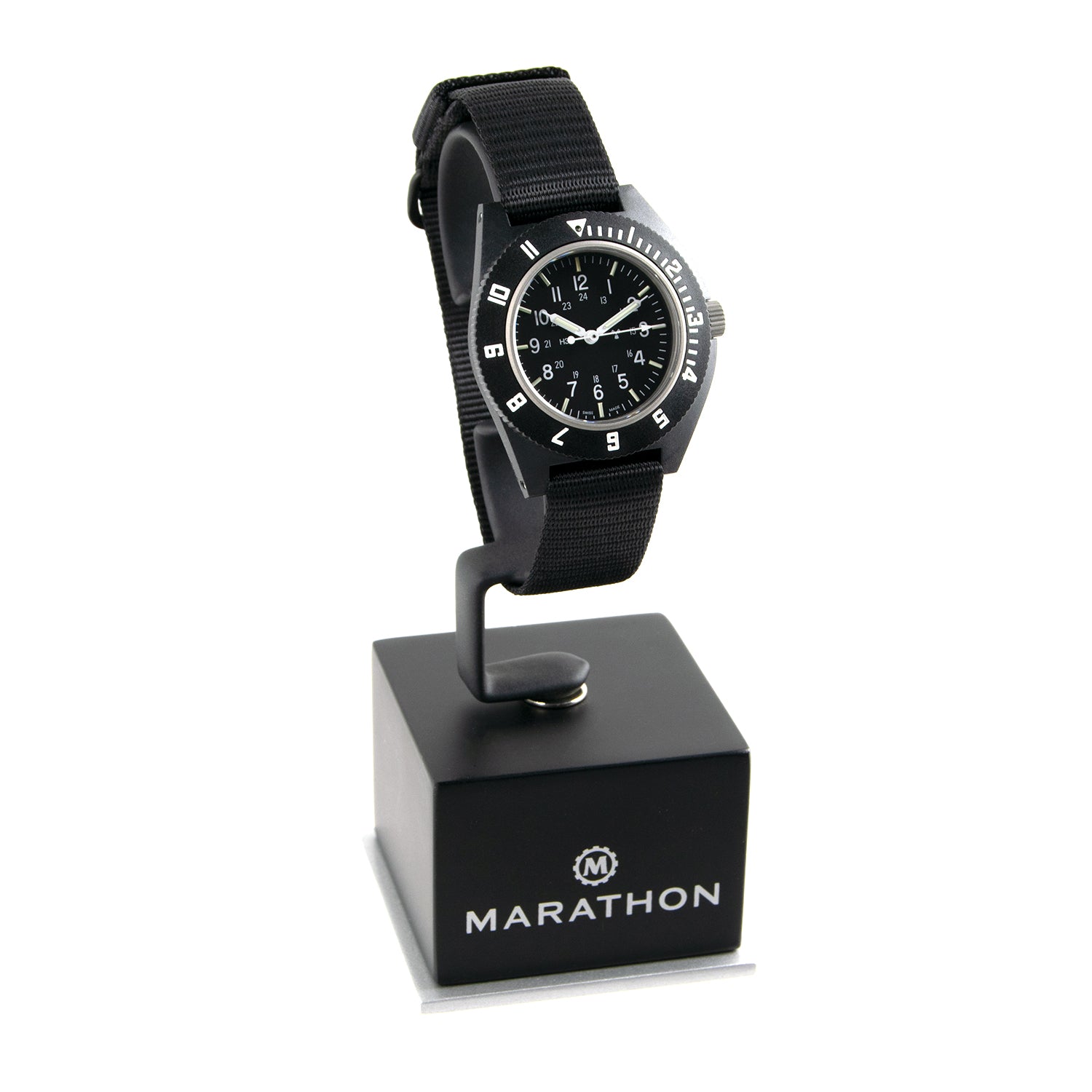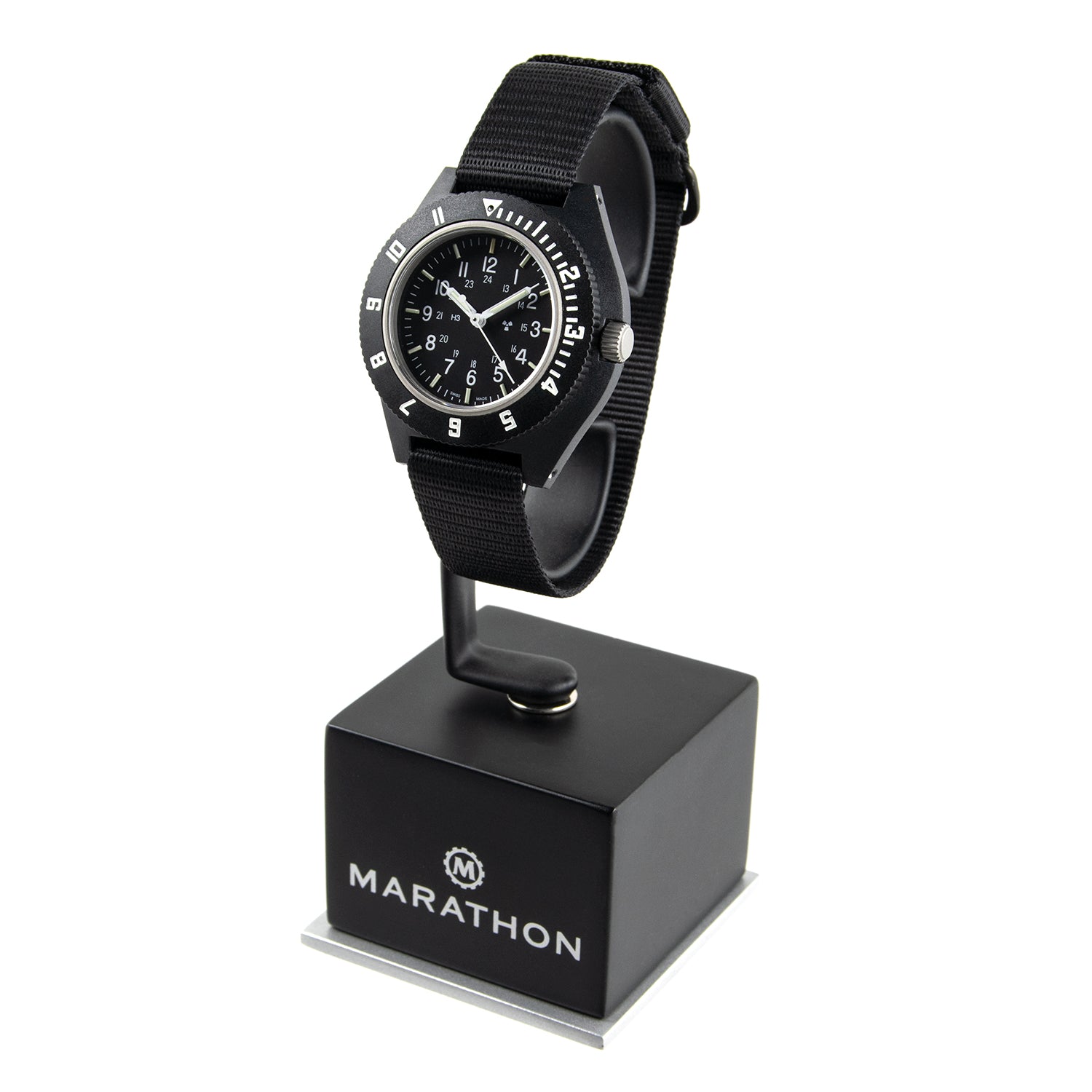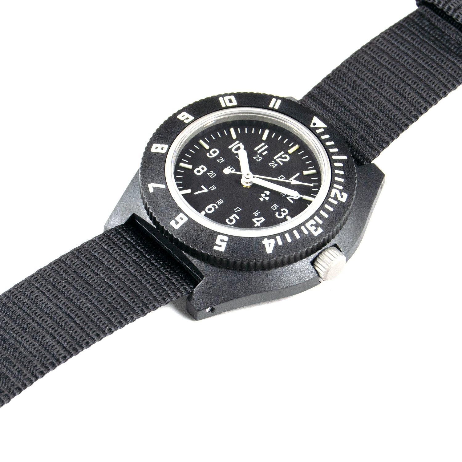 The Marathon Military Navigator Pilot watch was first developed in 1986. It was made as a request by Kelley Air Force Base for a watch which could be used in situations a pilot or parachutist would encounter. Marathon fulfilled this request with the Navigator Pilots Quartz. Made from a special fibershell case that is water resistant to 6 ATM, sweat and shock resistant, as well as lightweight. Included with the Military Navigator Pilots Quartz is a 20-millimeter width nylon strap made under MIL-S-46383B, Type III. The watch uses an acrylic crystal resistant to rapid changes in pressure that would otherwise cause a watch’s crystal to shatter.