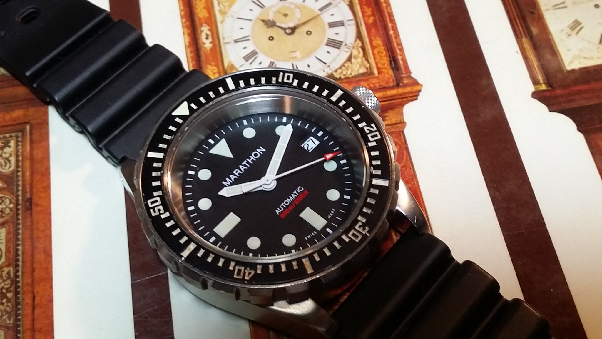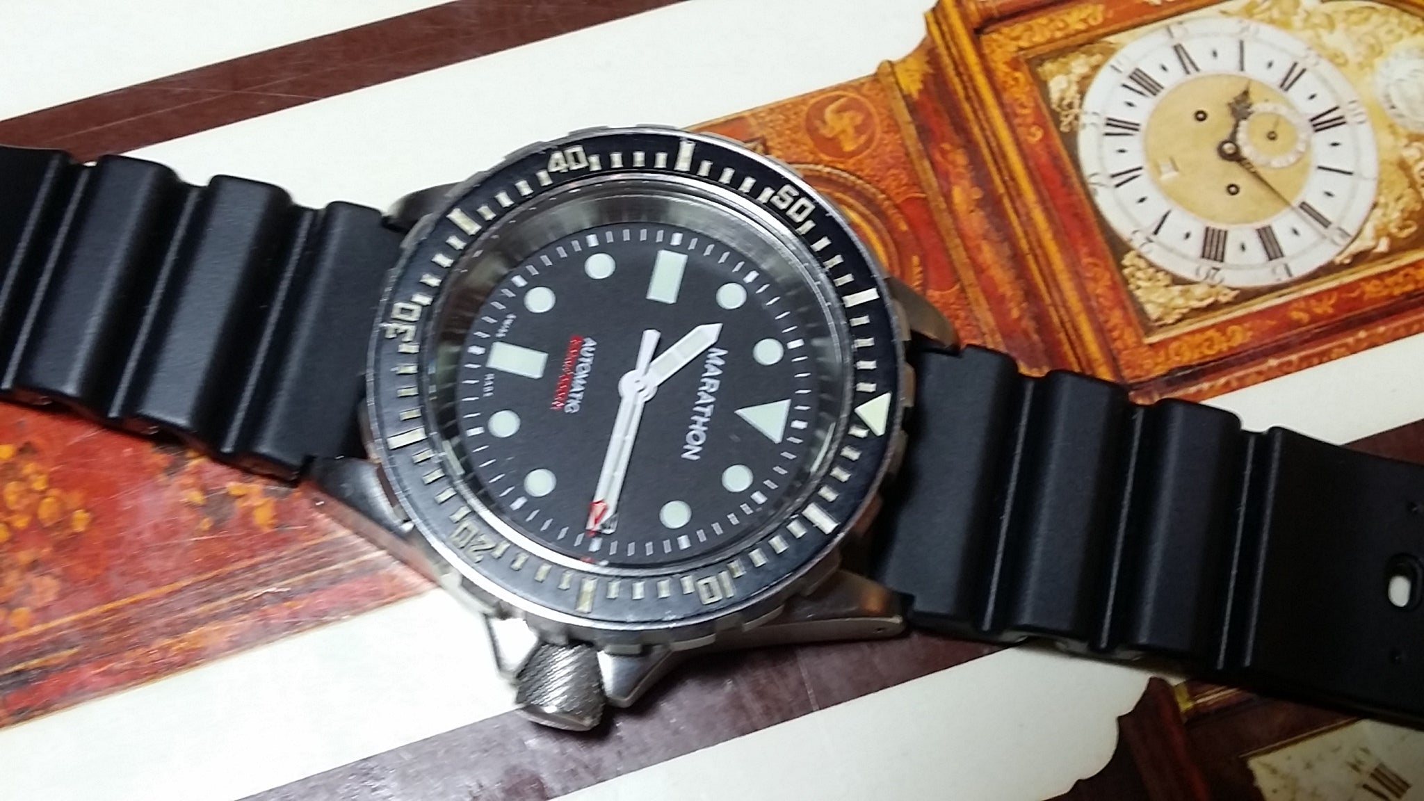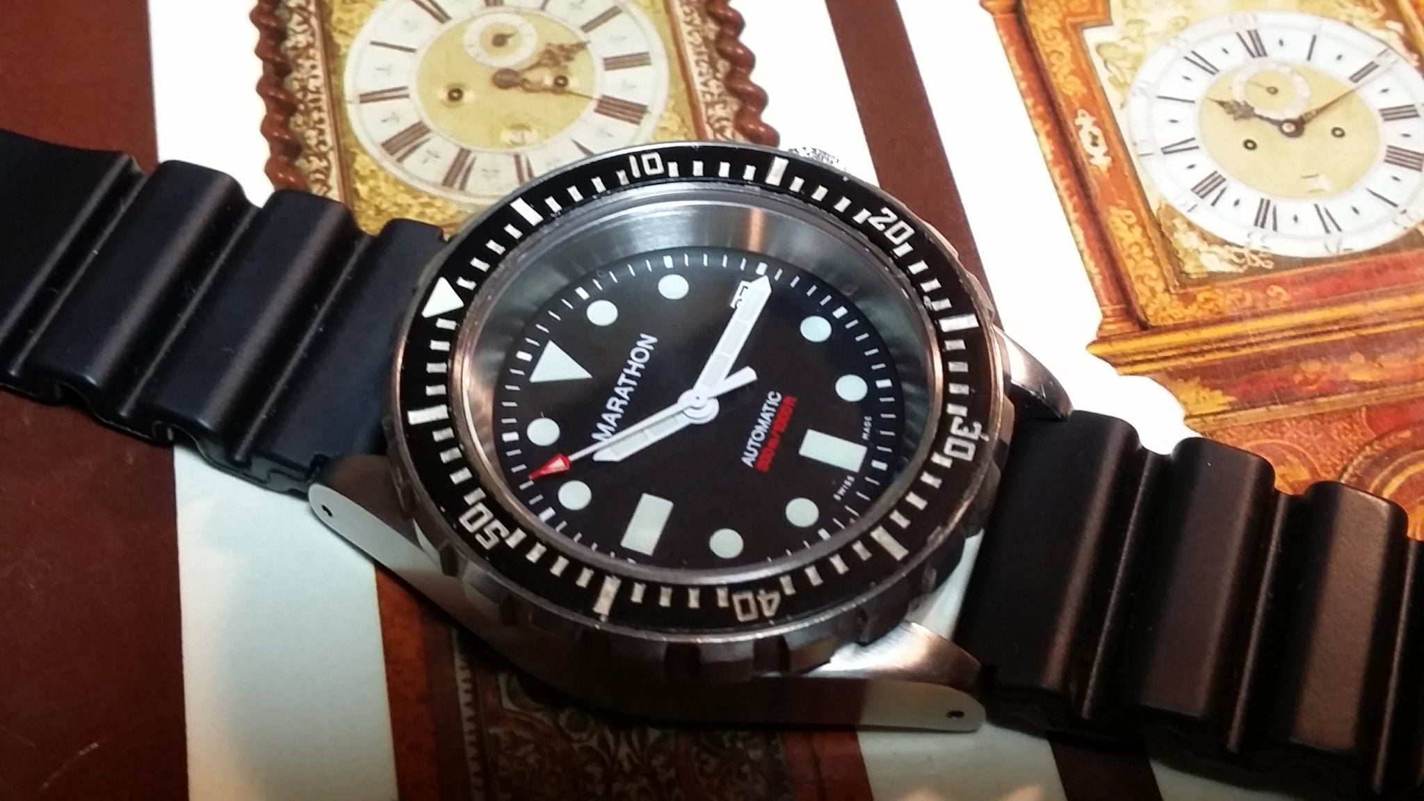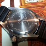 The steel back has full military markings. Screw down crown is deep knurled. The total weight of the watch head is 93.1 grams. Supplied with black 20mm rubber strap (later addition). The watch features an ETA 2824-A2 engraved with Marathon Watch Co. and an improved 120 click uni-directional rotating bezel.