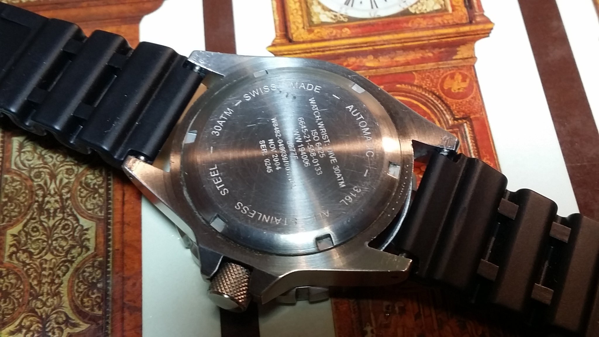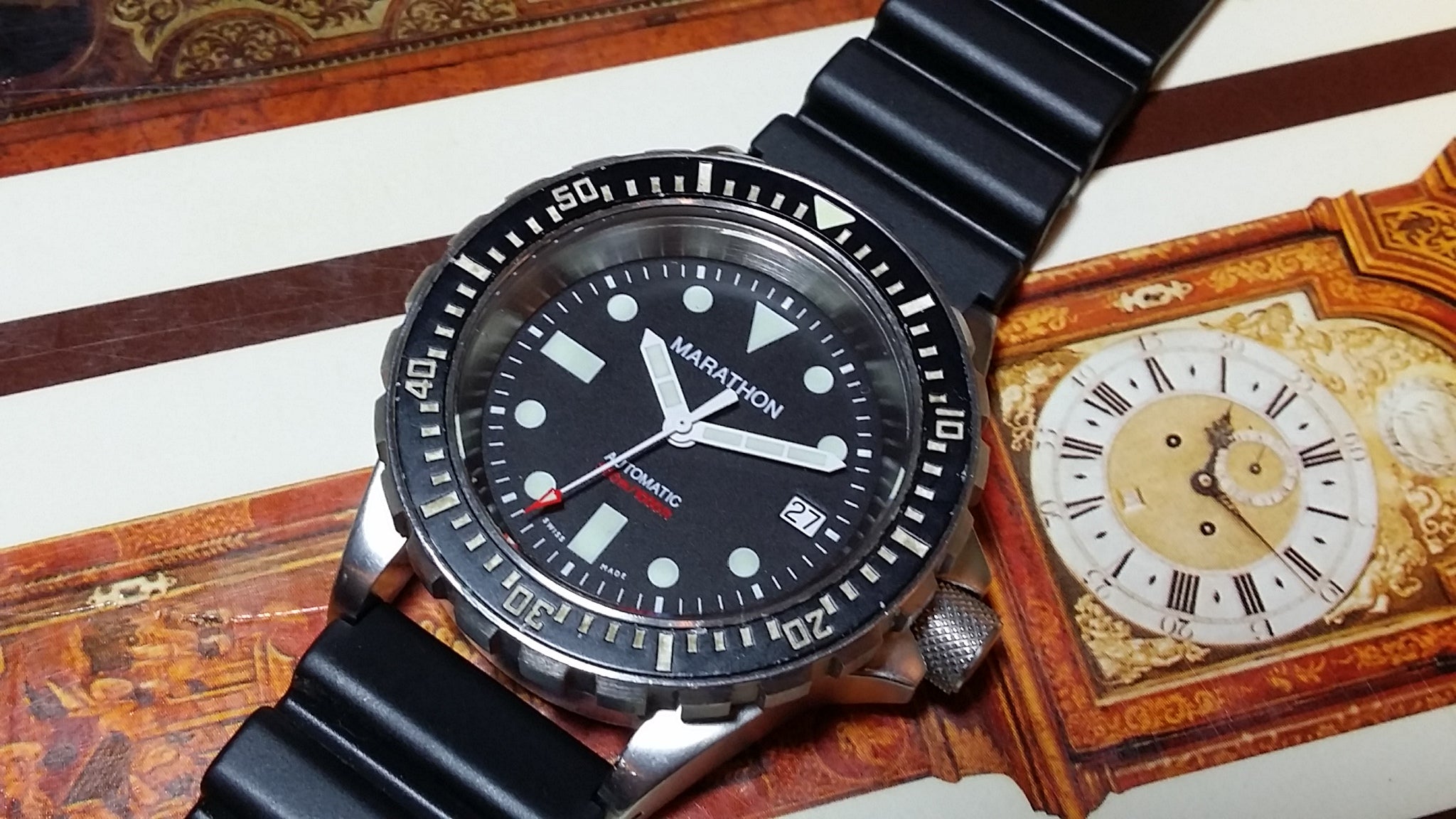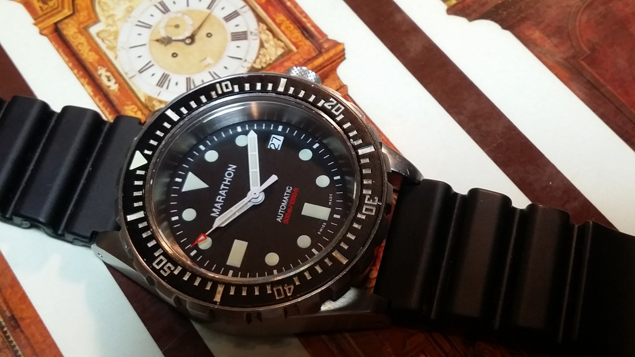 The steel back has full military markings. Screw down crown is deep knurled. The total weight of the watch head is 93.1 grams. Supplied with black 20mm rubber strap (later addition). The watch features an ETA 2824-A2 engraved with Marathon Watch Co. and an improved 120 click uni-directional rotating bezel.