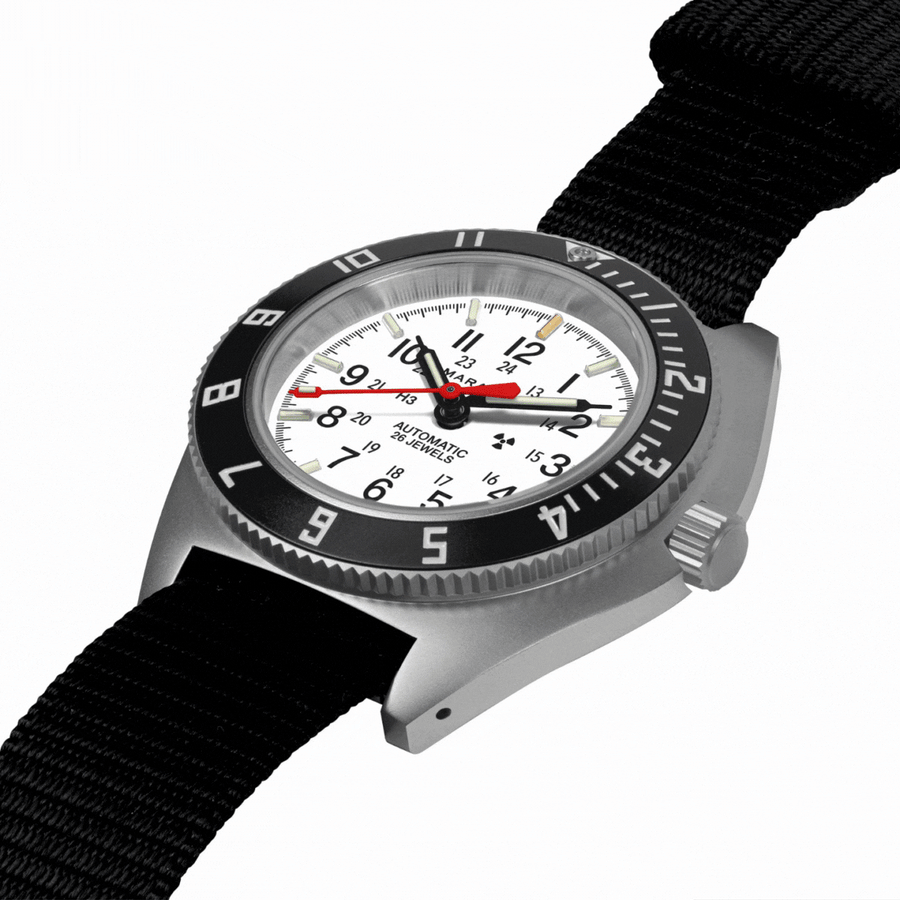 Self-contained tritium gas tubes on the hour markers, and full hand set ensuring constant visibility in low-light environments. Tritium tubes are self-illuminating, containing an isotope of hydrogen that won't dull down over time like photoluminescent paint, meaning the watch will remain fully legible at all hours.