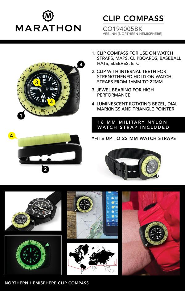 Product Specification Brand: Marathon Color: Black Do not confuse this with less expensive poorly made models available elsewhere.Clip-On Wrist Compass w/ Glow in The Dark Bezel SKU: CO194005-BK