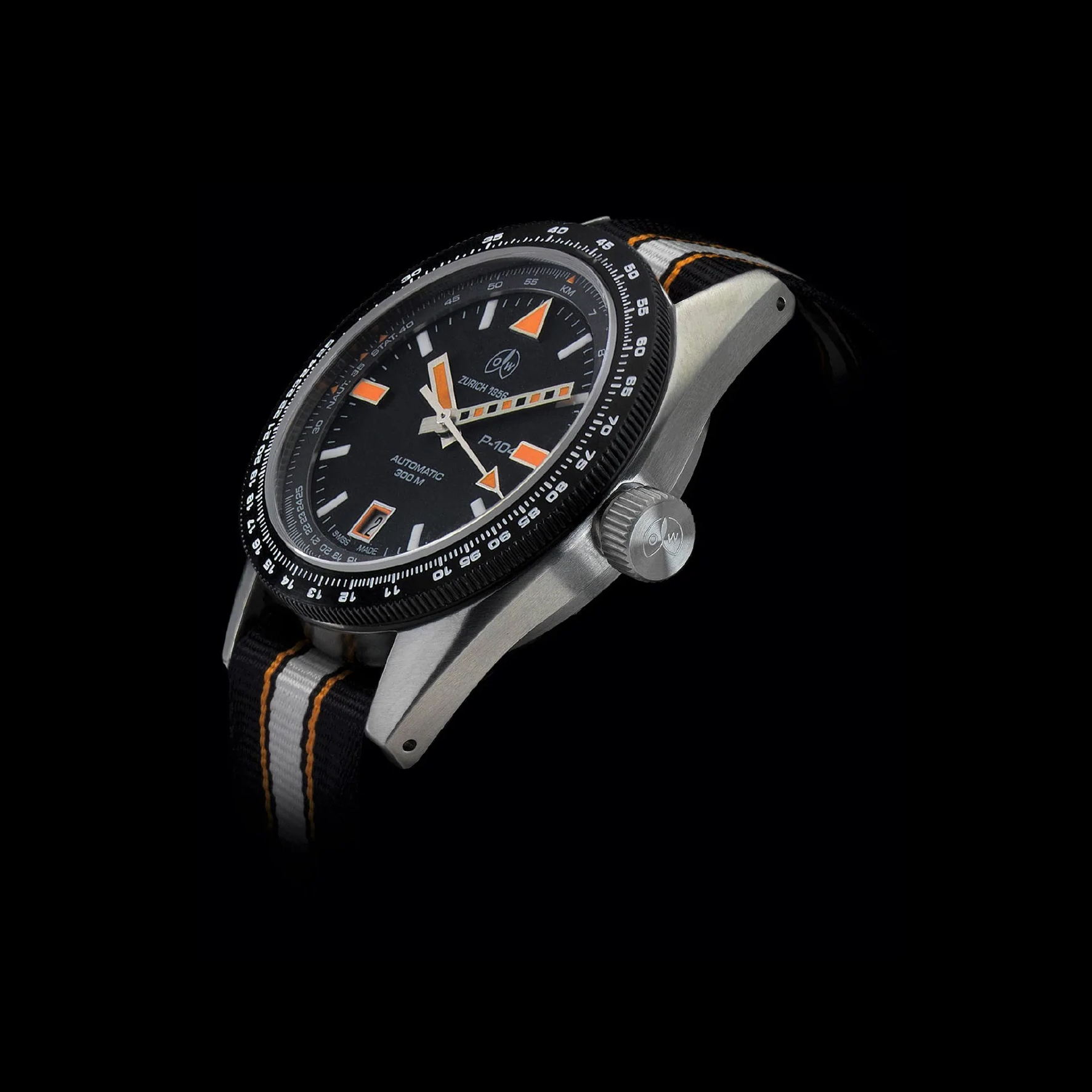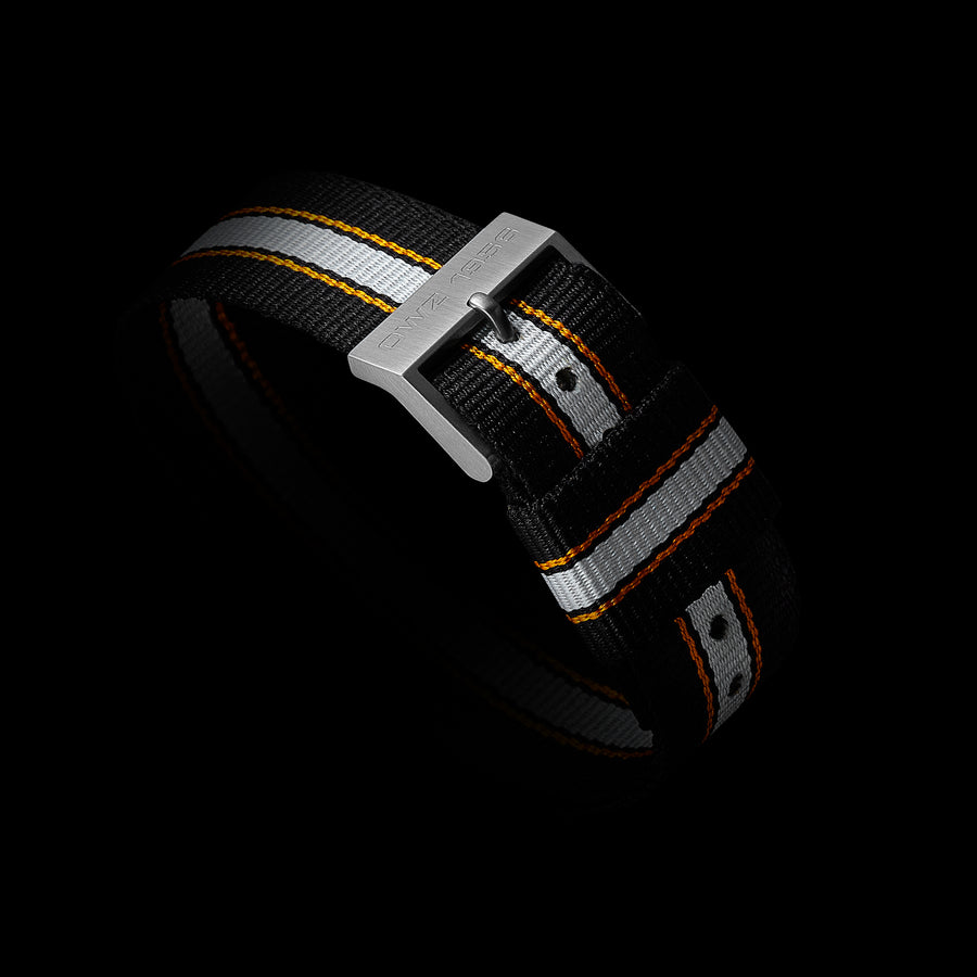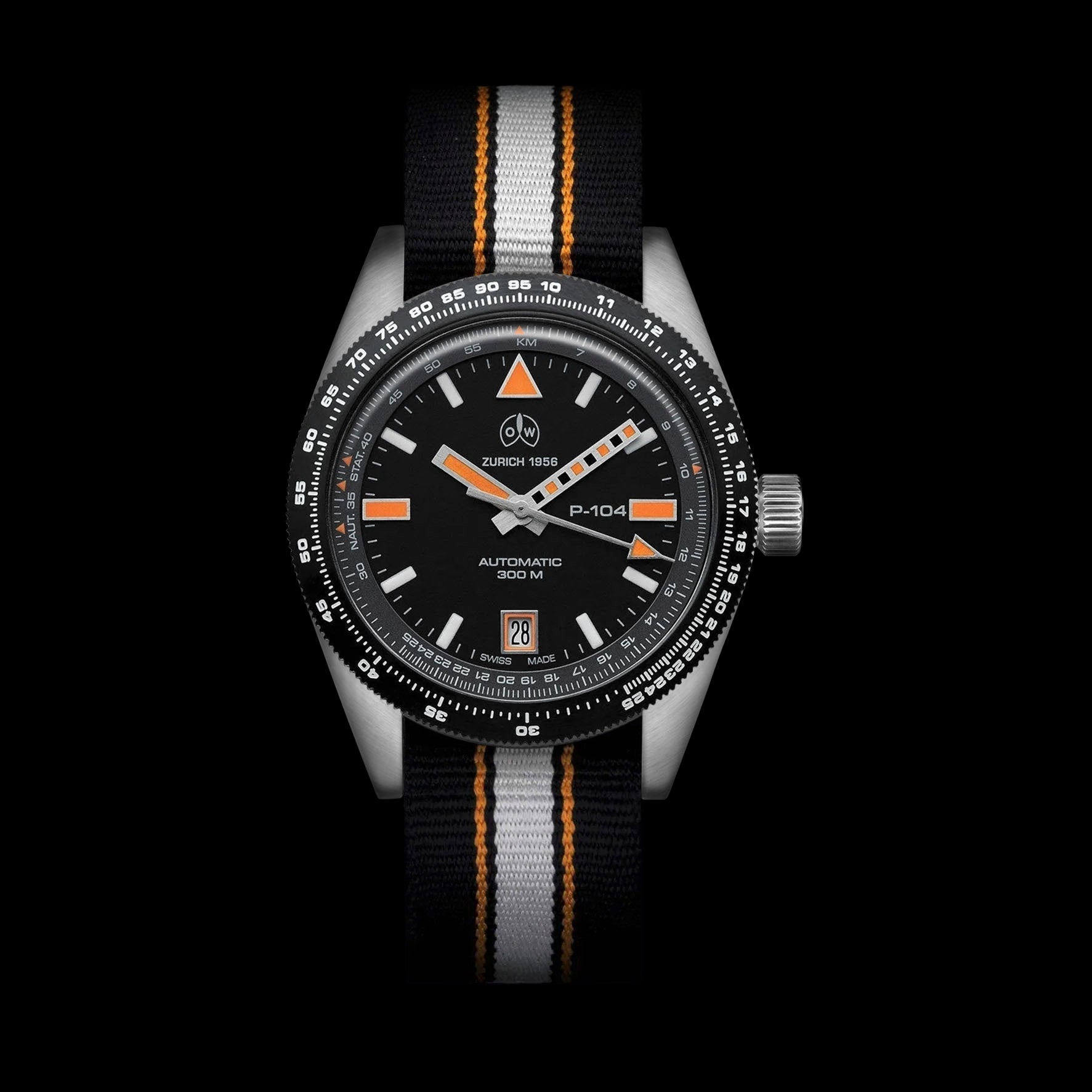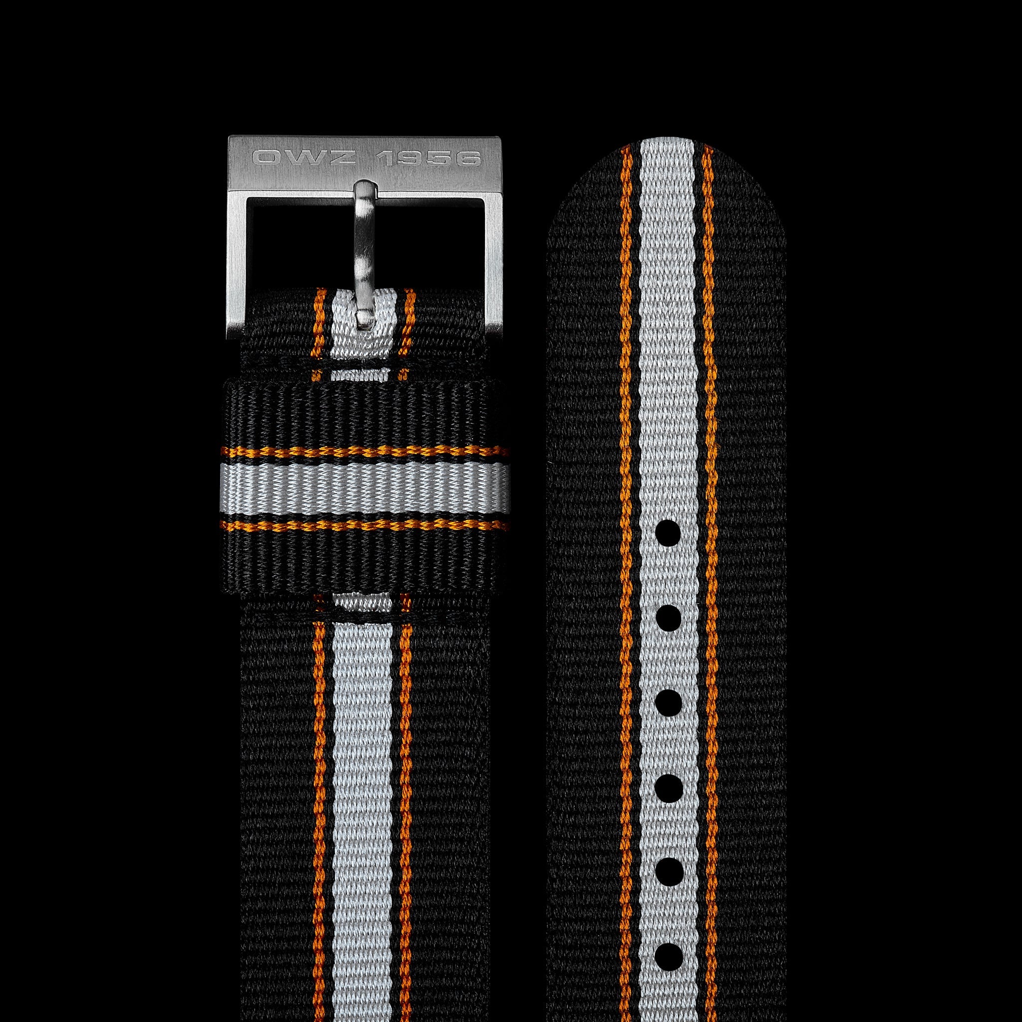 The P-104 is presented on a premium-quality, highly durable, and water-resistant RAF regimental-style nylon band, hand-finished with a brushed stainless steel thorn buckle, signed ‘OWZ 1956’.
