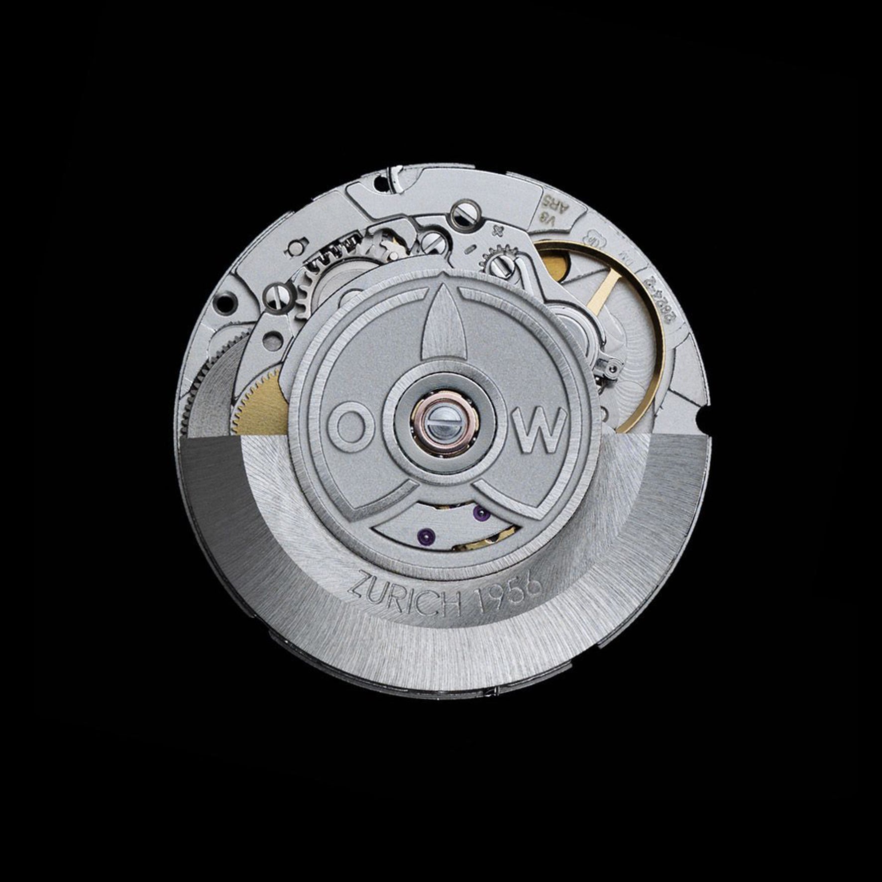 Its robust mechanical movement ETA 2824-2 OW3, adjusted in five positions, makes the P-104 a reliable navigation tool for high-flying pilots. The movement’s main plate is engraved with ‘Ollech & Wajs Zurich 1956’ and fitted with their machined rotor, bearing the famous OW propellor monogram.