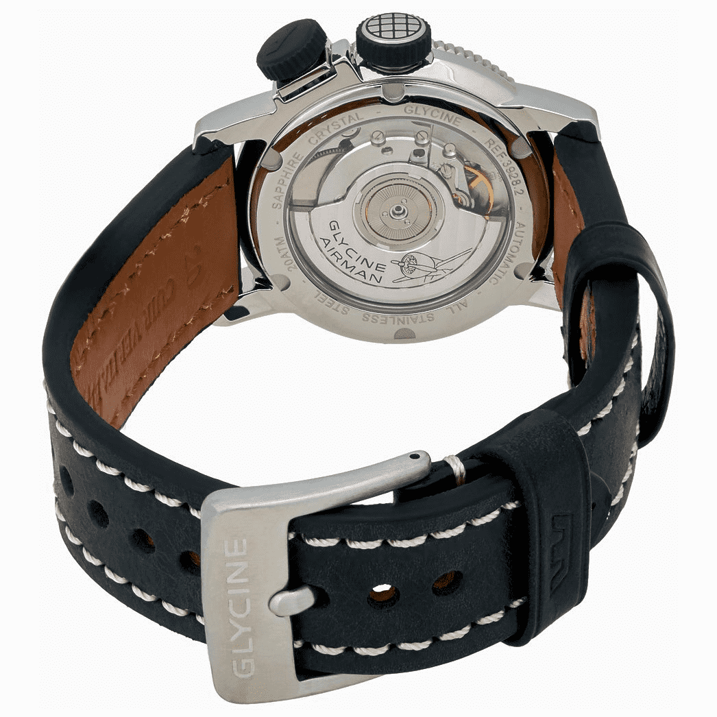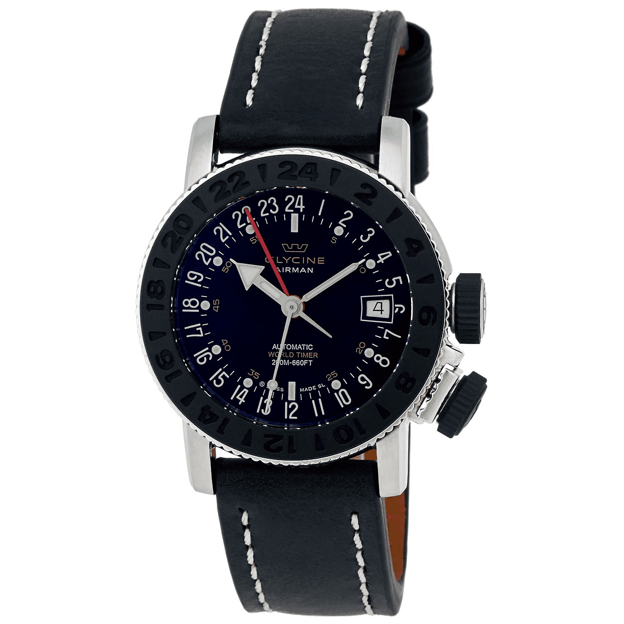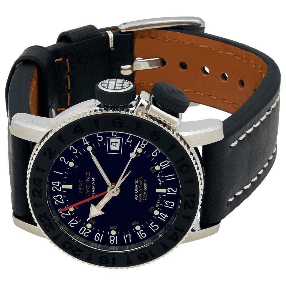 This Glycine Airman Auto GMT Worldtimer Watch, Model #3928.191 LB9B, is an impressive watch with its elegant, modern and charming design! This Swiss made watch is presented in a brushed & polished stainless steel case, black genuine calfskin leather strap, steel buckle engraved Glycine, Black dial, Silvertone & luminous hand indicators, luminous hour markers, Date display at the 3 o'clock position, GMT - 4 hands & three time zones. The third time zone is set on the rotating bezel, positioned by a spacer system at 4h with a hatched crown (design from the early 50's). The watch features a rubberized bezel and crowns. A Superior double Anti-reflective Scratch Resistant Sapphire Crystal protects the dial. There is a sapphire display case back to view the Swiss Automatic movement that has a rhodium-coated oscillating weight on ball bearing, decorated with a "Côtes de Genève" pattern and bears the engraving of an airplane. Movement details are 28'800 vibrations per hour, 21 jewels, 42-hour power reserve, Size: 11 1/2", GL 293 caliber which is a special ETA caliber made for Glycine. The movement is powered by a special Glycine decorated rotor. Water-resistant to 200 meters/660 feet. This Glycine Airman Auto GMT Worldtimer Watch is BRAND NEW and comes in its original packaging with the warranty card and papers.