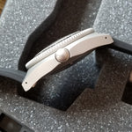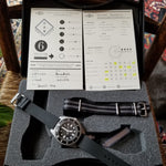 This watch came from a prominent watch collector living on the west coast and his care and attention to collectibility is really apparent.  The MKII PARADIVE GEN 3 is currently sold out at MKII with no date when/if there will be another batch. As a result, the price on these keeps creeping upwards. It's easy to see why because this is among the ultimate tool watches, a military diver that was born as an homage to the now-cult status Benrus Type I military watch. MKII has always done an exceptional job with their interpretations of military watches, and owner Bill Yao's attention to detail and build quality is legendary. Great lume, great size, classic looks, and the acrylic GMT bezel (with lume) is really nice detail. We sell watches frequently as my collection ebbs and flows. I'm not sure I'll have another Paradive.  The MKII PARADIVE GEN 3 includes the original natuaral rubber strap and a new UK-NATO straps of the James Bond type. These straps are high quality.  Also included is the original carry case, production and warranty (now expired) papers as well as a strap changing tool, 2 sets of standard, and one set of spare "fat" 20mm spring bars.    A really nice example seldom seen as originally owned by a meticulous west coast collector!