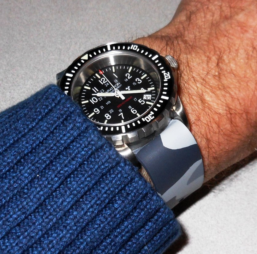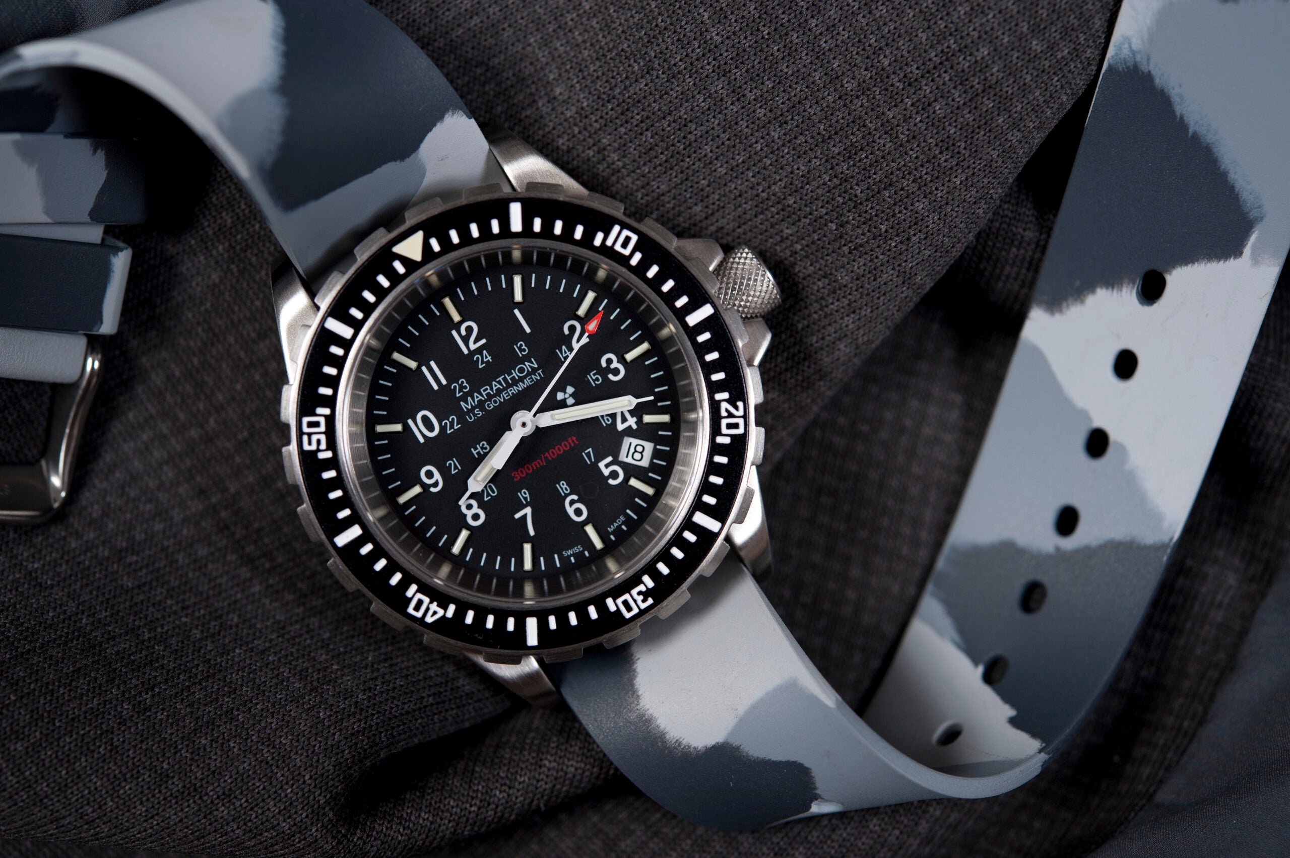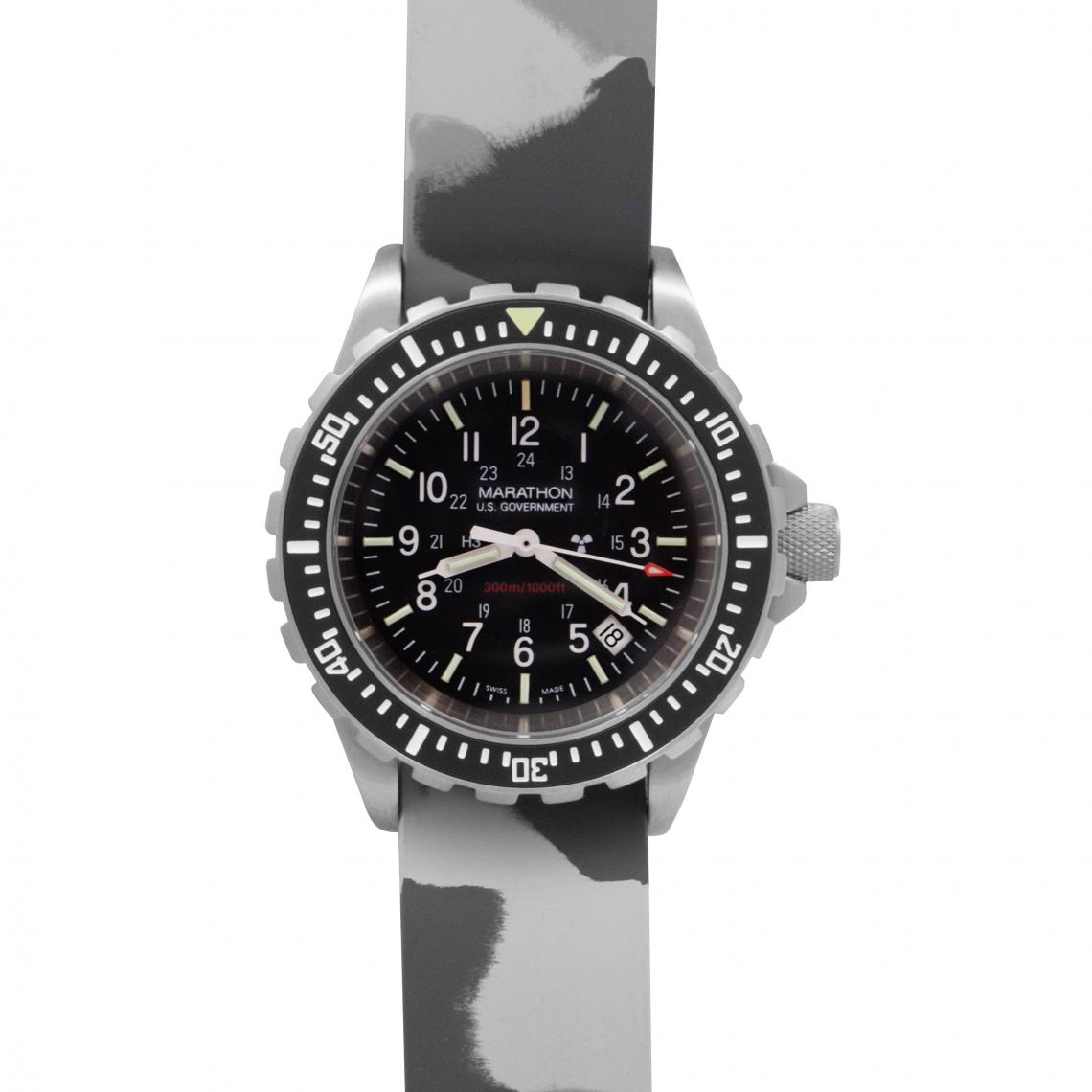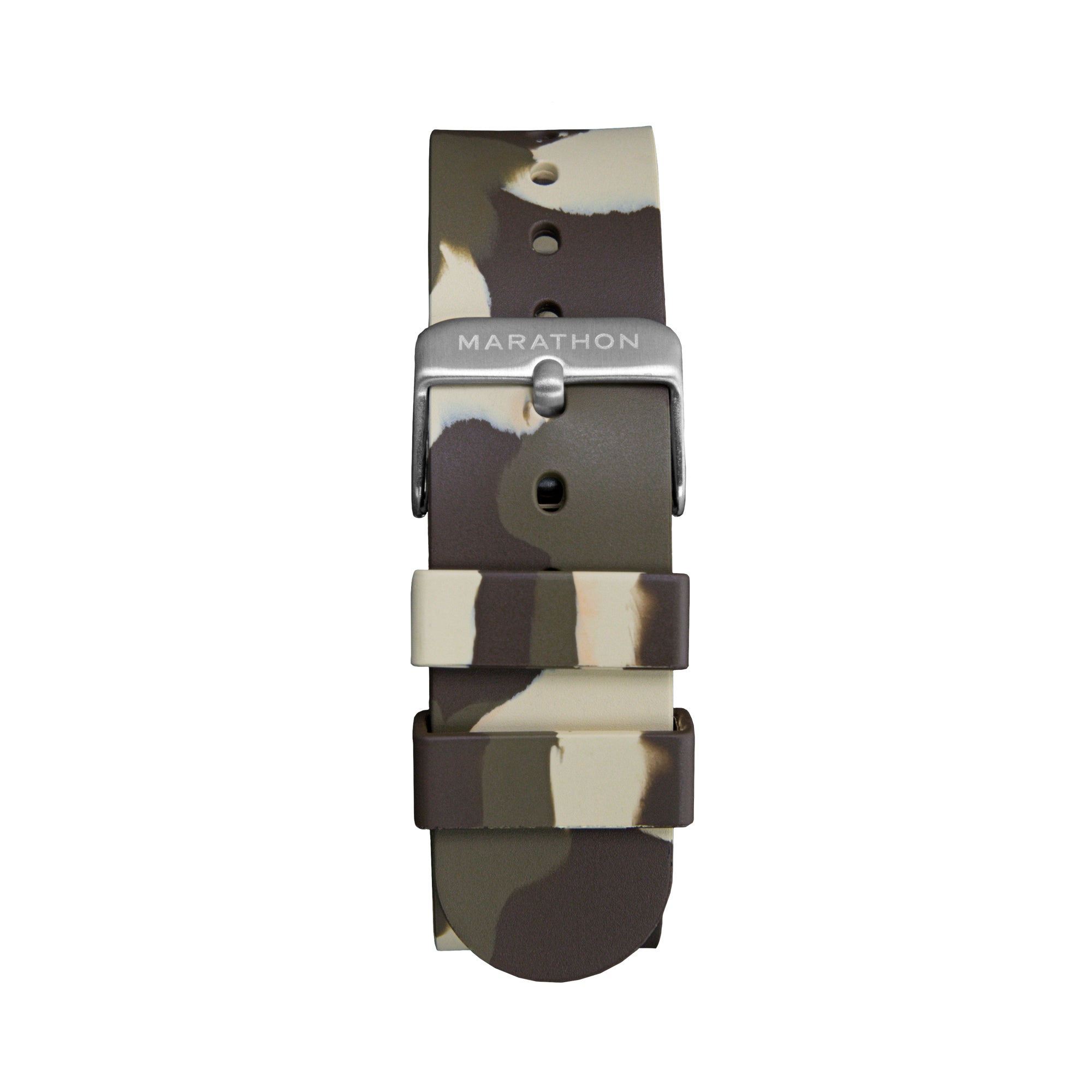 MARATHON DIVE WATCH BAND, RUBBER STRAP in Camouflage Grey, Camouflage Blue, Camouflage Green or Camouflage Brown These straps are genuine vulcanized rubber hand made in Italy. The one piece design has 2 keepers, to keep your watch or dive instrument secure and a 316L Stainless Steel Buckle. This stylish strap is easy to install and very comfortable. This wrist watch band or strap is 20mm (3/4 inch) wide and and comes with a 316L Stainless Steel Buckle. It is designed to be used on Marathon's Diver's Watches #WW194006 Diver's Watch-Automatic Winding (GSAR) or #WW194007 Diver's Watch - Quartz (TSAR). Fits any wristwatch with 20mm lug. Keep your watch out of the hands of Neptune with this one piece secure design!
