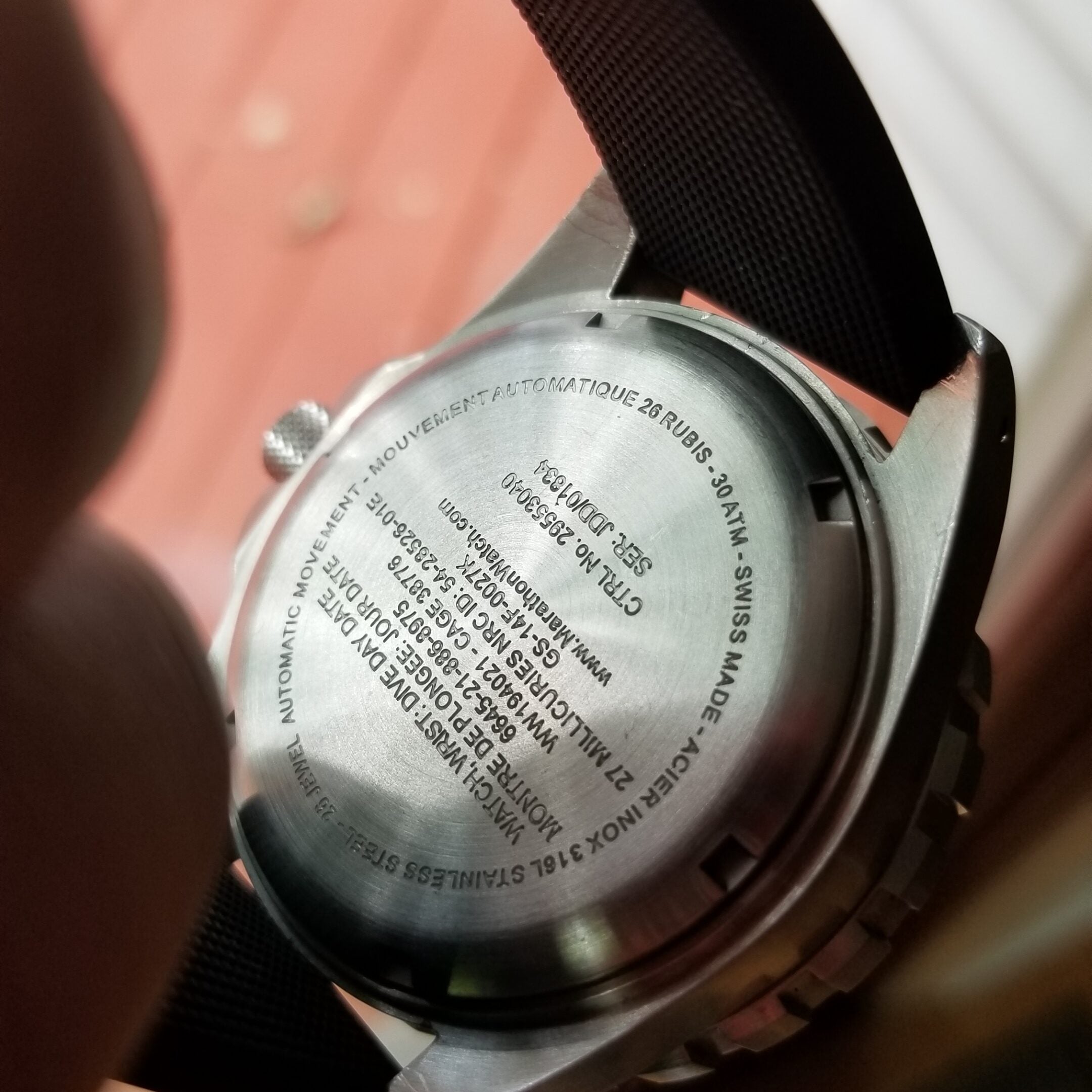 The Marathon TSAR is a high-quality quartz watch in a steel case is rated for 1000-foot submersion ( 30 ATM – 300 meters). Made from 316L surgical grade stainless steel, the Marathon TSAR is a purpose-built watch that will not let you down no matter what adventure you may take. It is available with a US Government signed dial or without government markings on the dial. The steel back has full military markings on both versions. The standard model is supplied with a black Swiss-made 20mm military natural rubber strap.